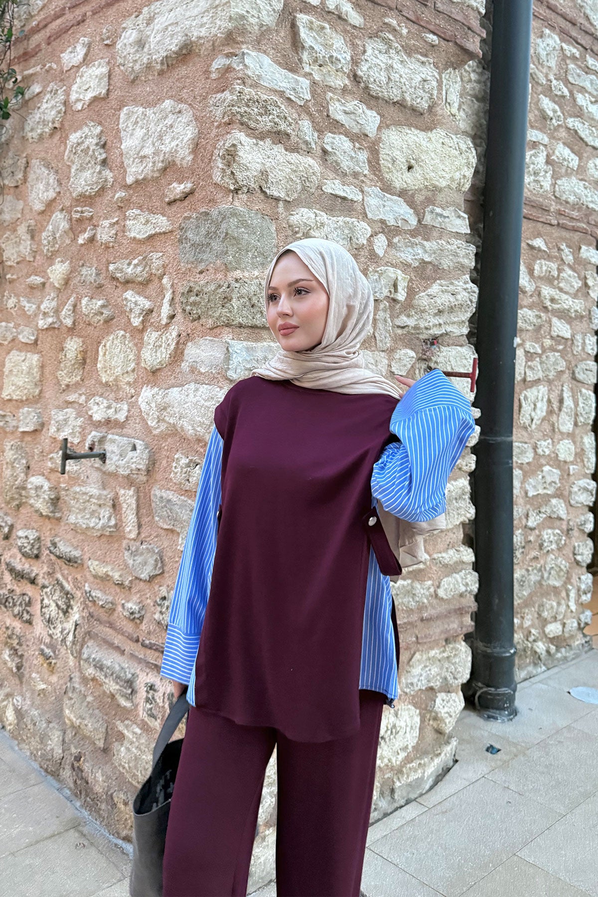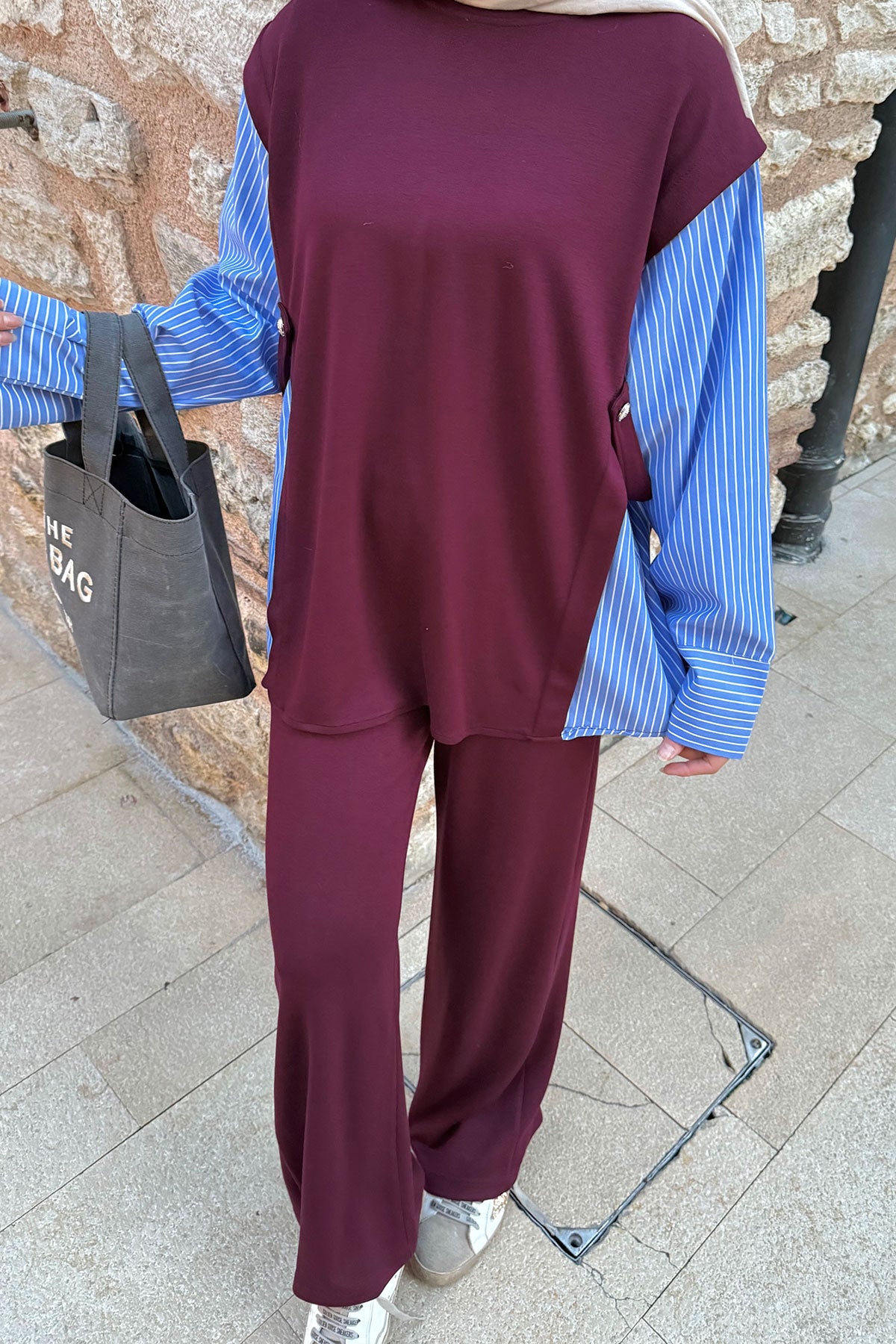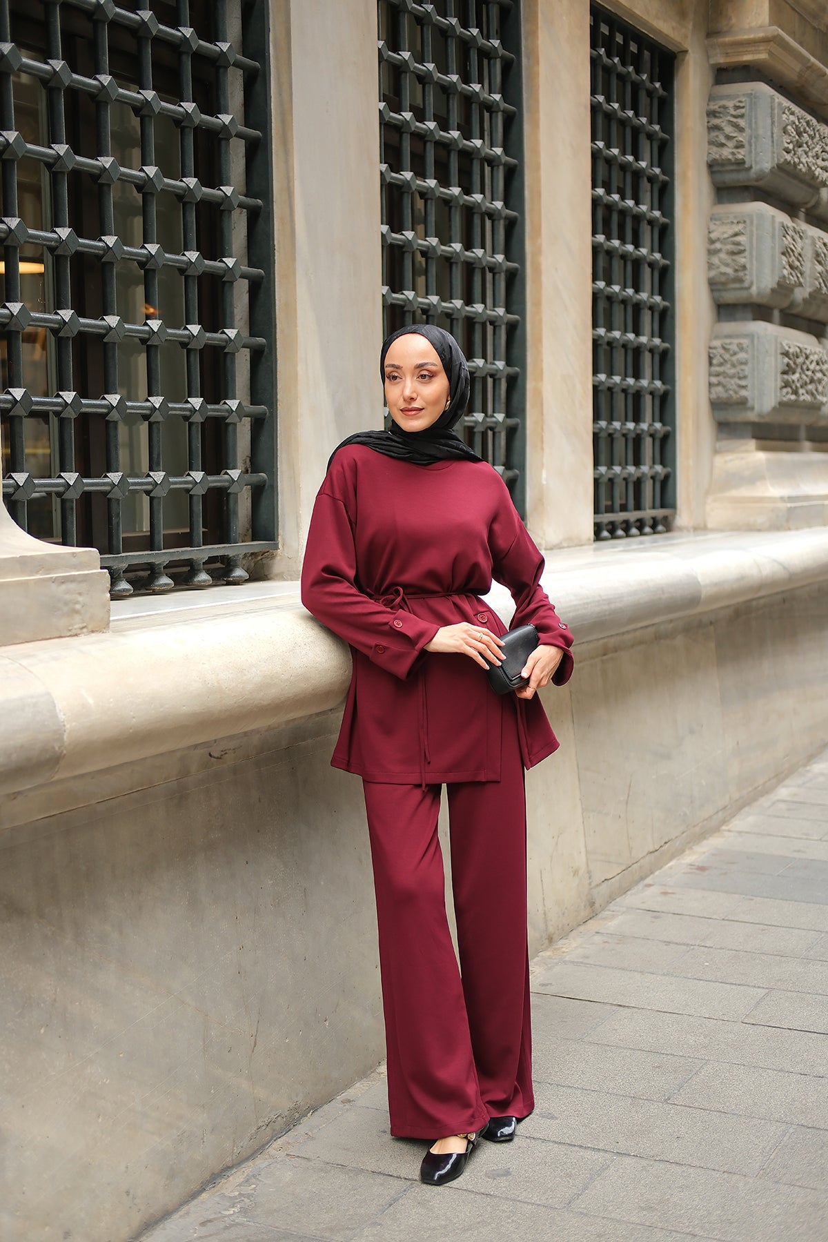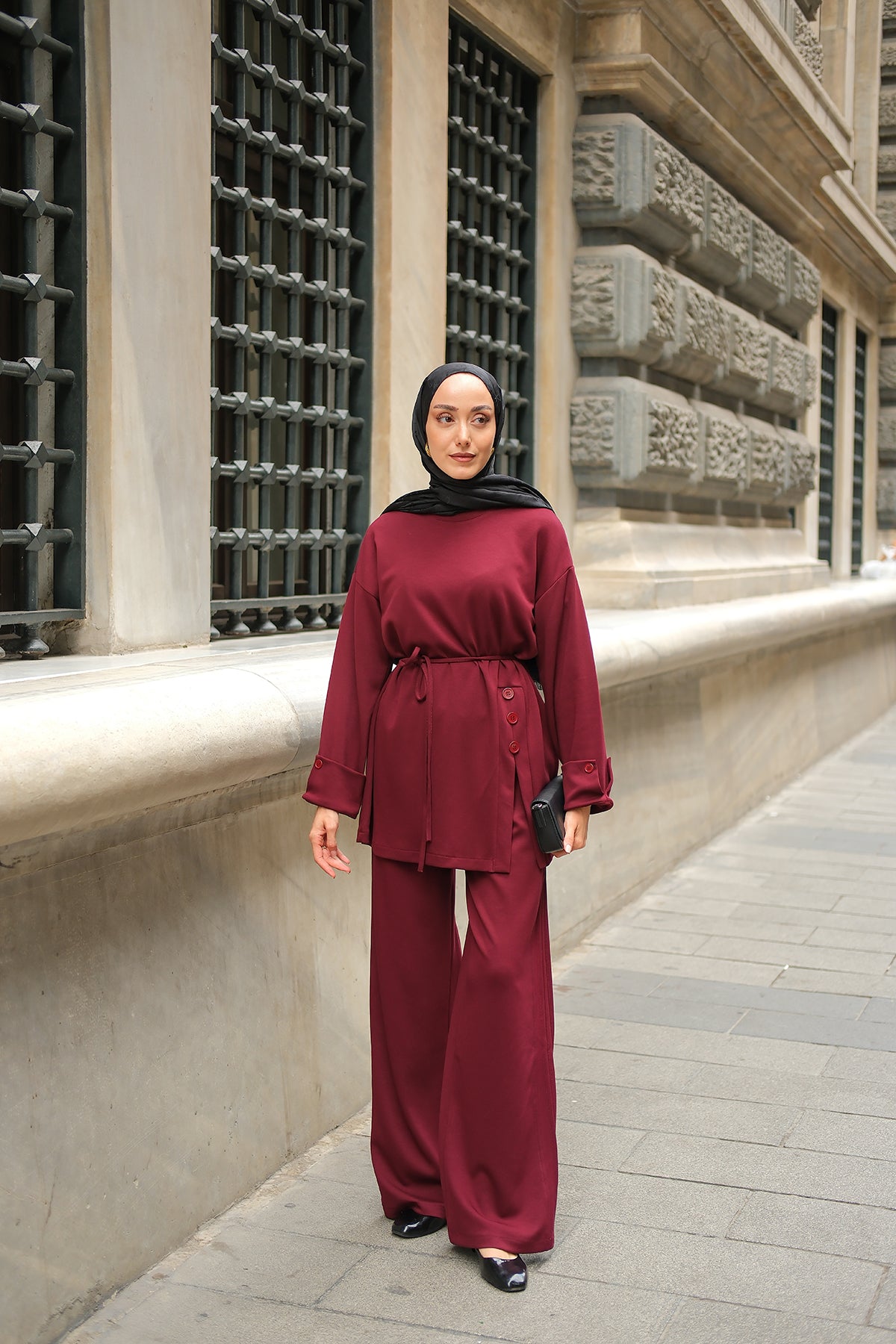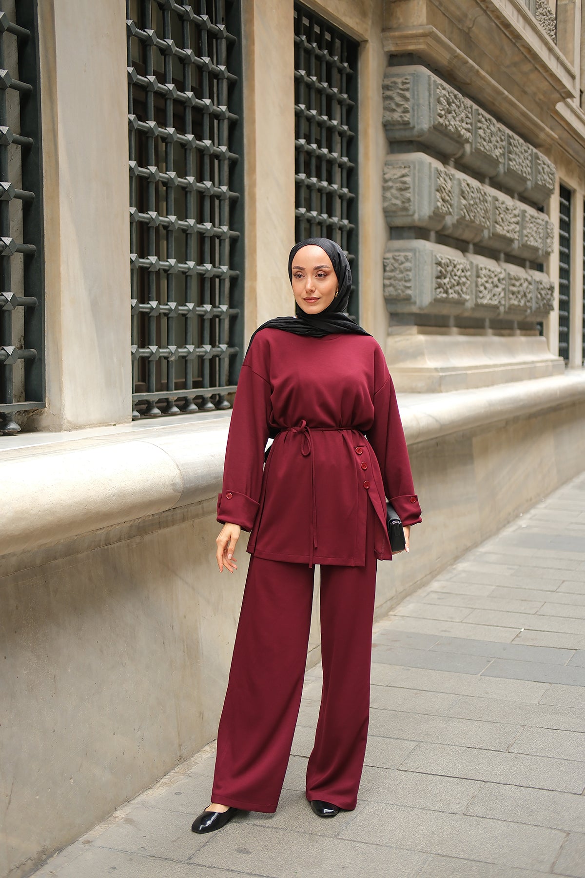 Yandan Düğmeli Gömlek Detaylı Takım Bordo