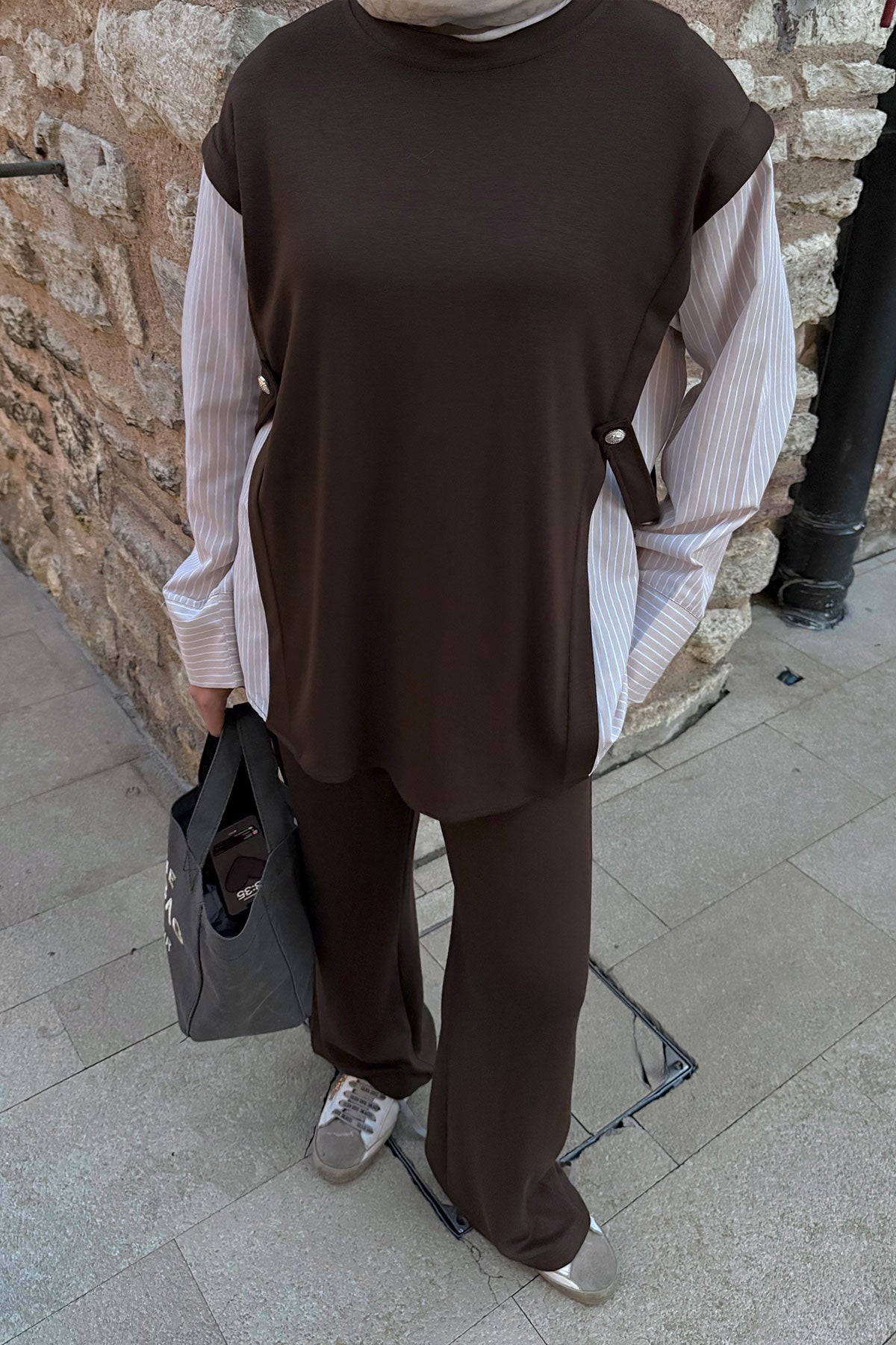 Yandan Düğmeli Gömlek Detaylı Takım Kahverengi