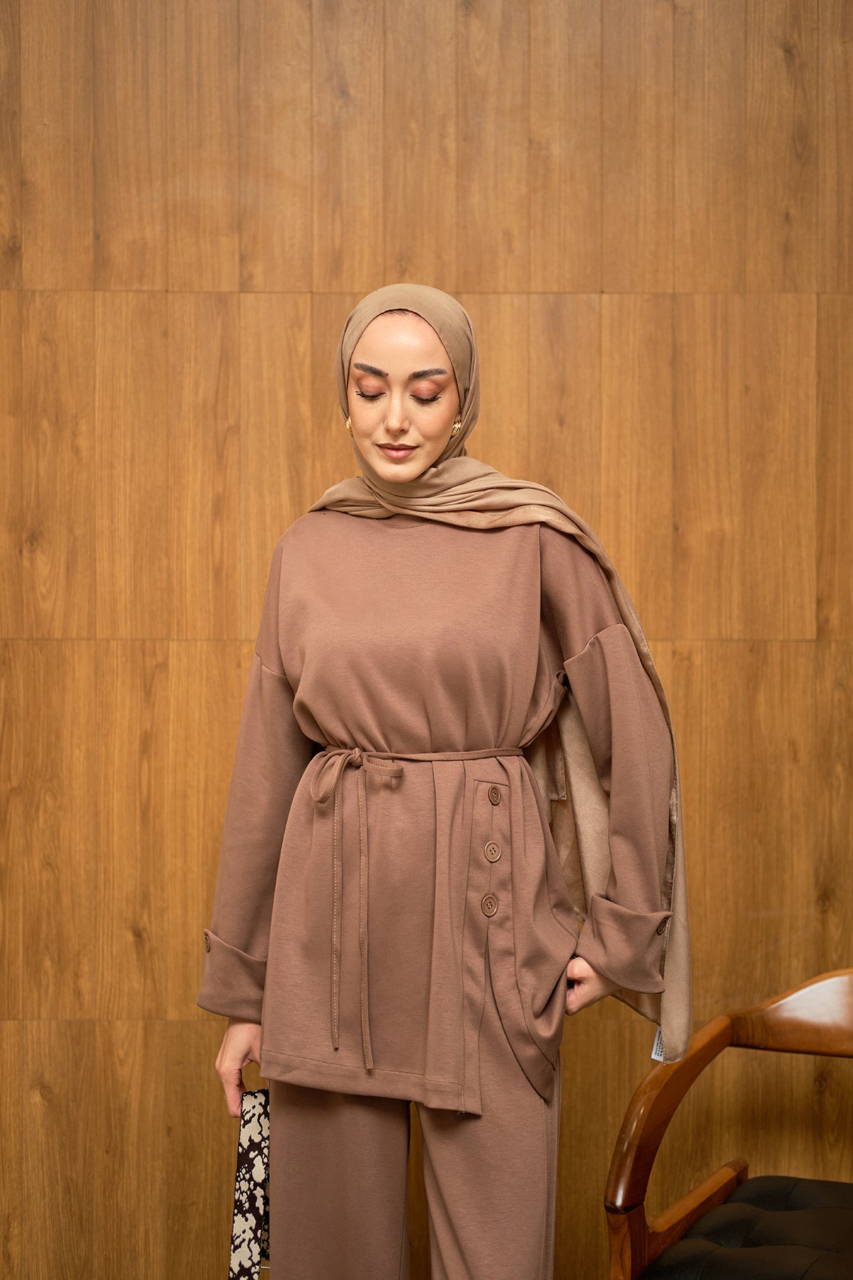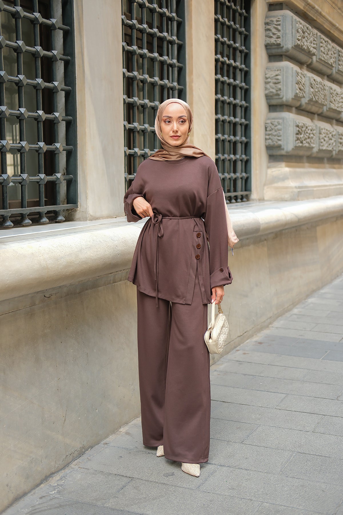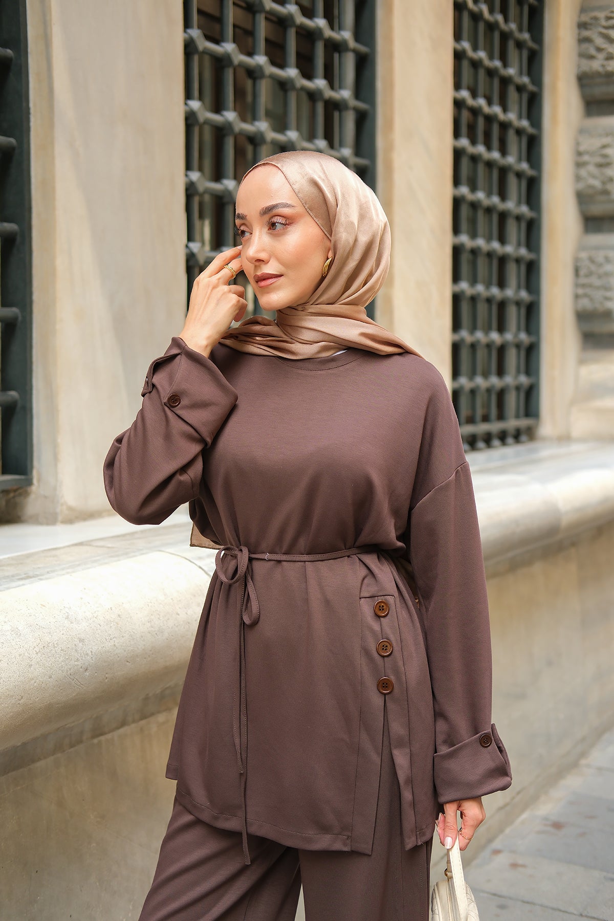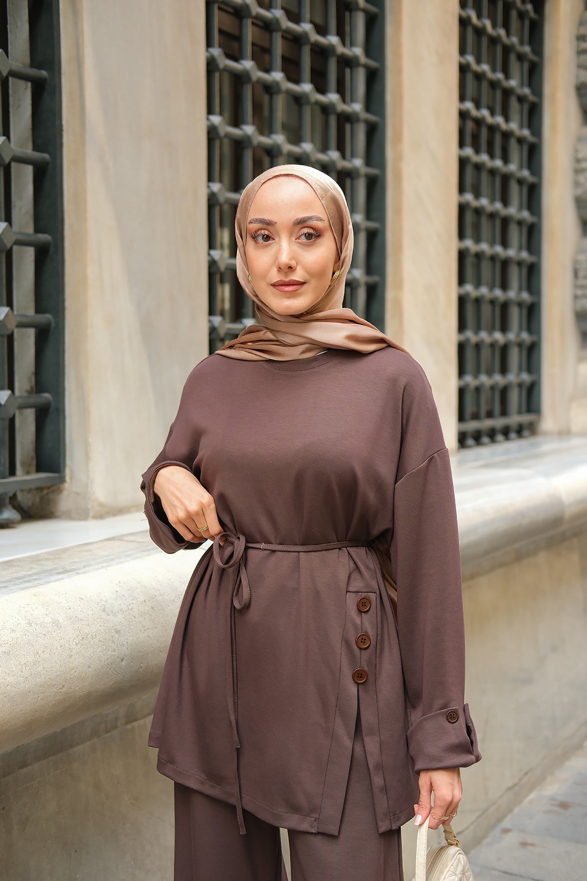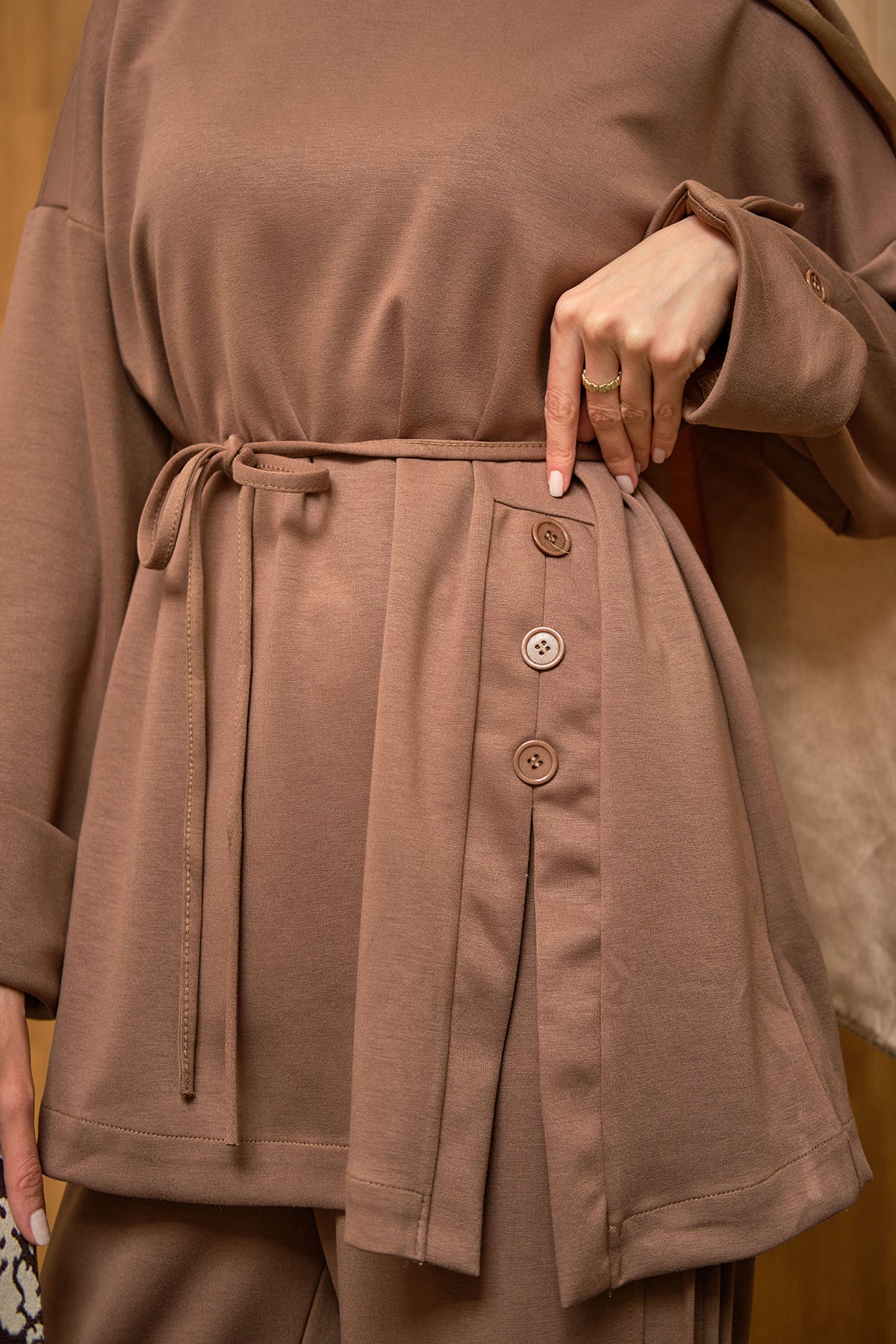 Yan Düğme Detay Takım Kahverengi