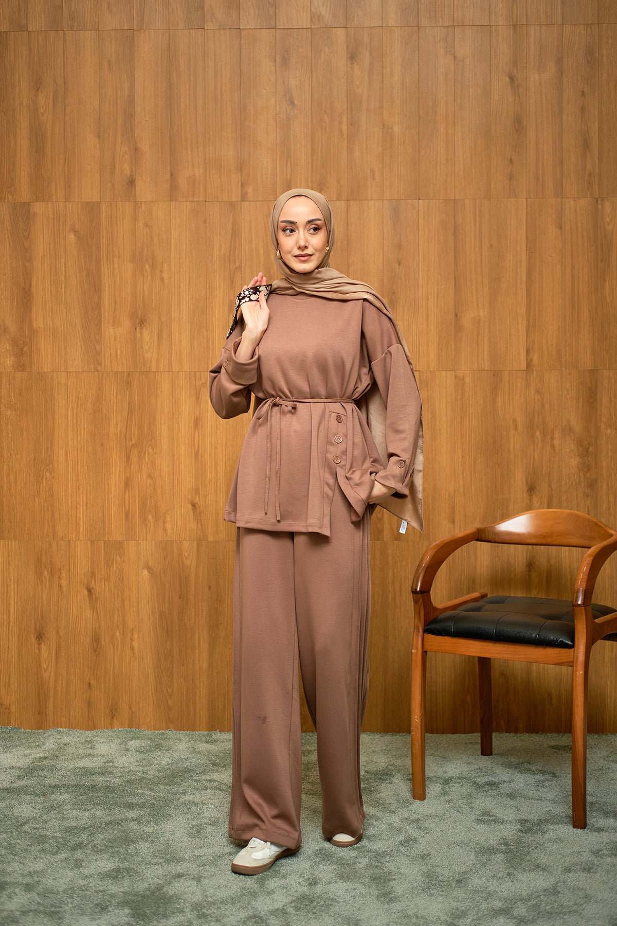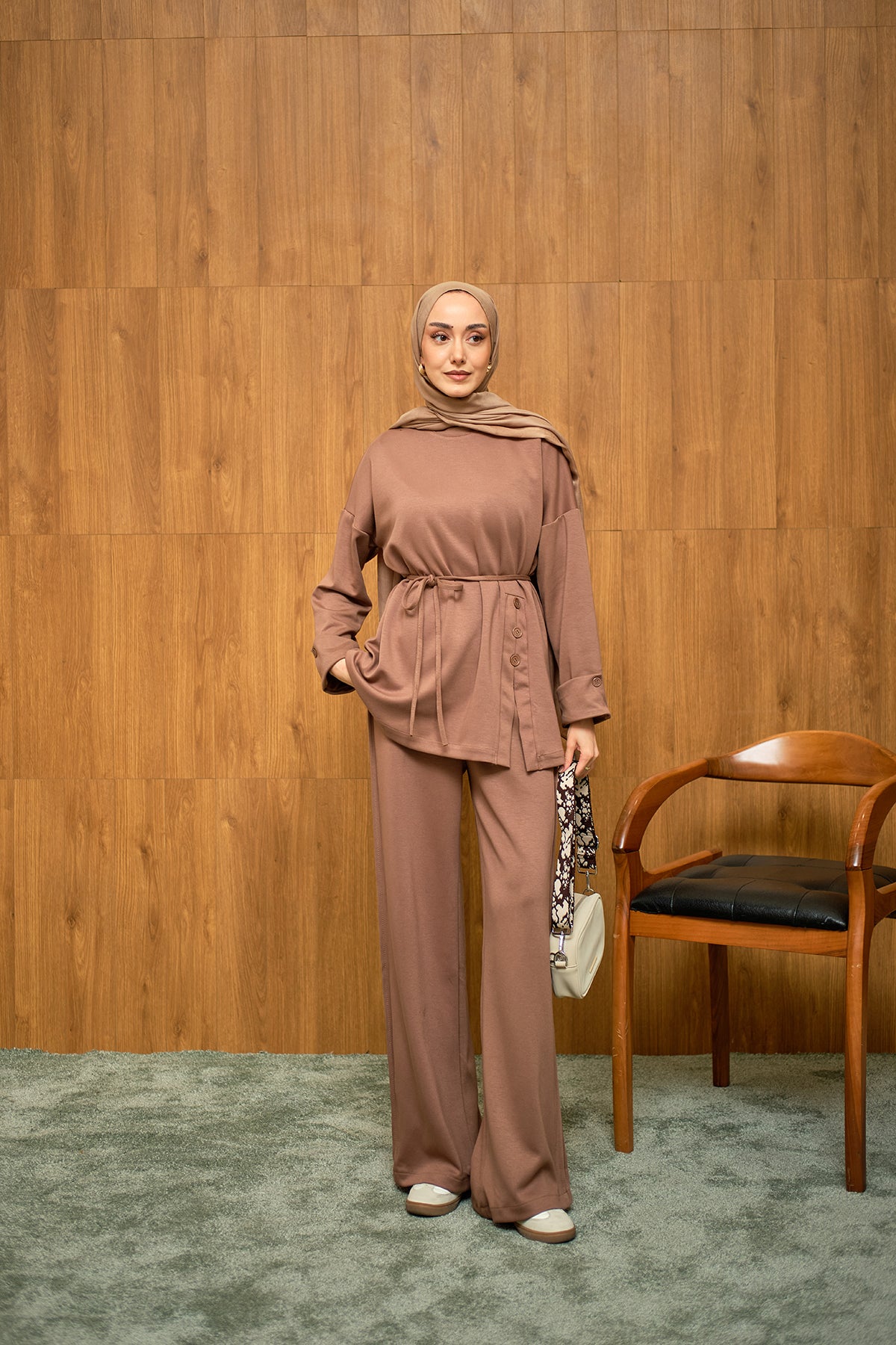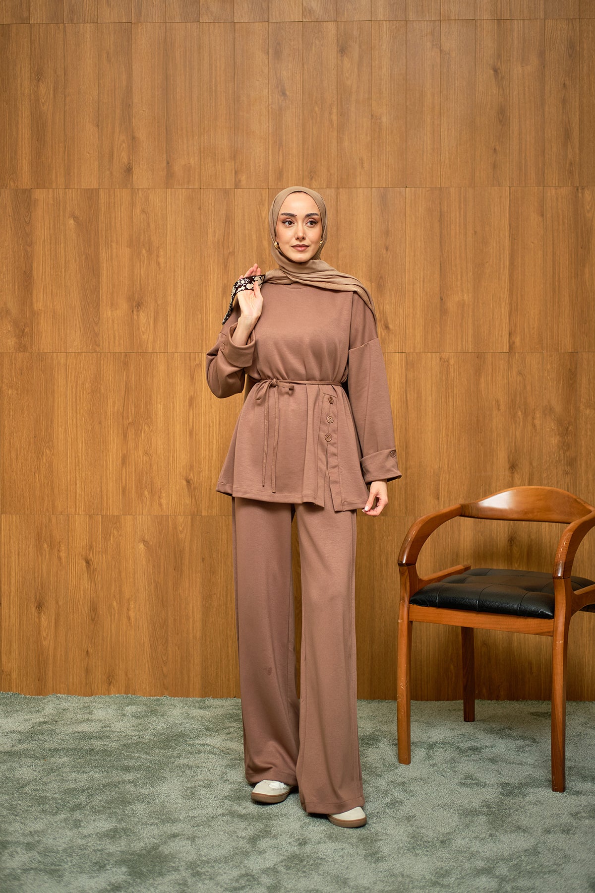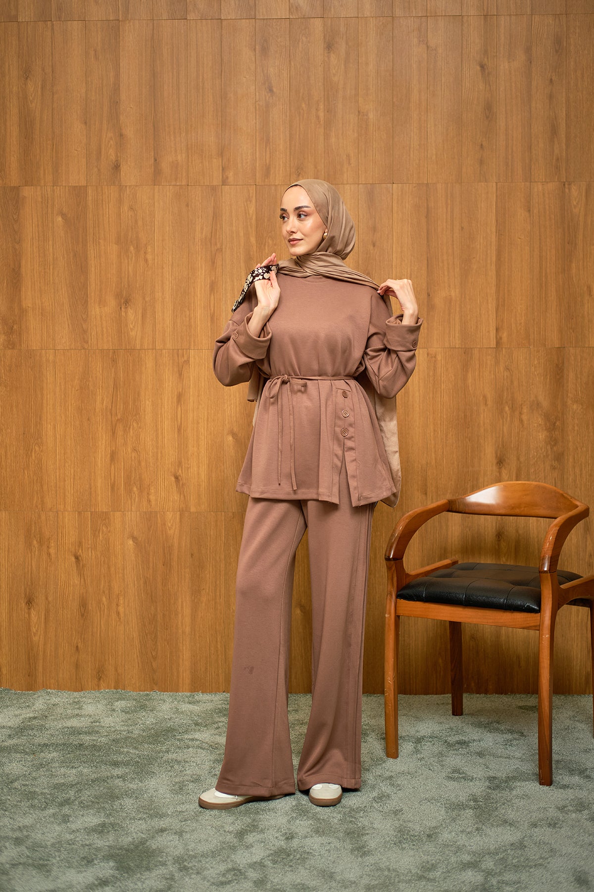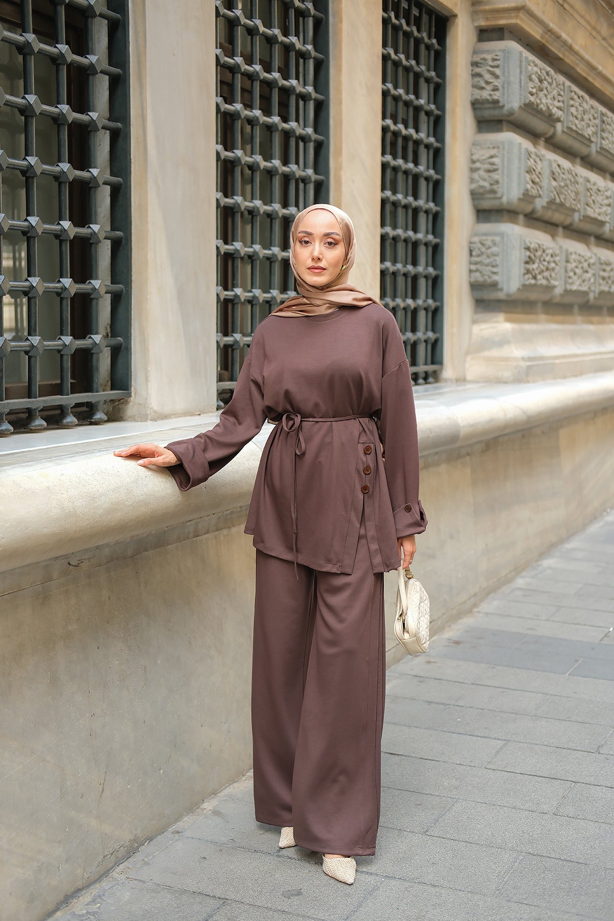 Yan Düğme Detay Takım Kahverengi