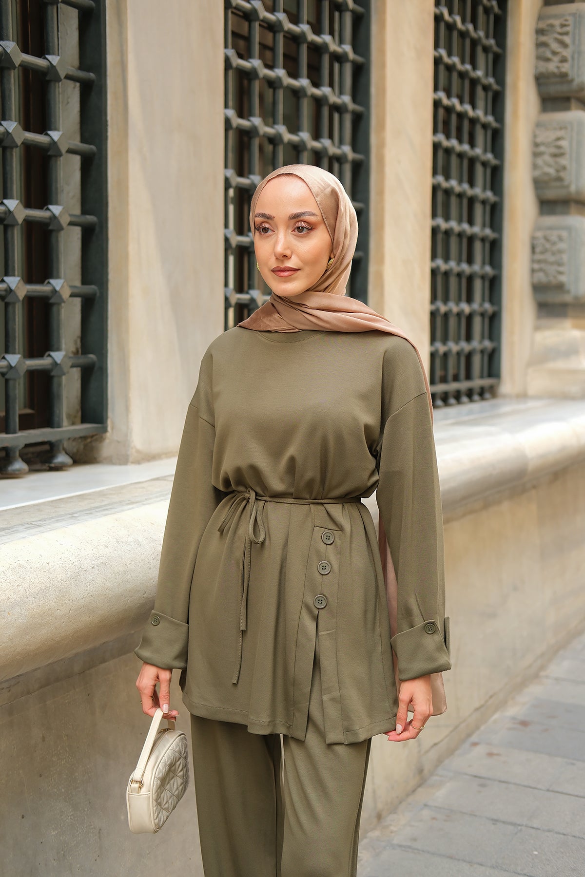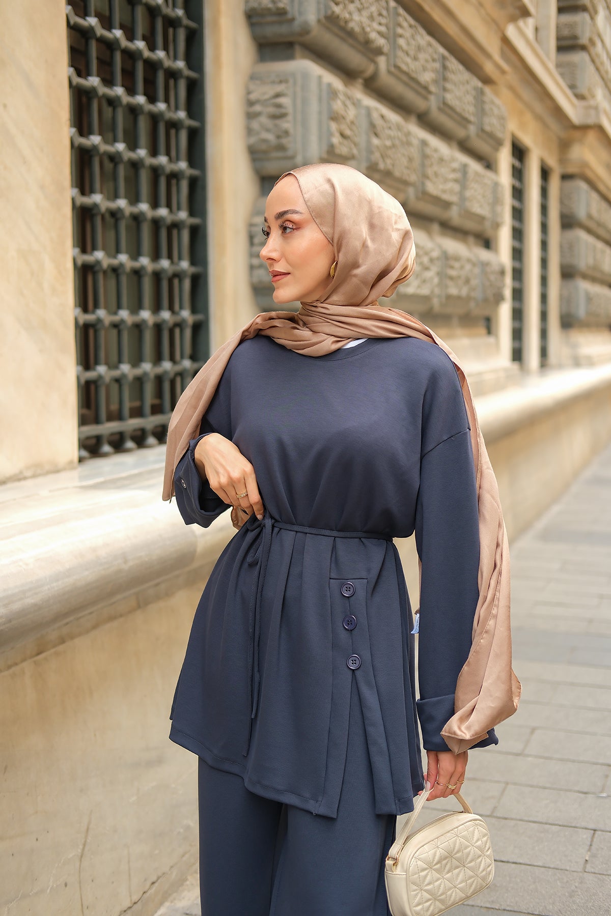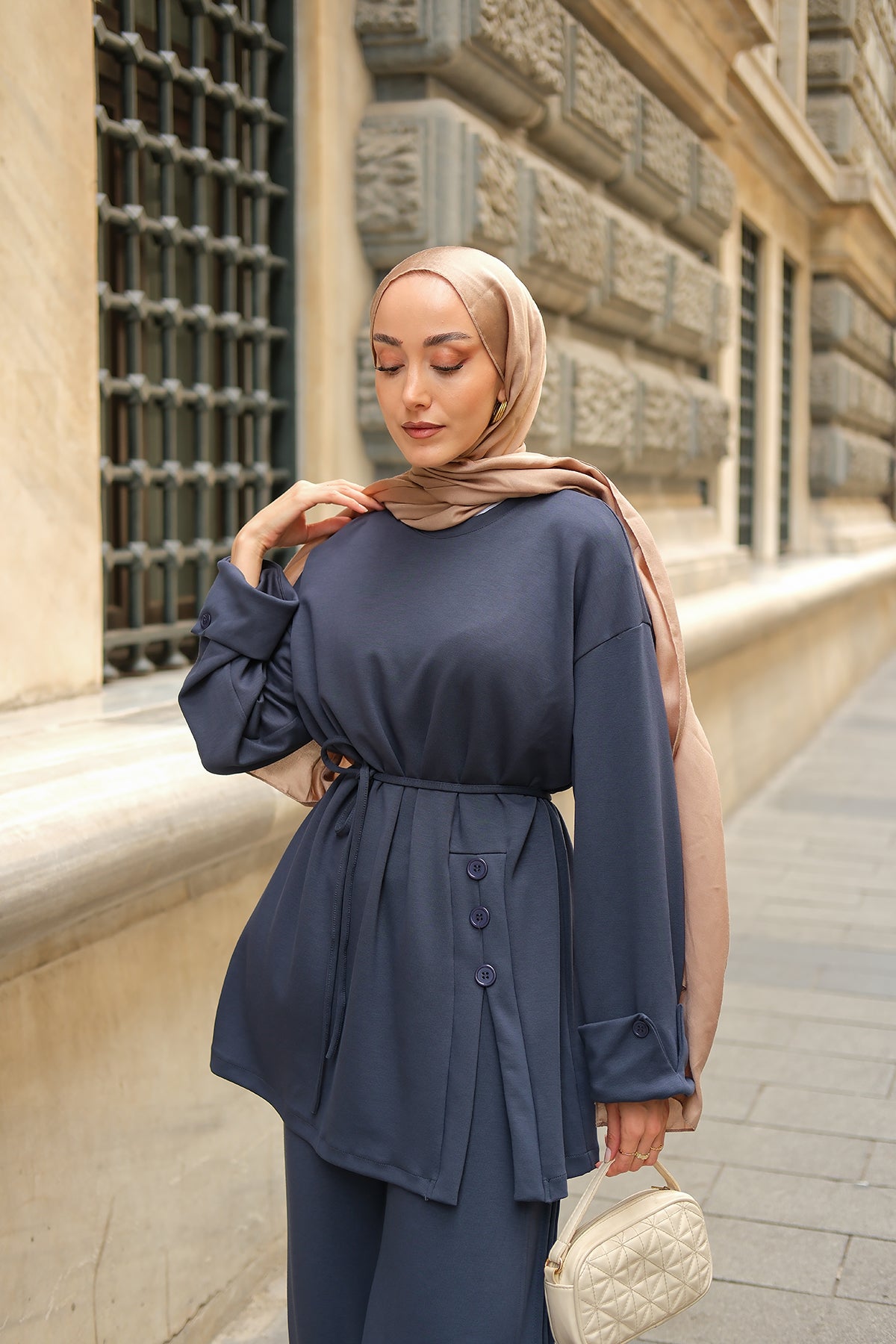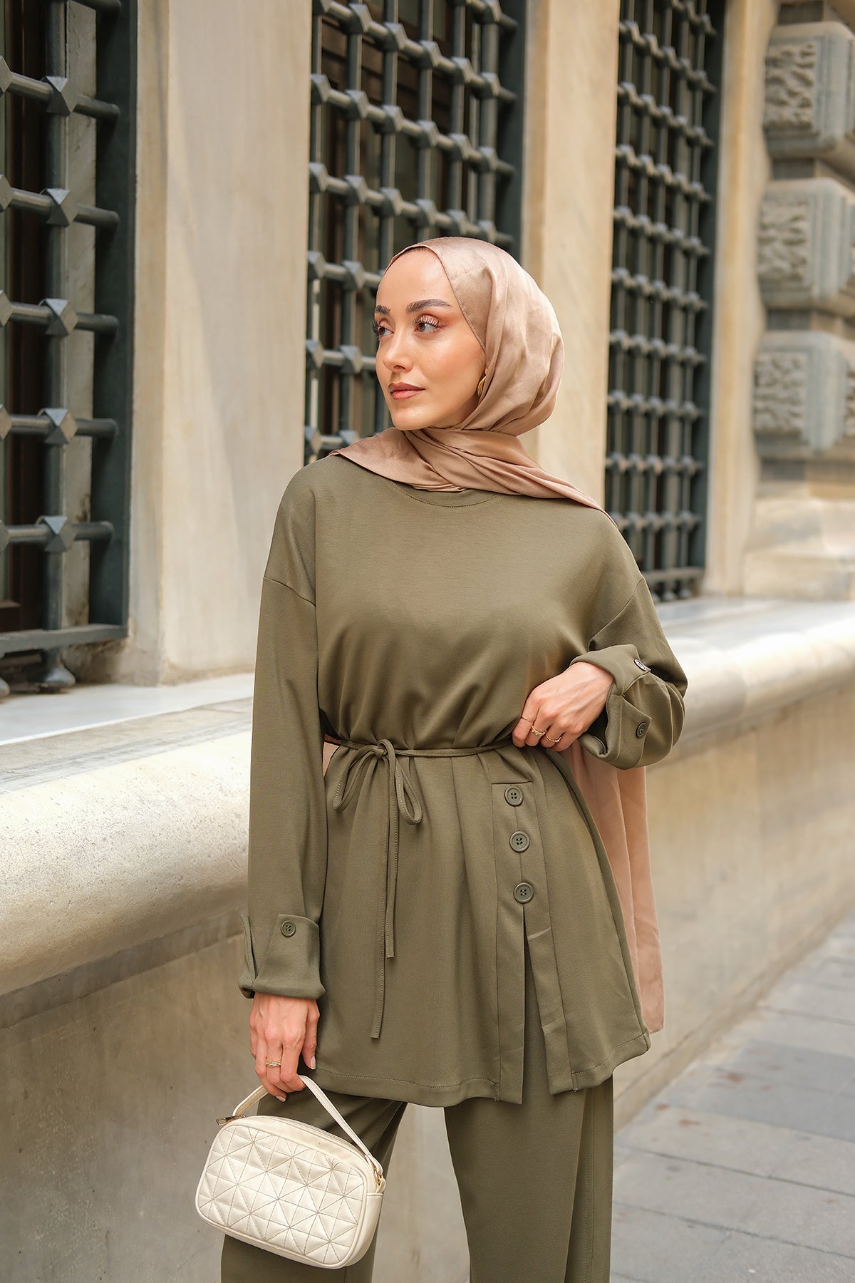 Yan Düğme Detay Takım Ekru