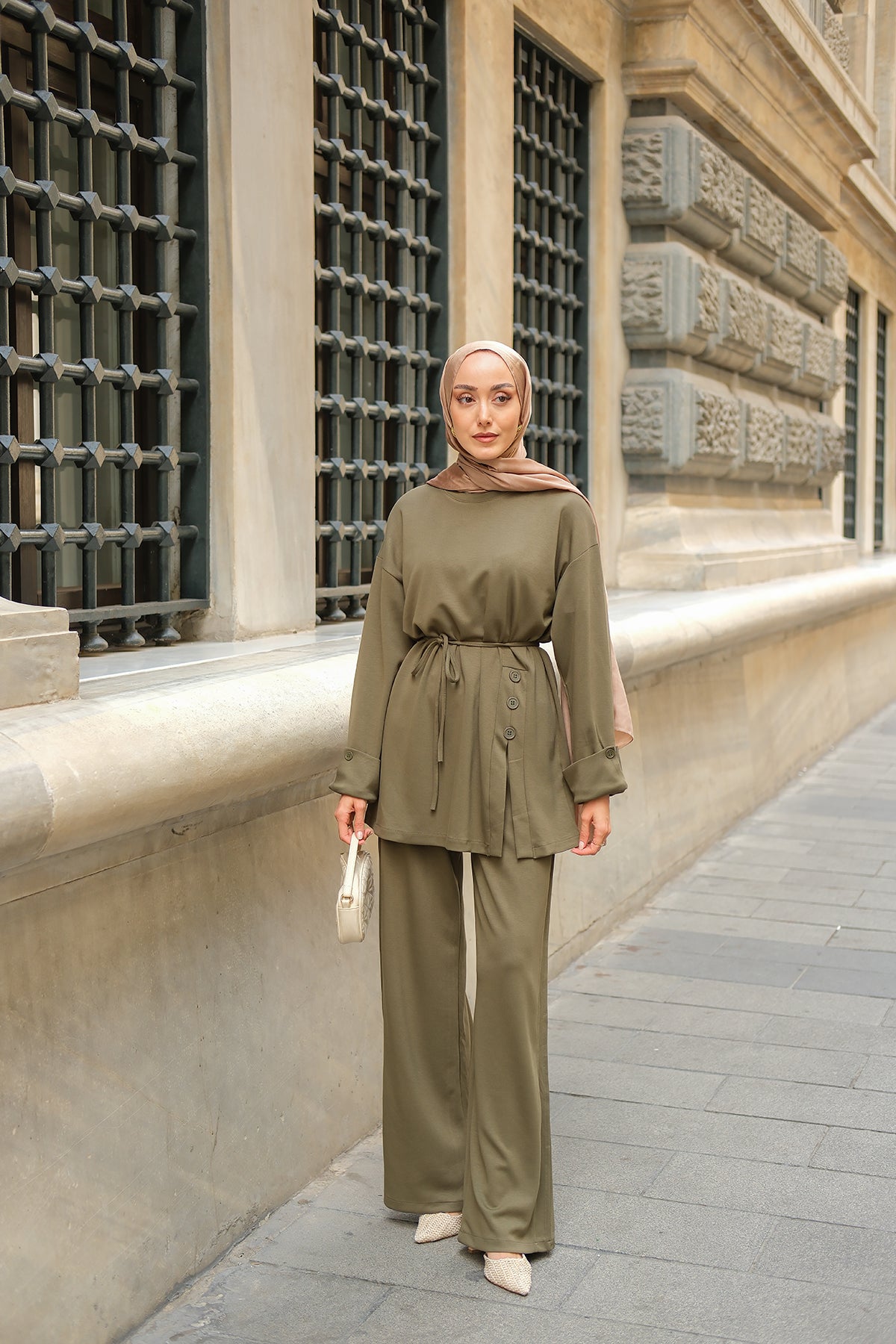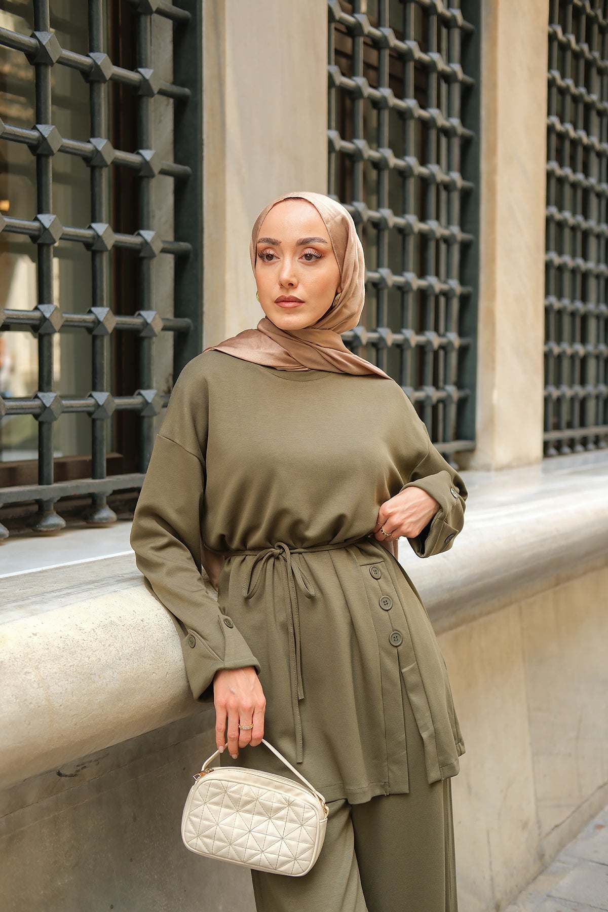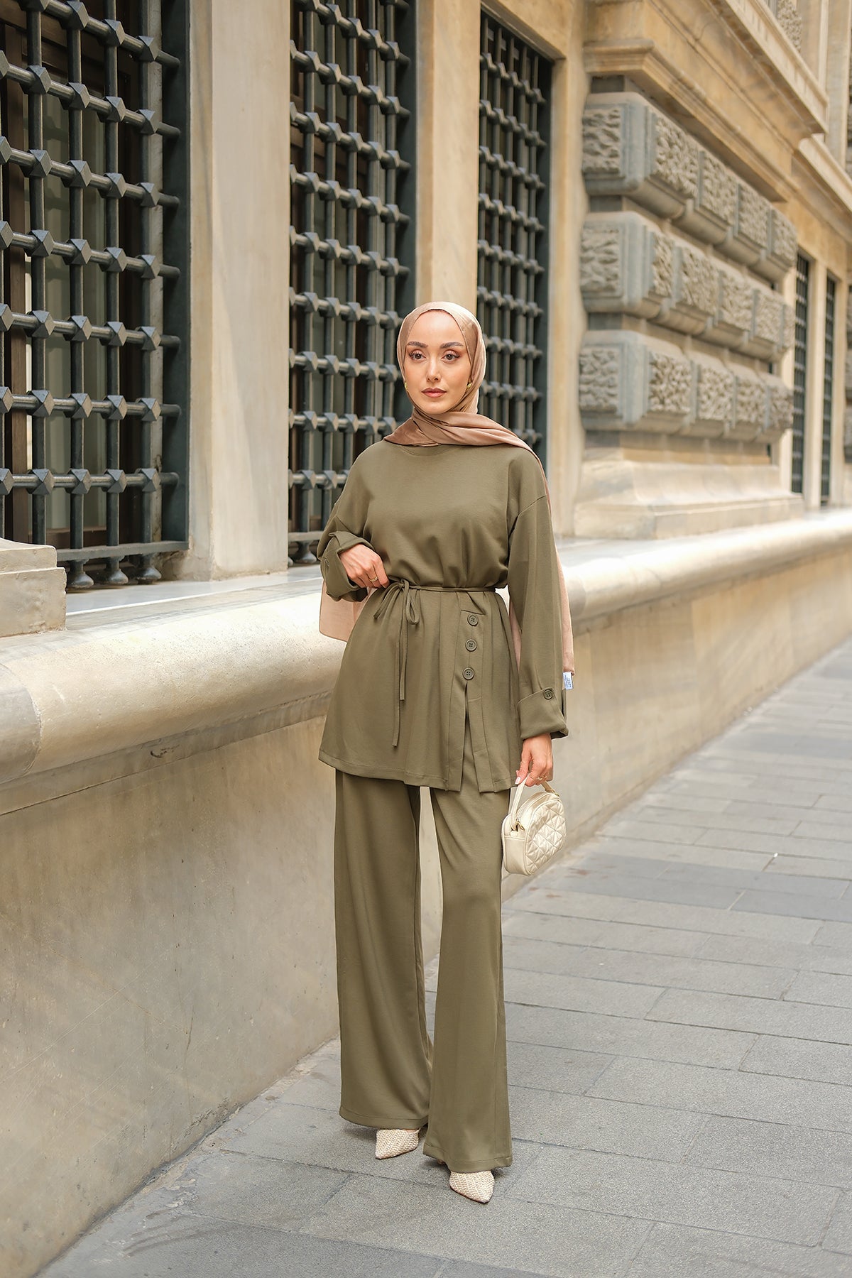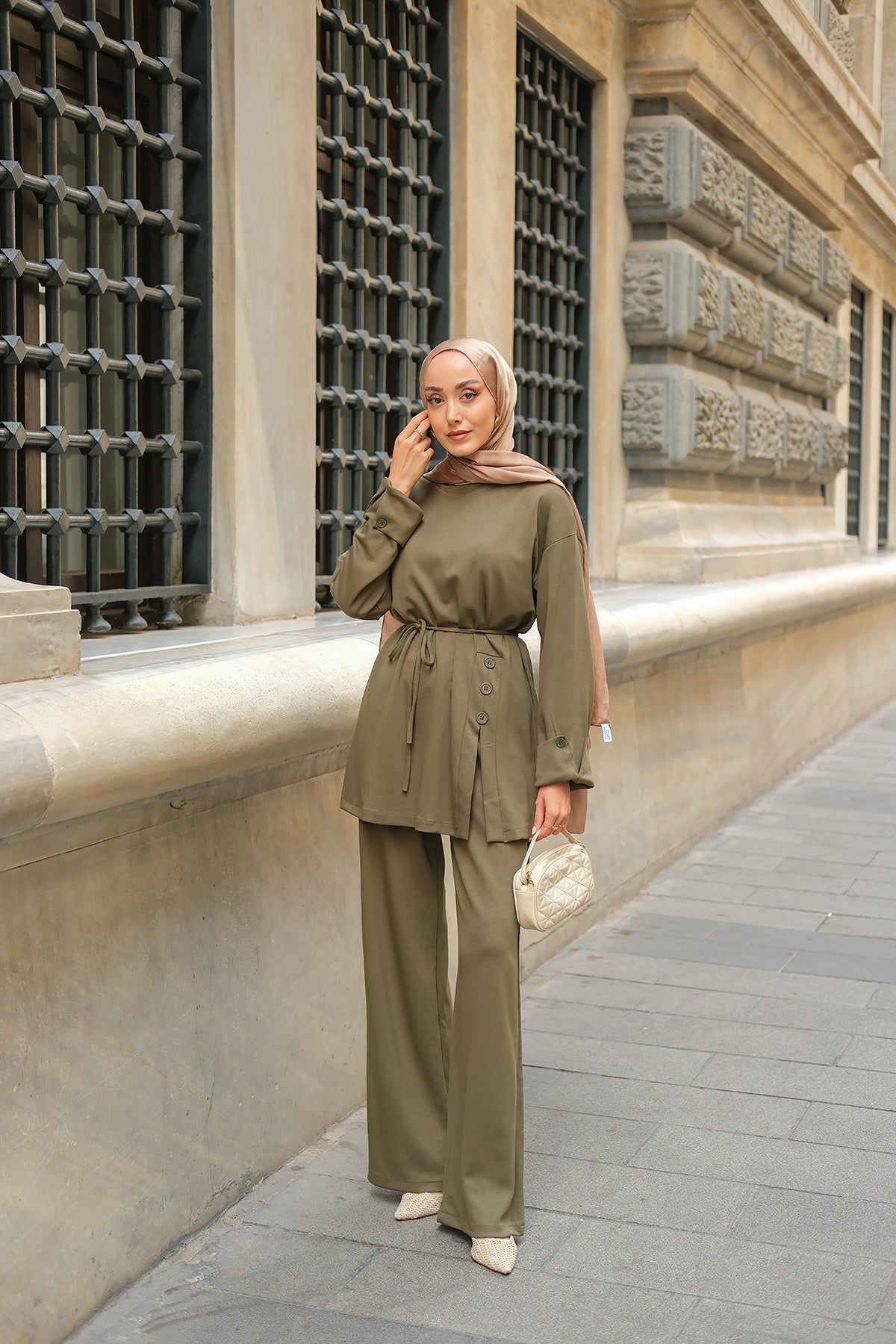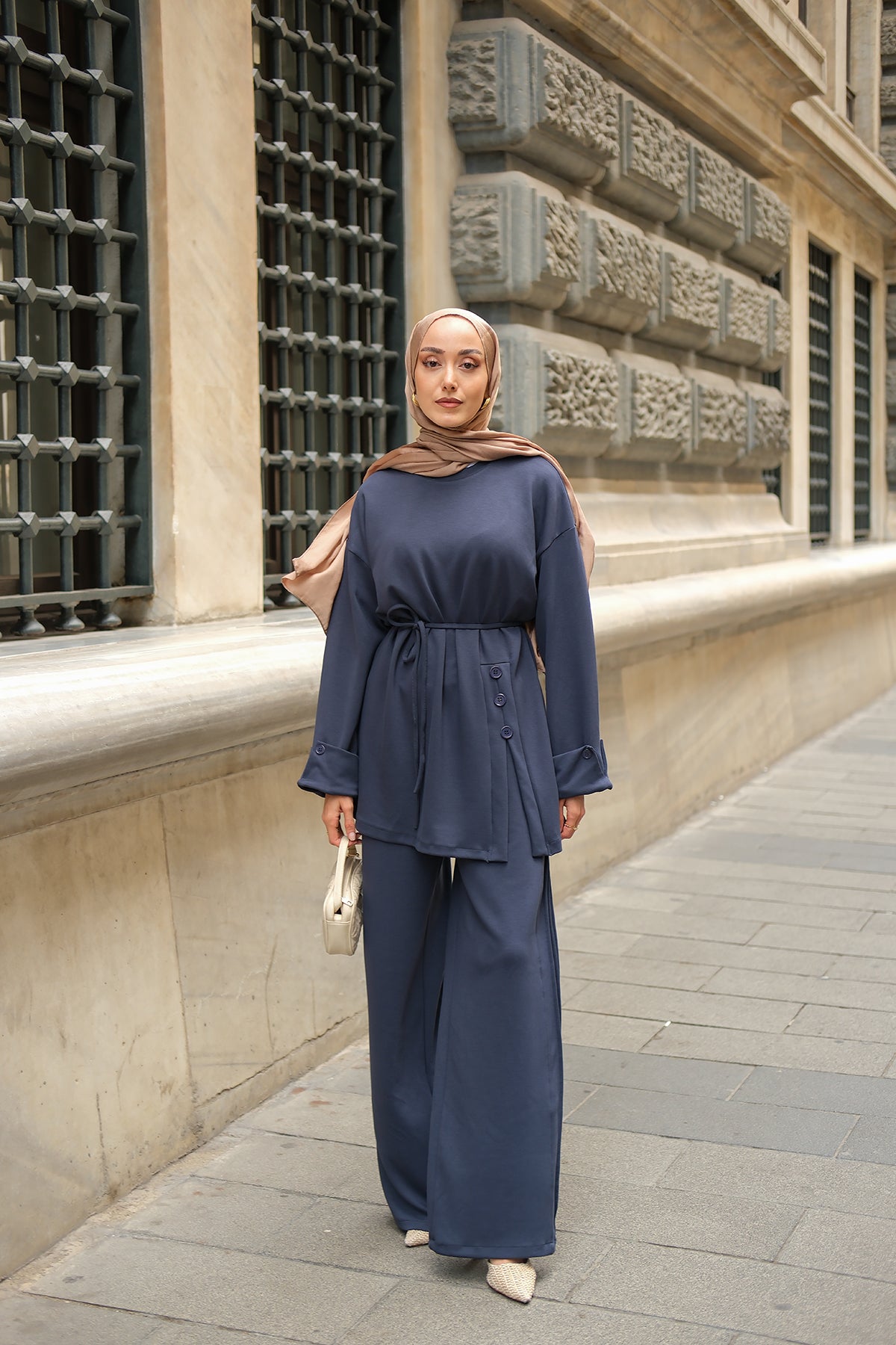 Yan Düğme Detay Takım Ekru