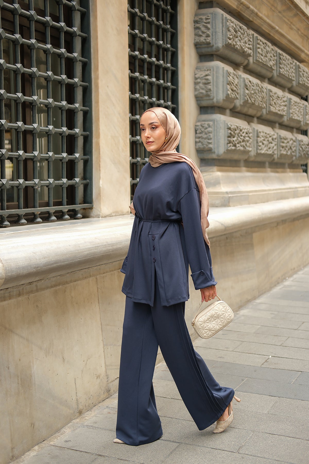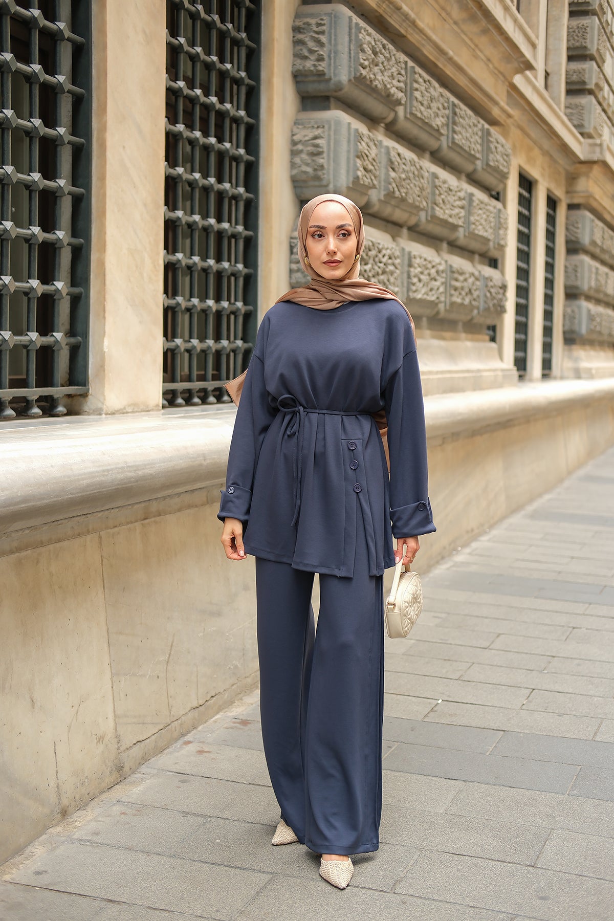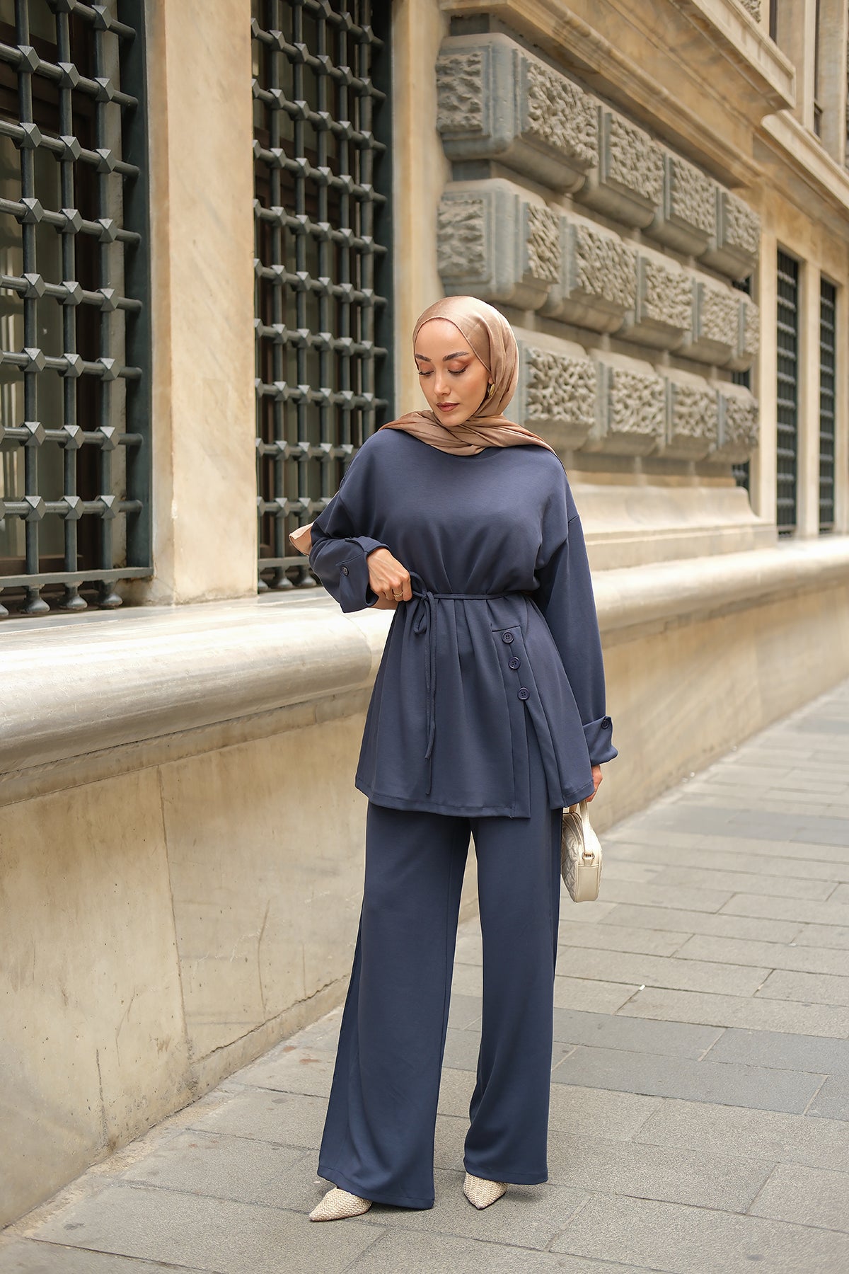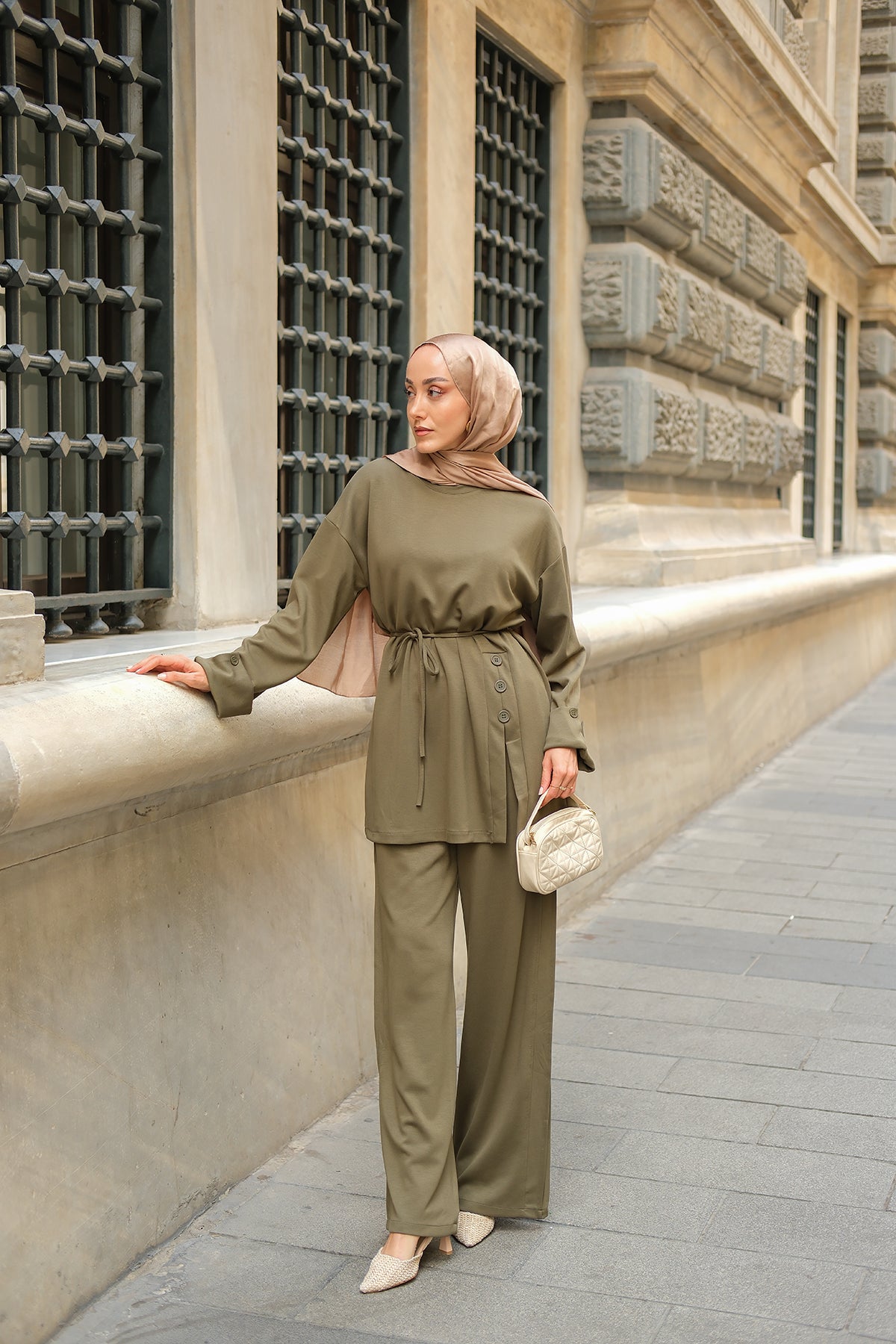 Yan Düğme Detay Takım Ekru