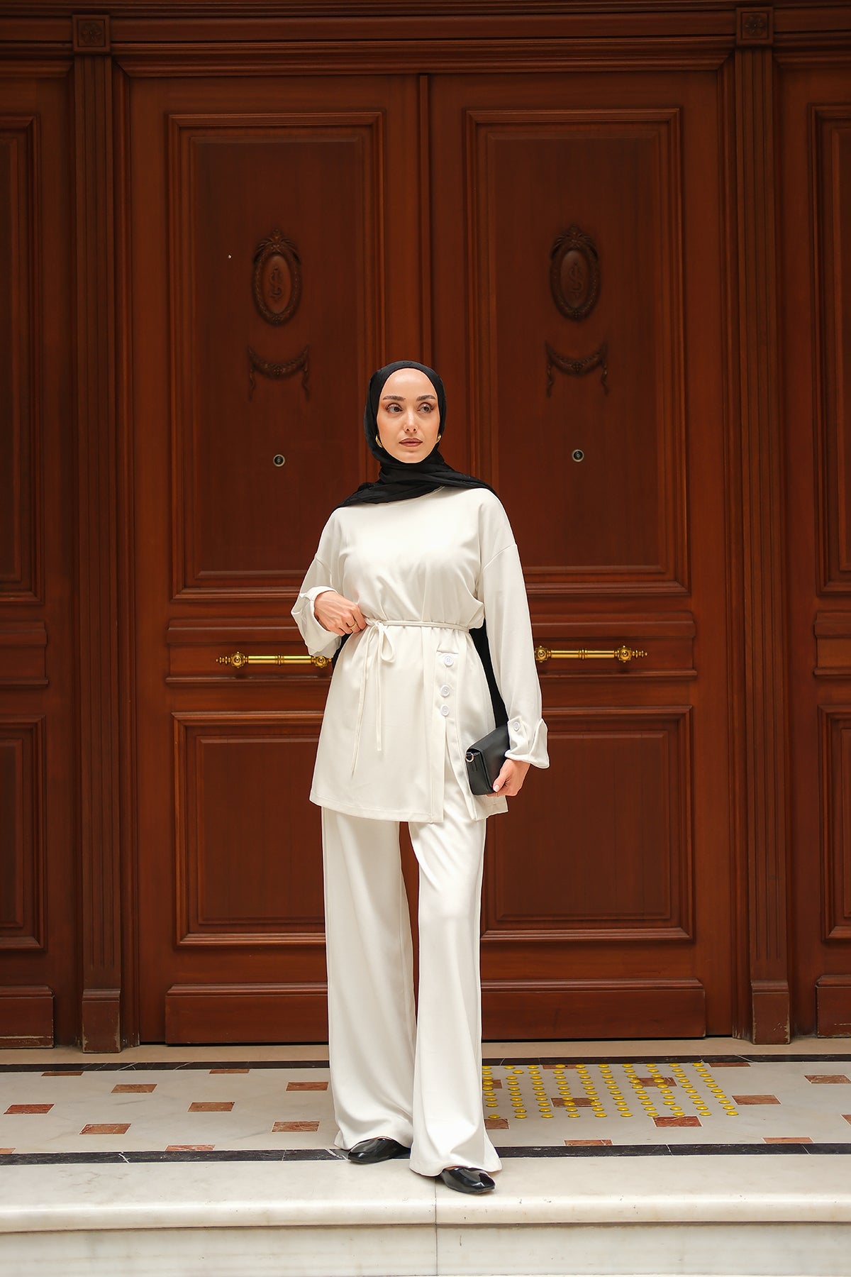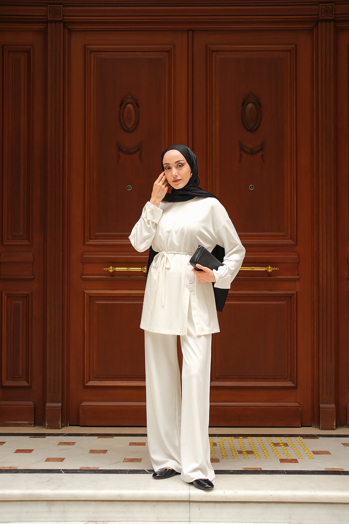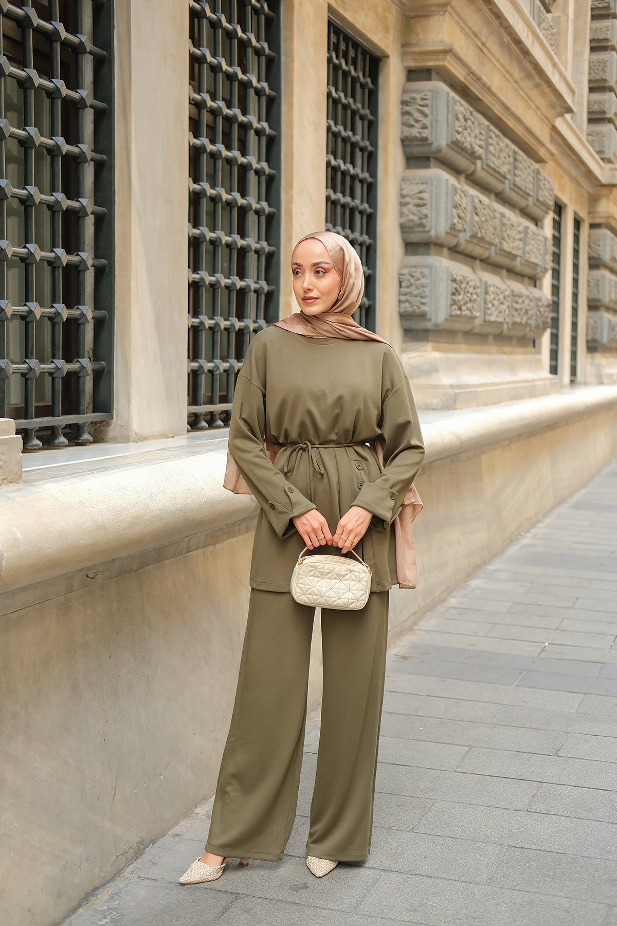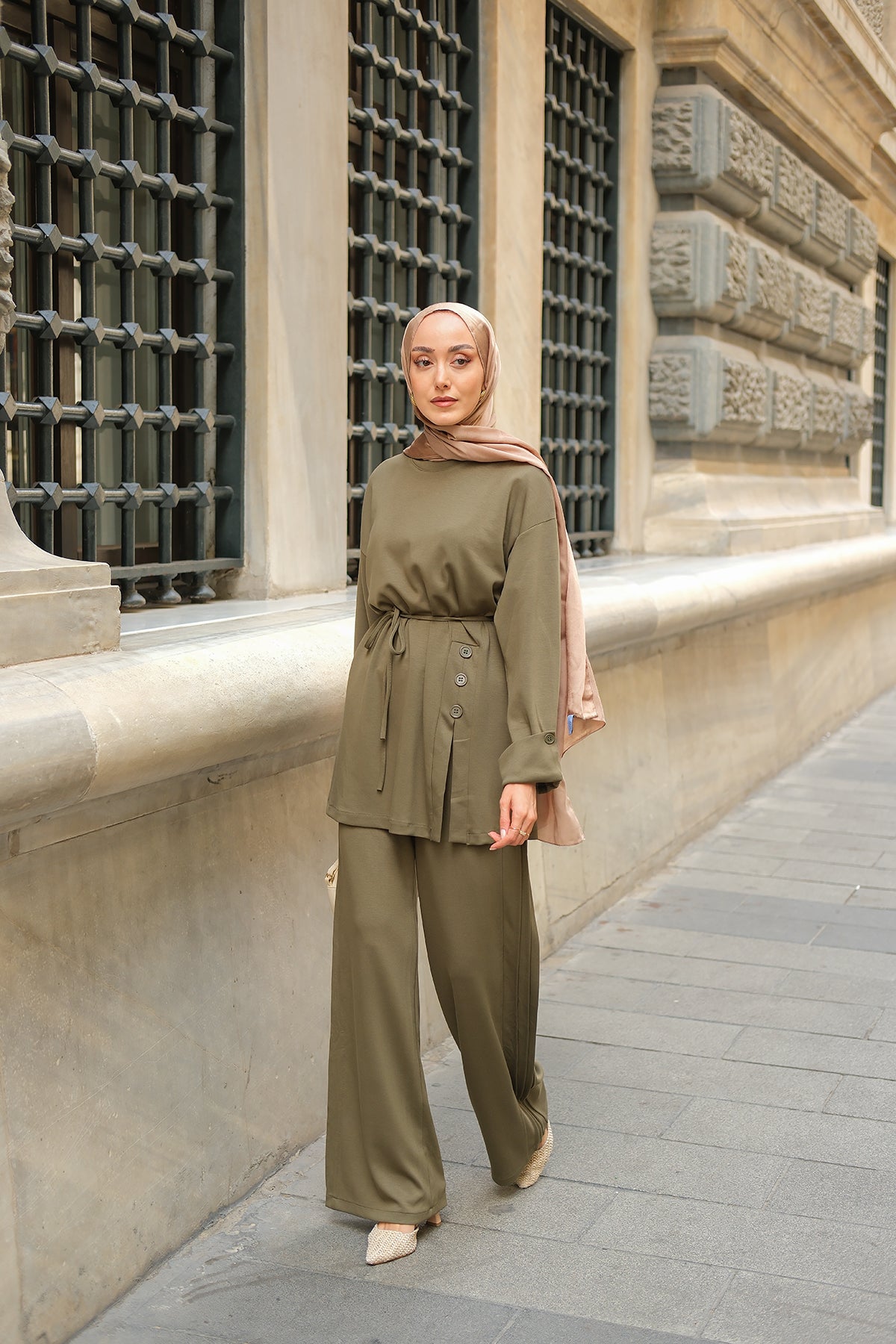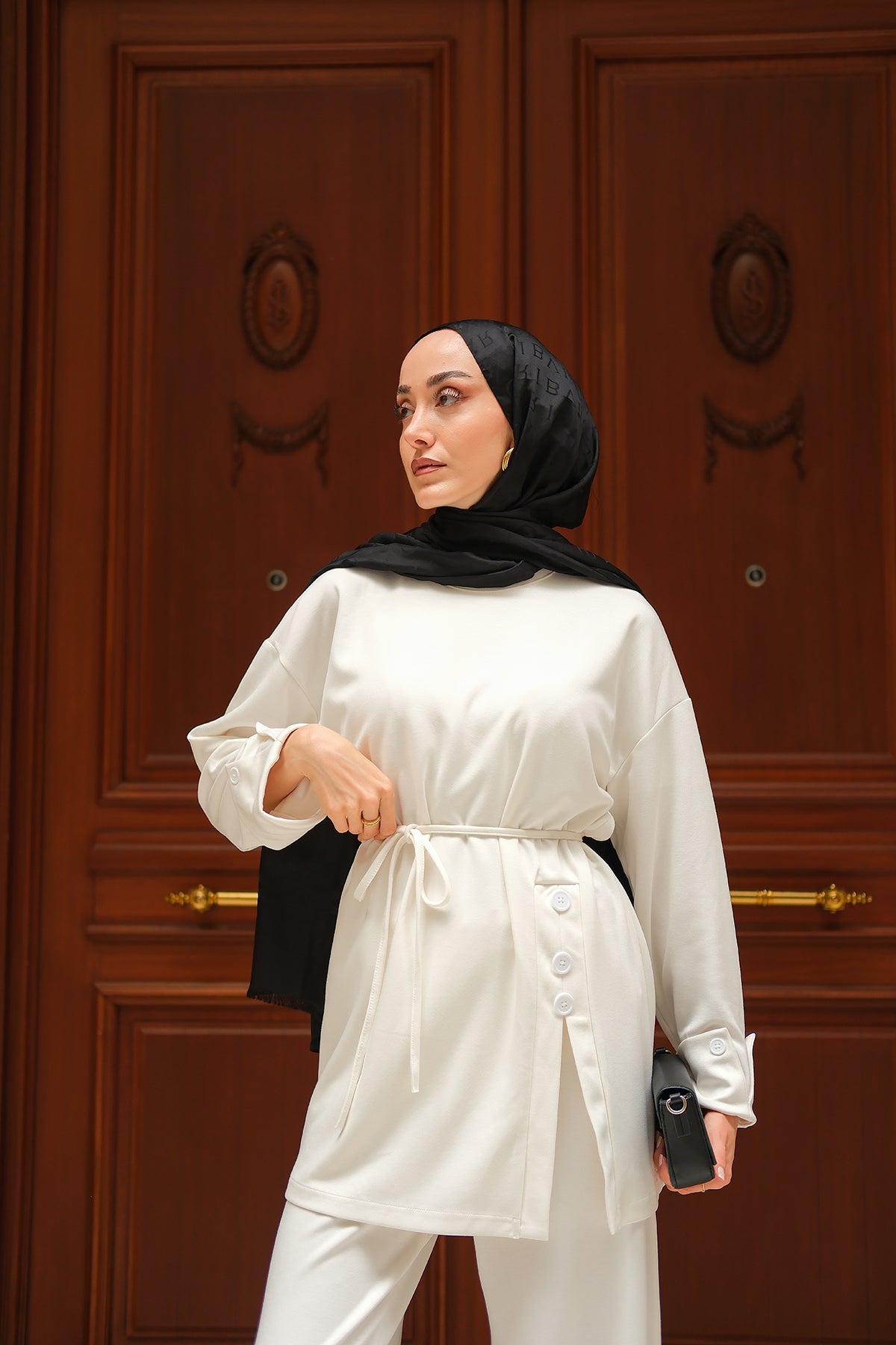 Yan Düğme Detay Takım Ekru