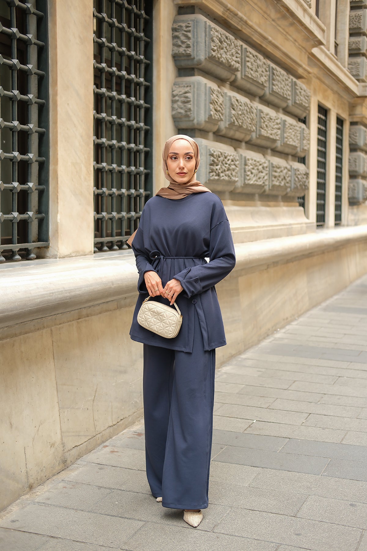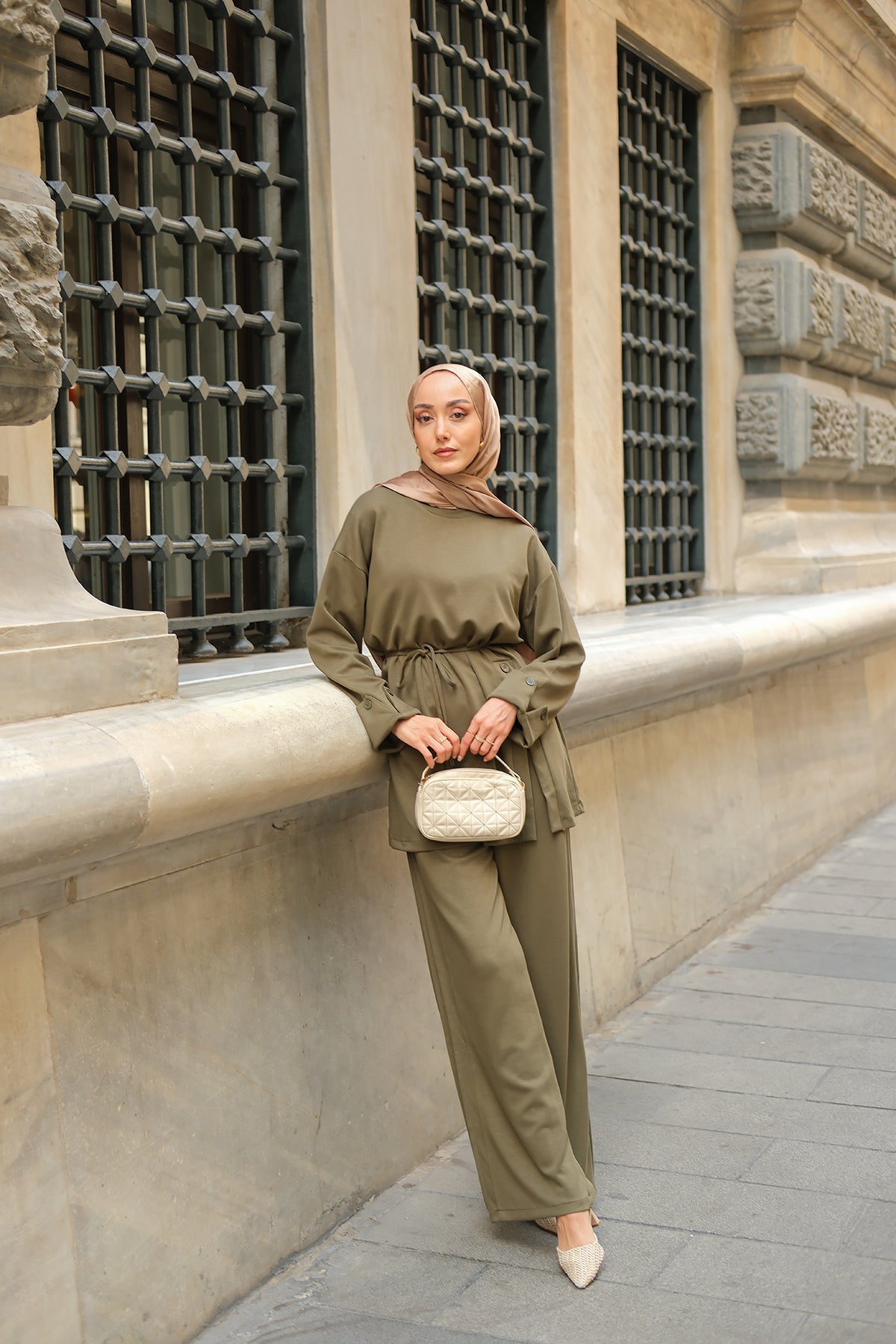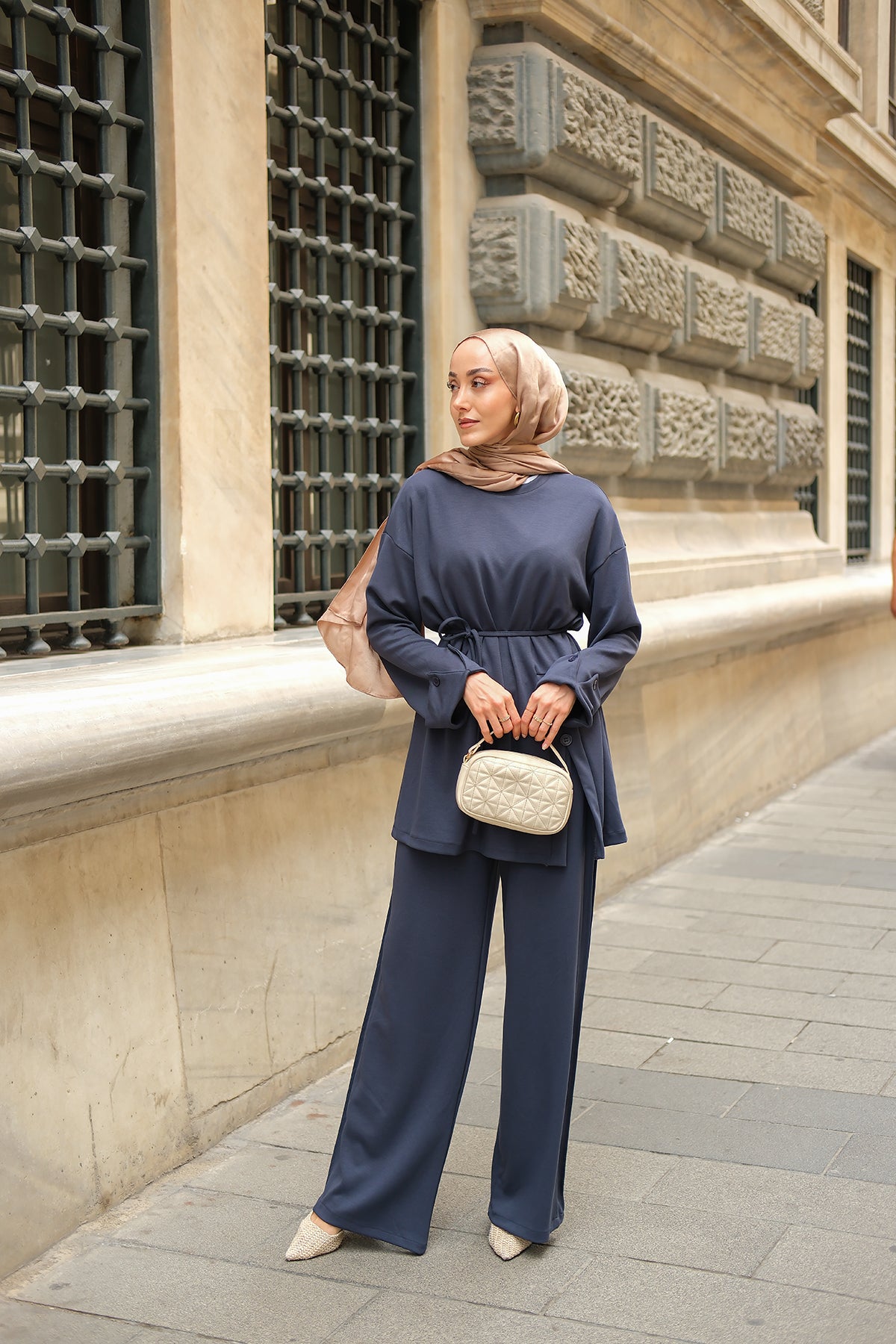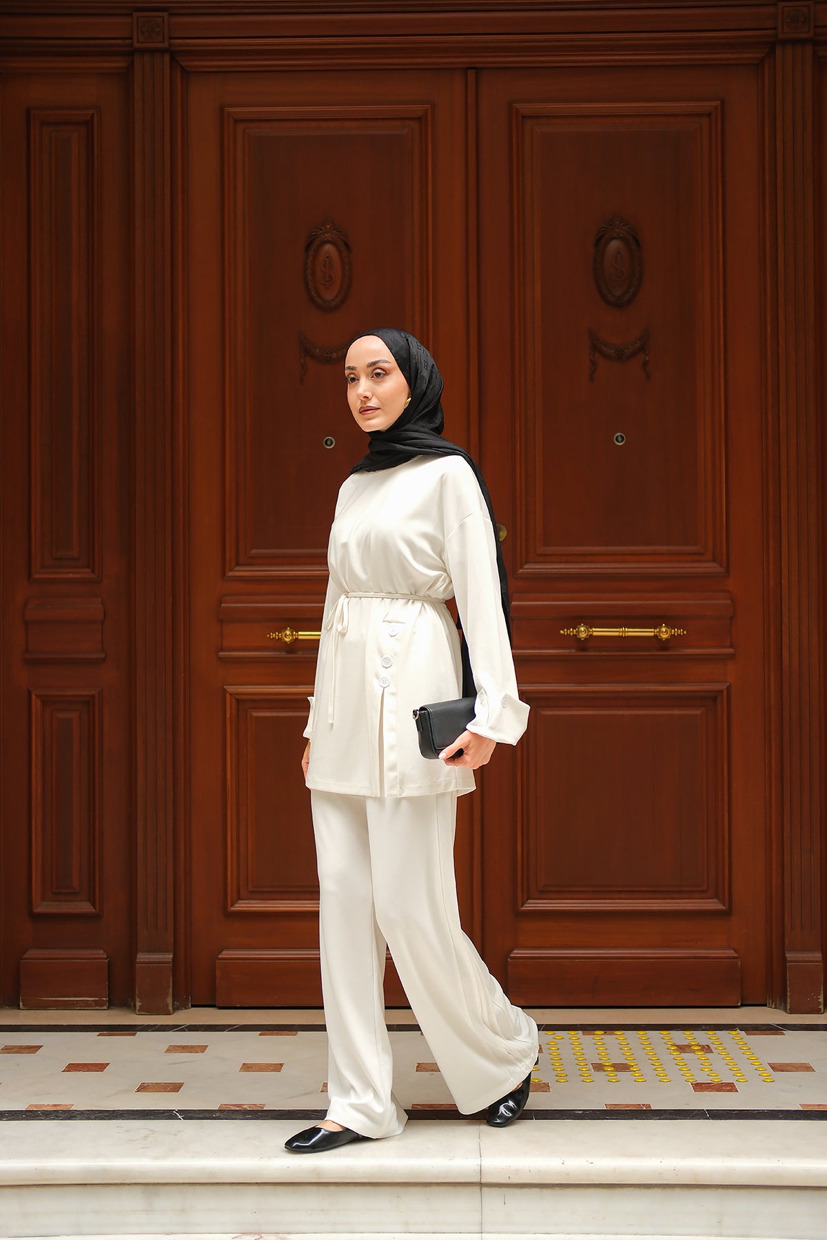 Yan Düğme Detay Takım Ekru
