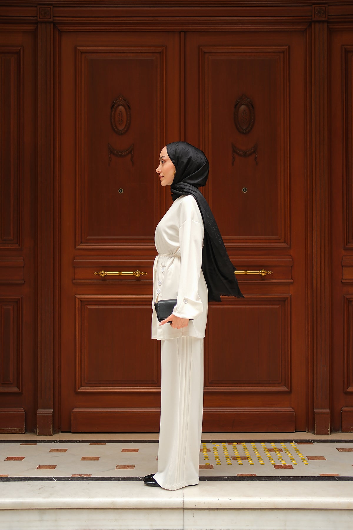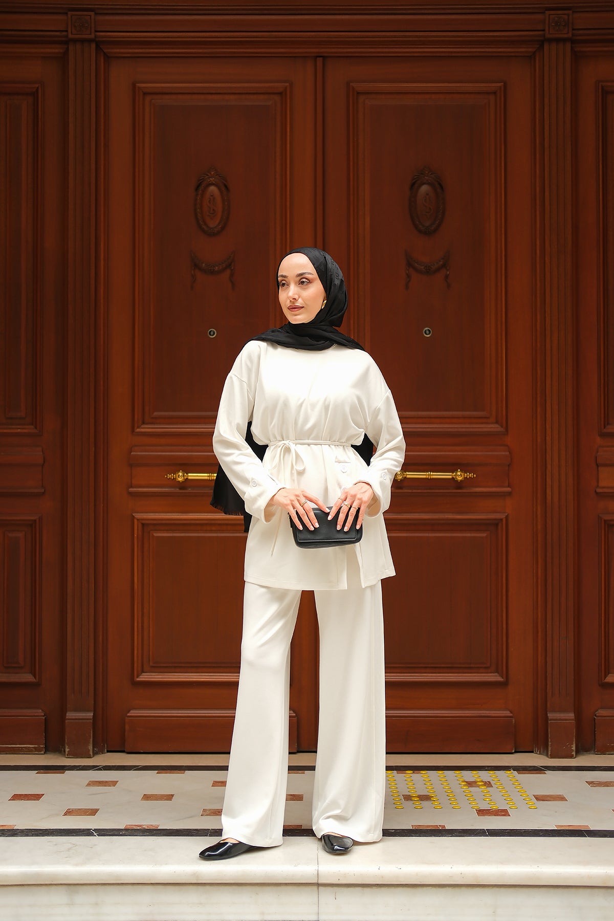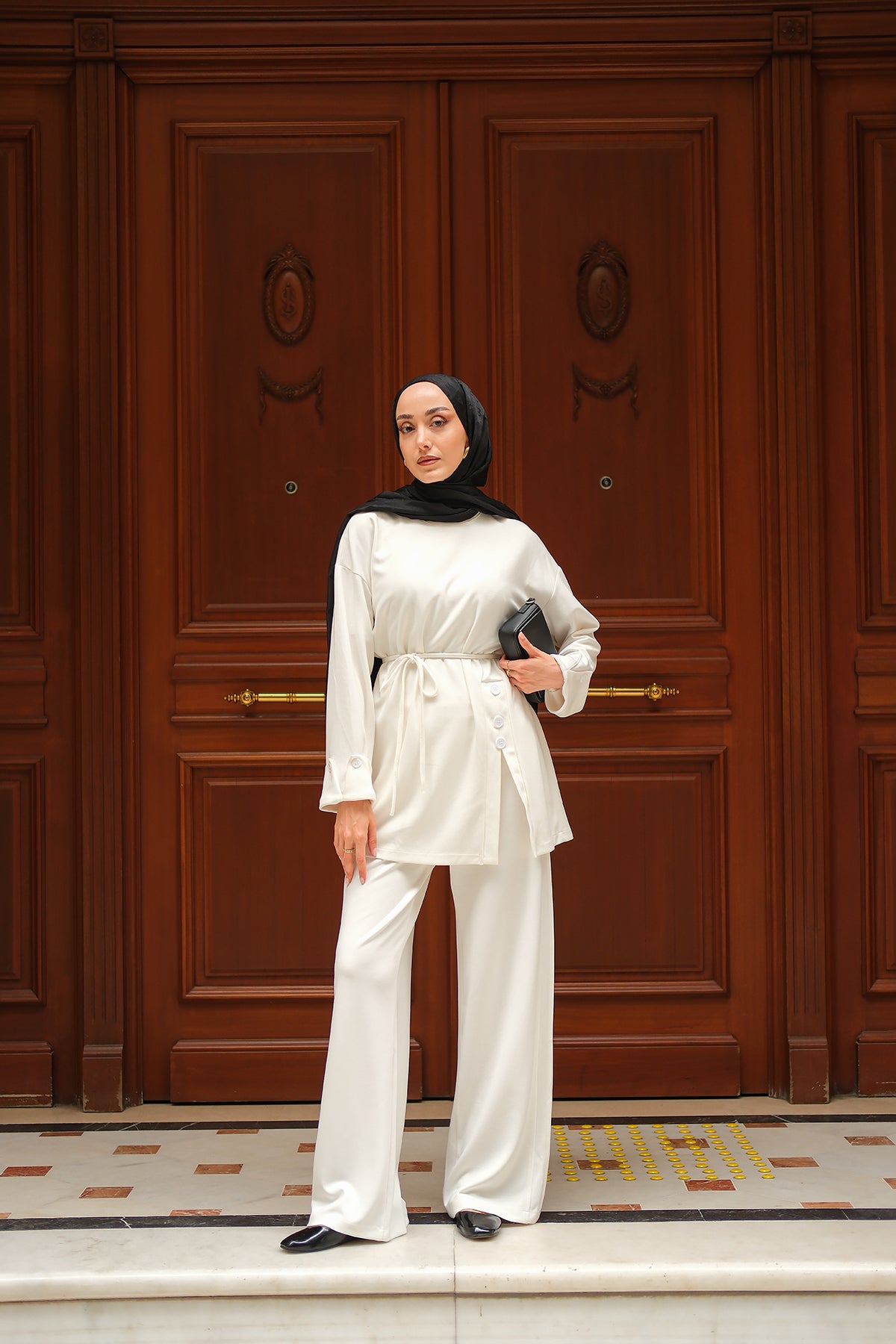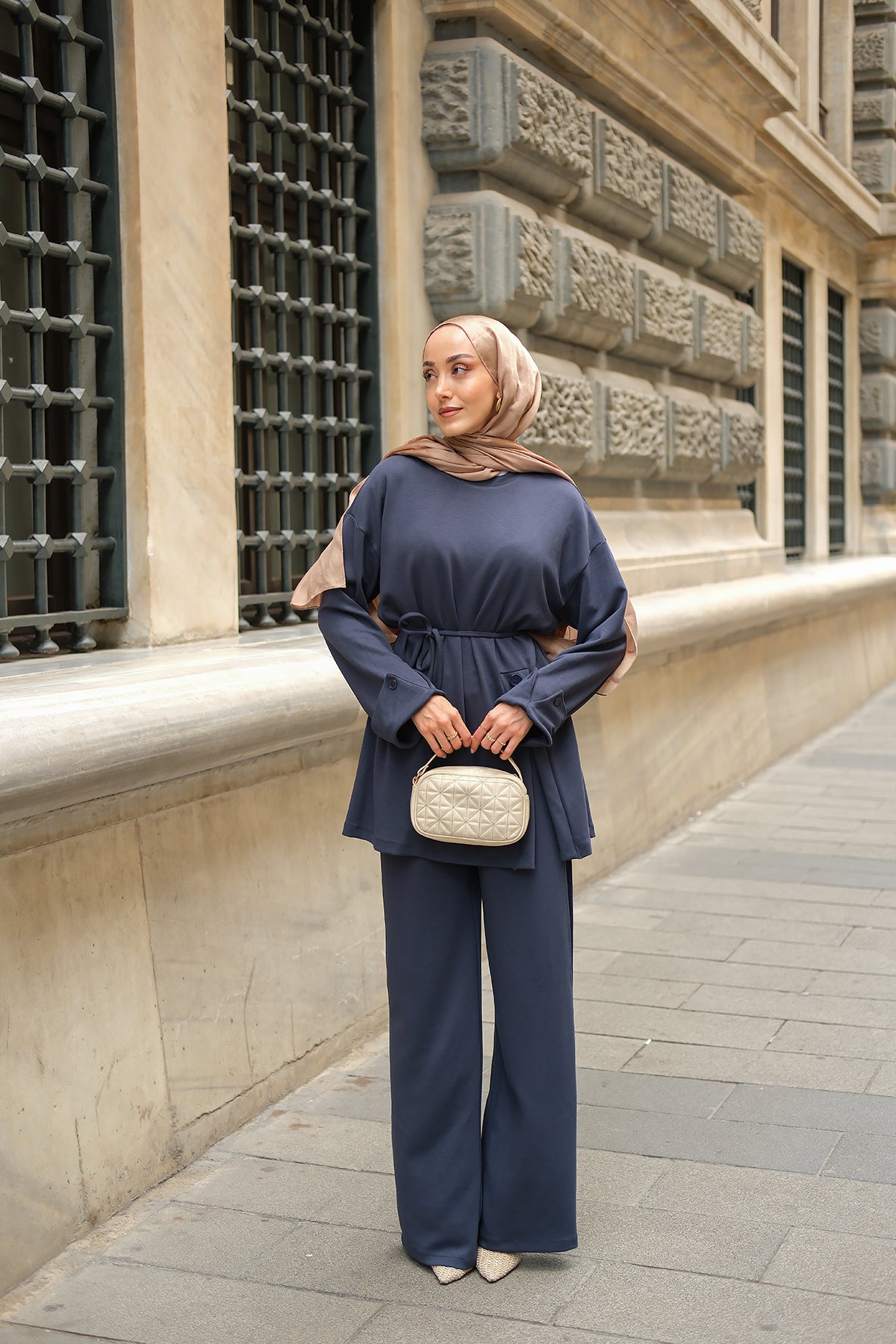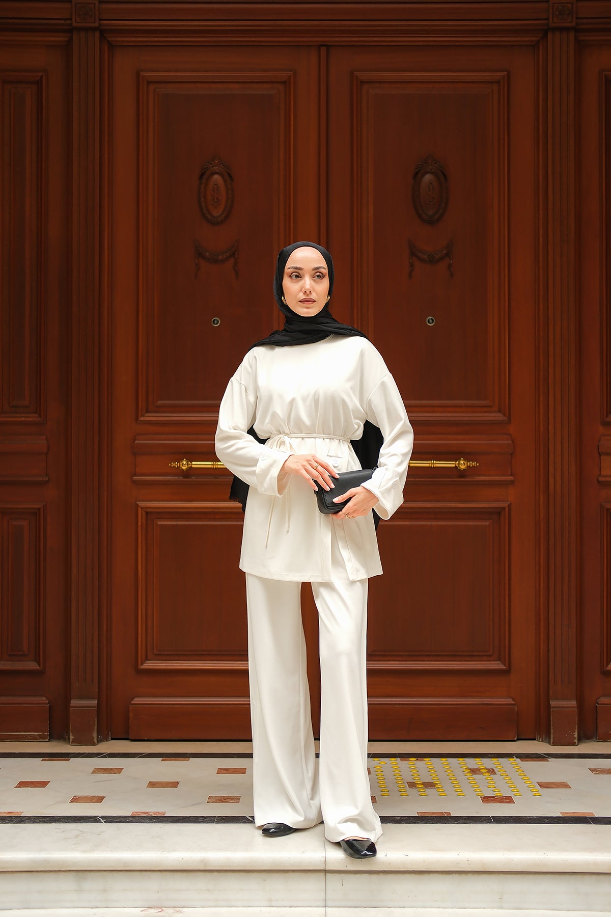 Yan Düğme Detay Takım Ekru