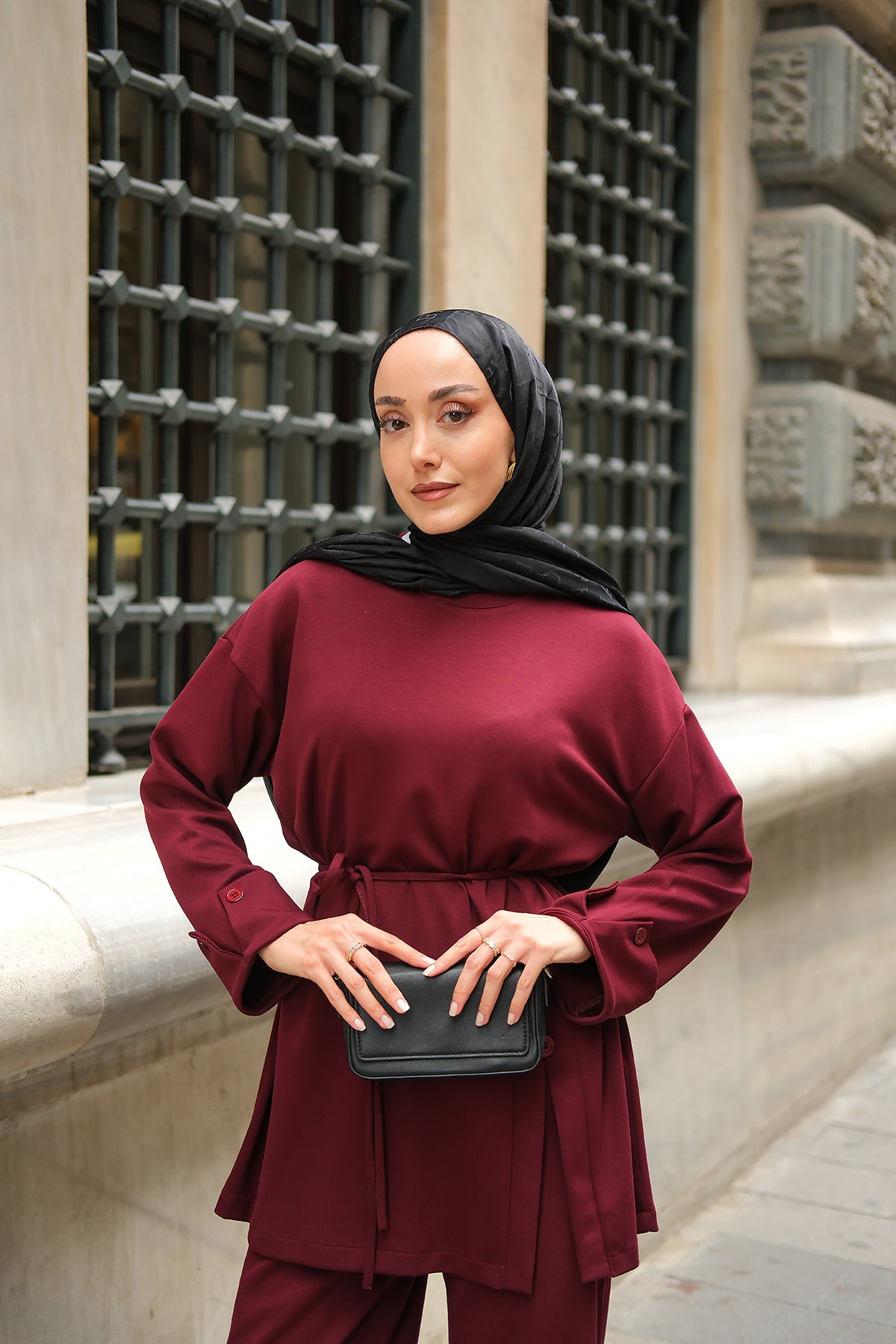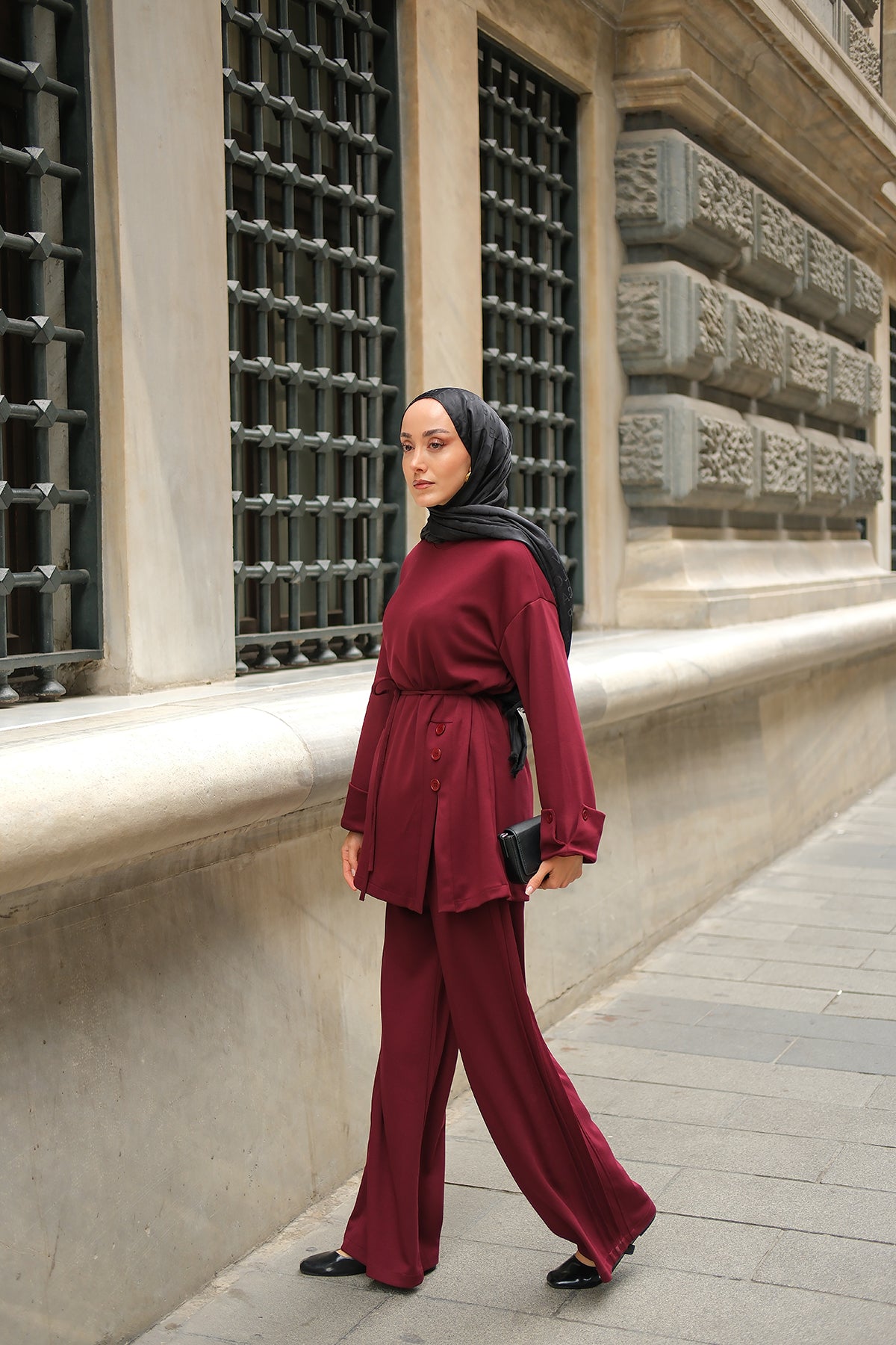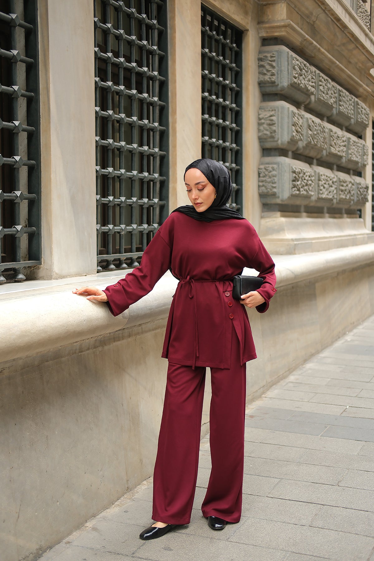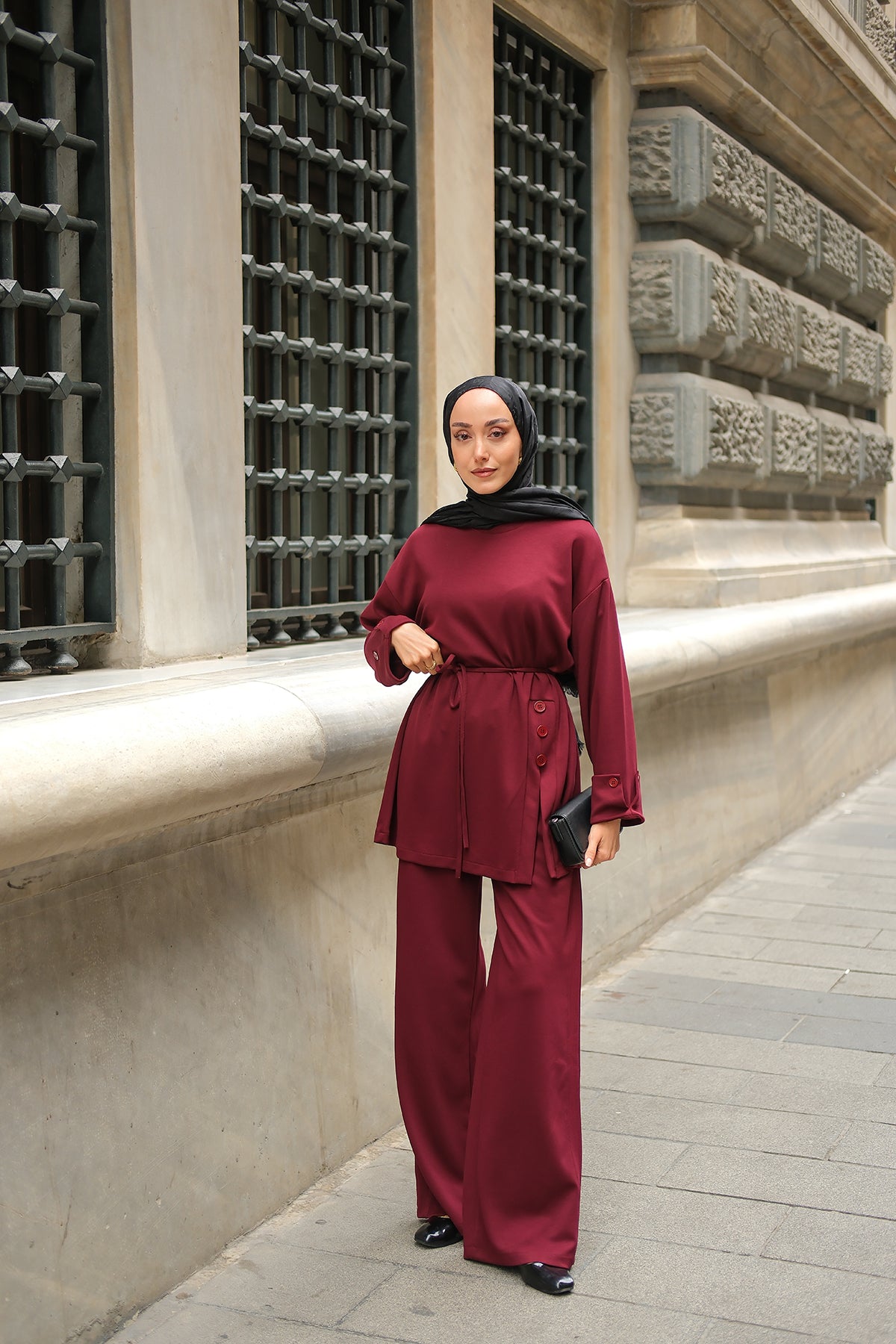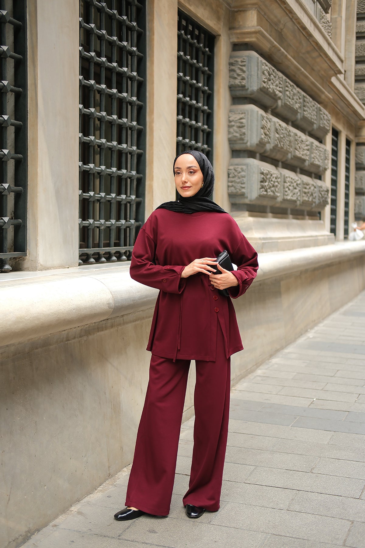 Yan Düğme Detay Takım Bordo