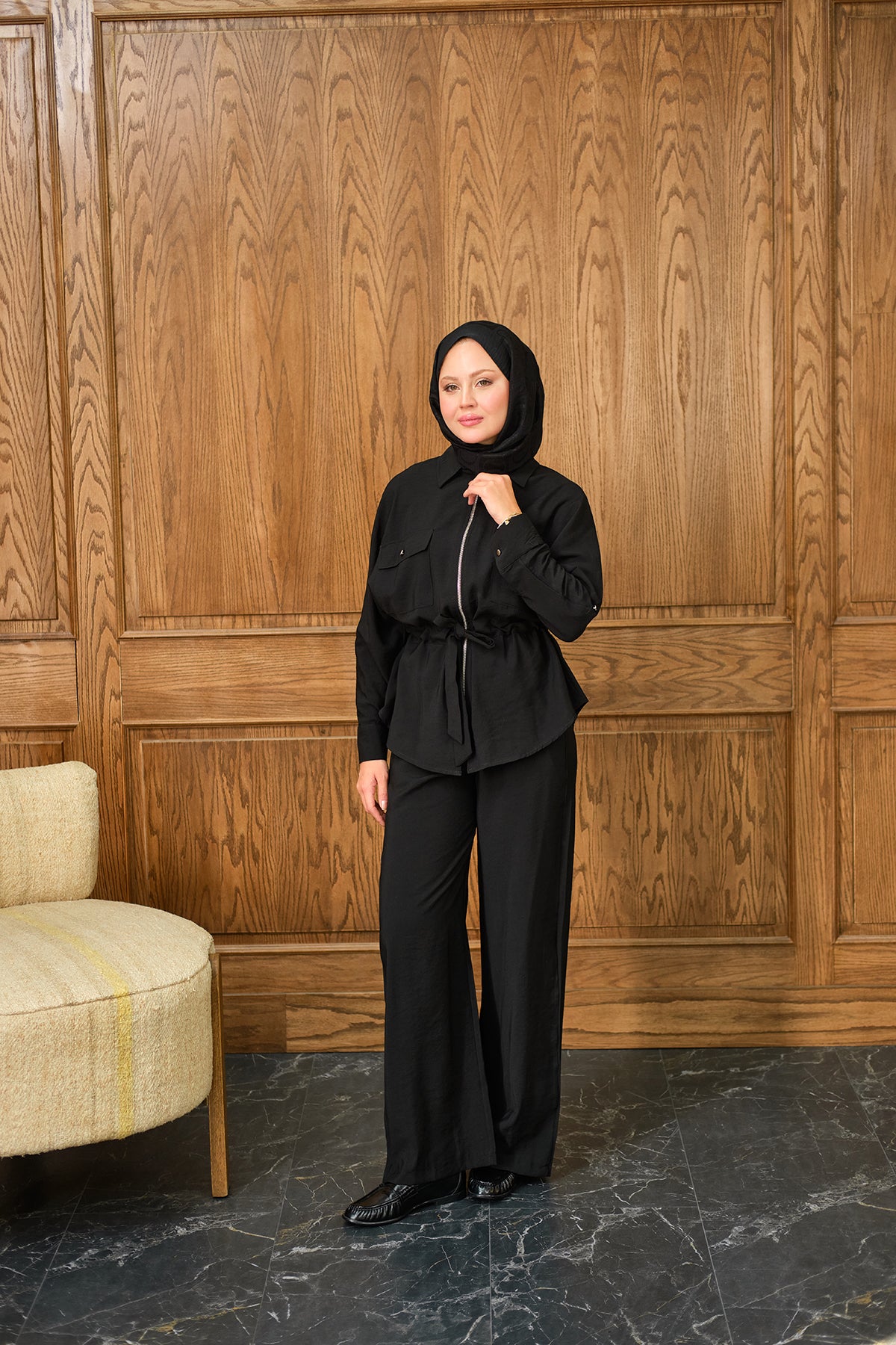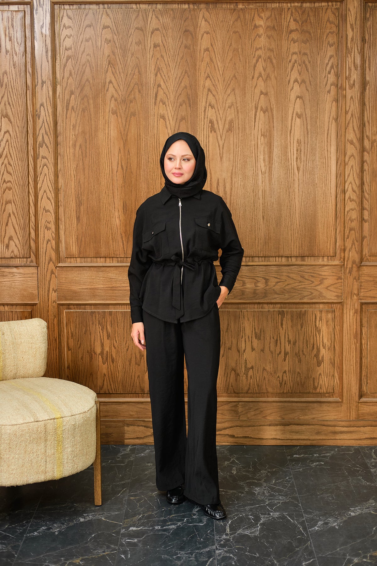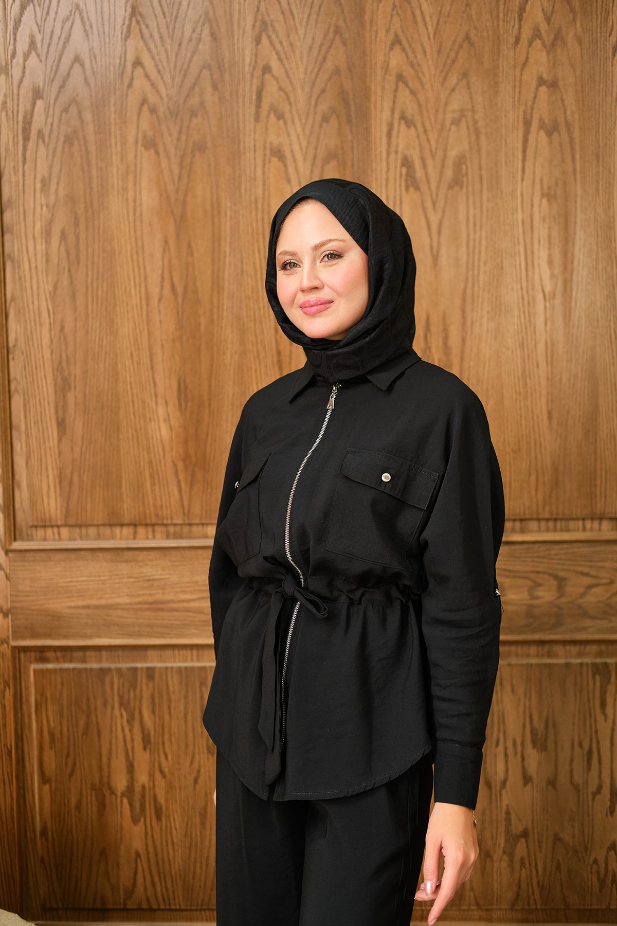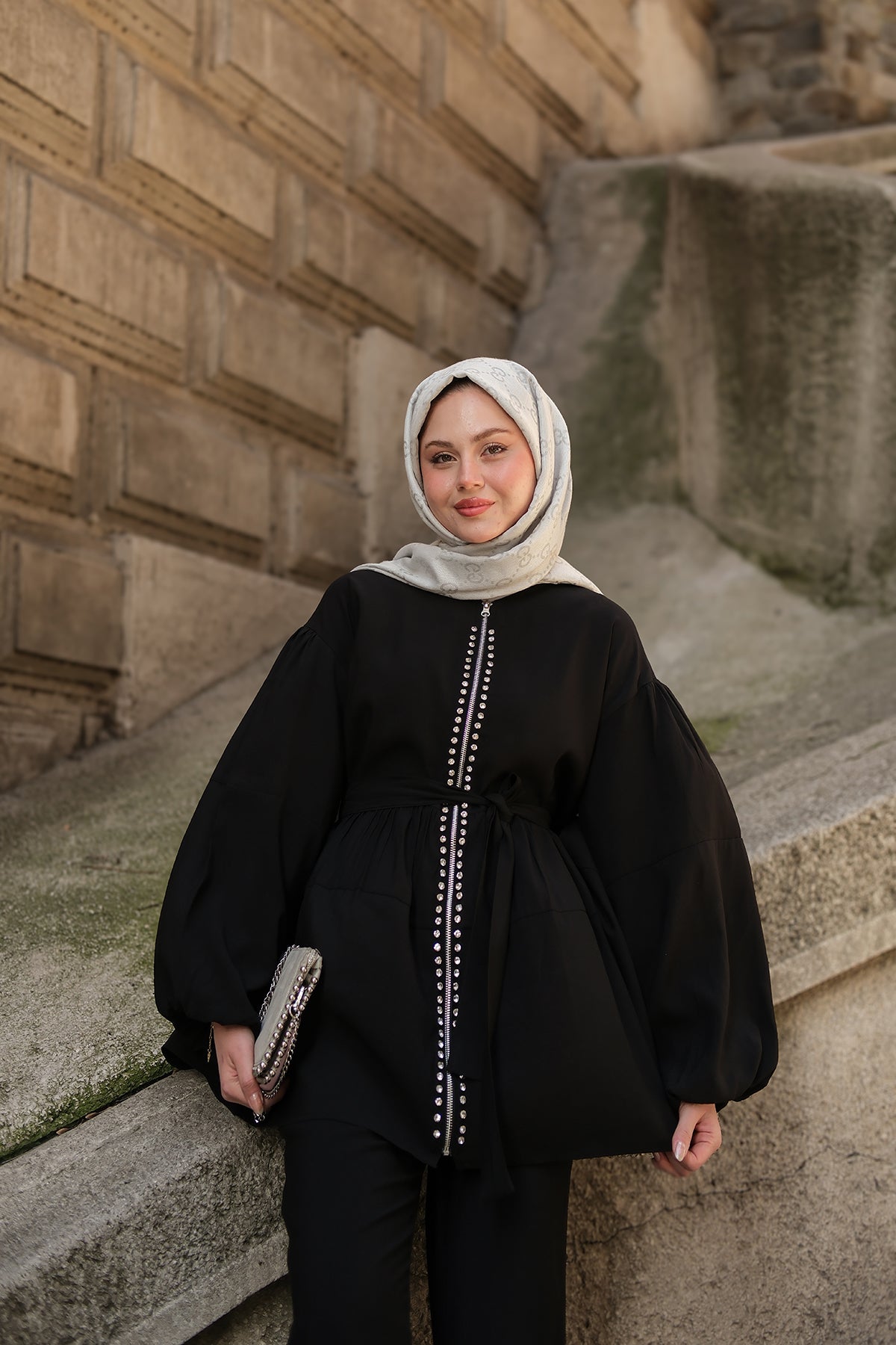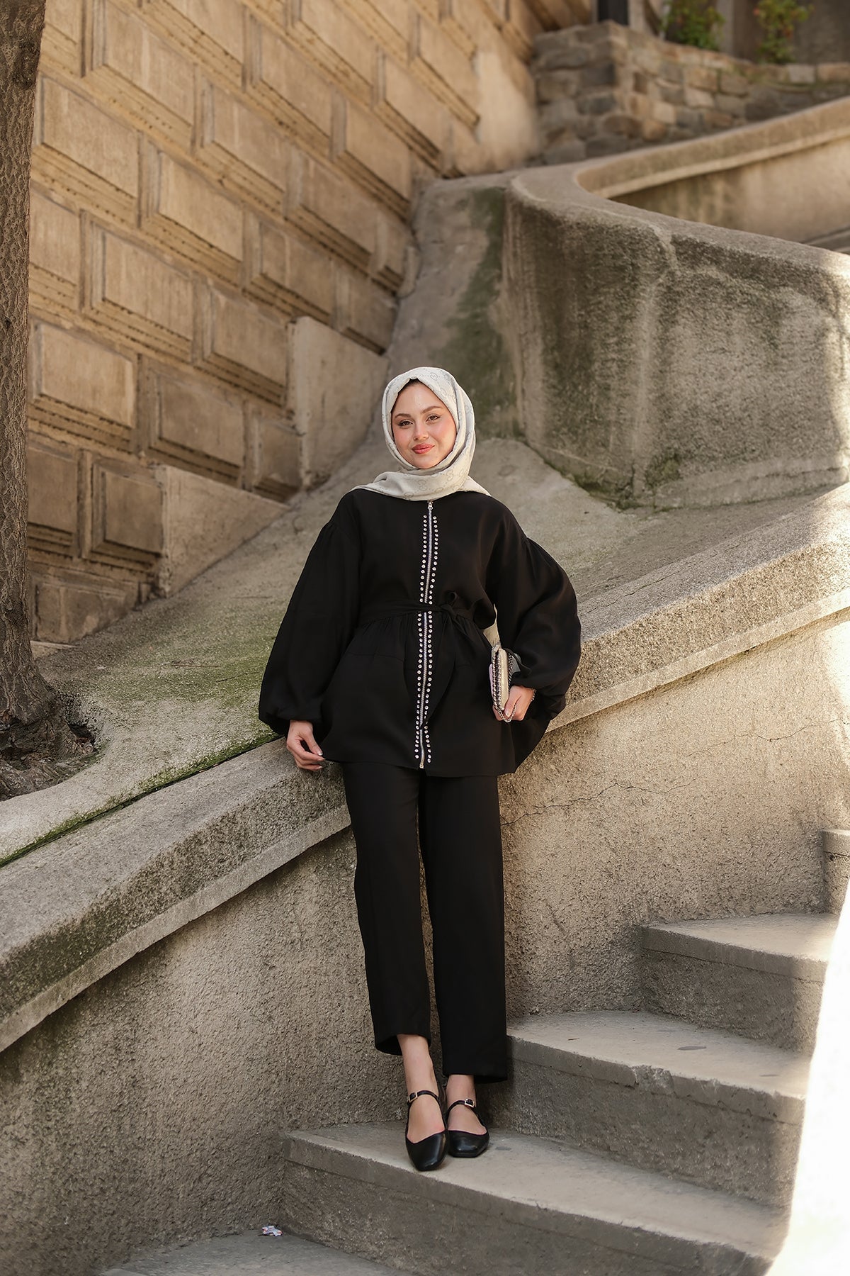 Zippered Two-Piece Set with Stone Details in Black
