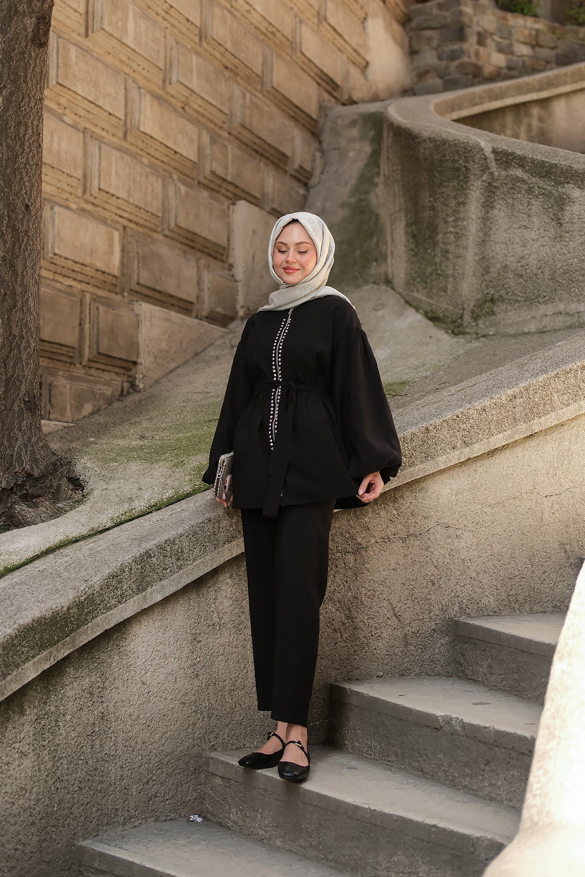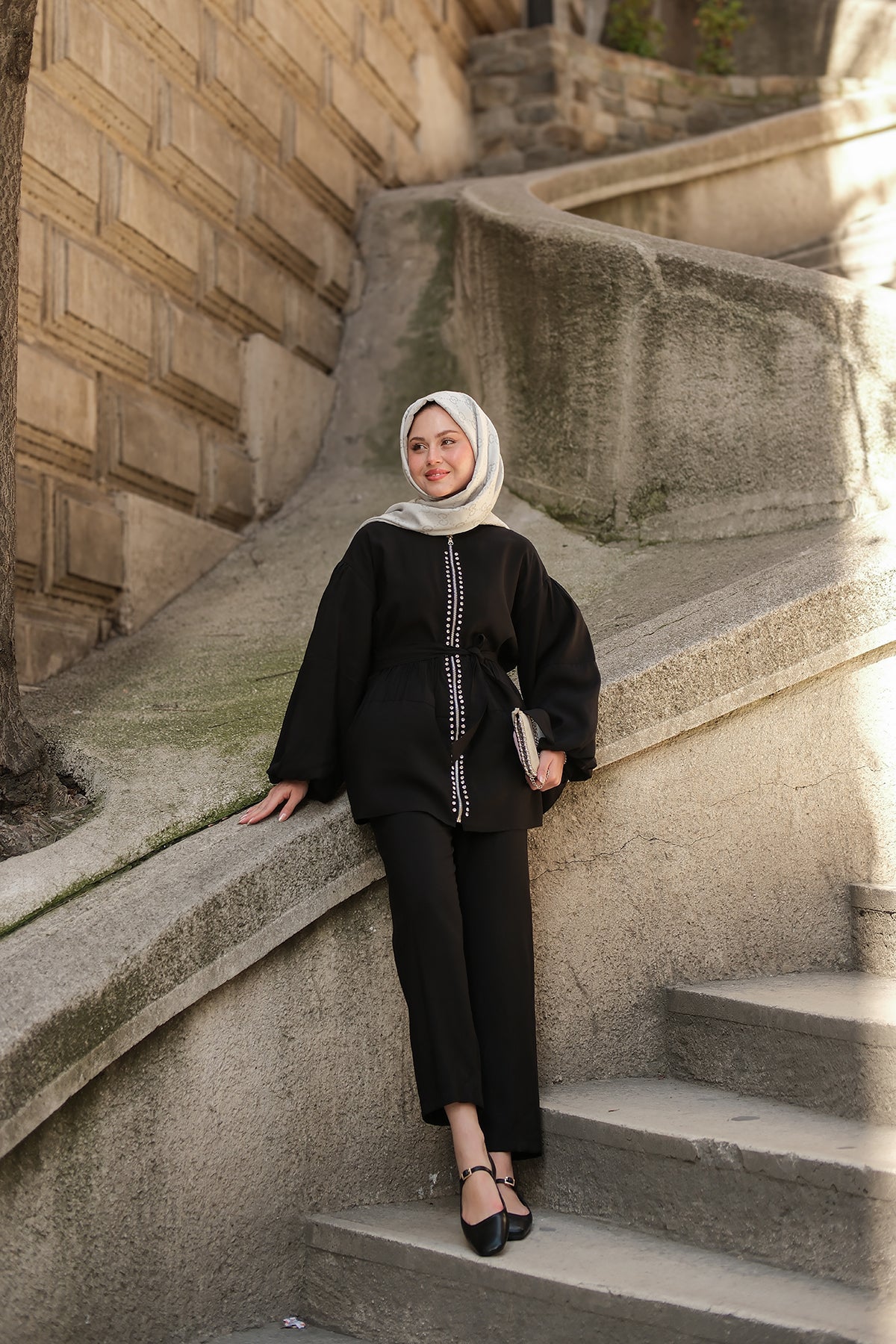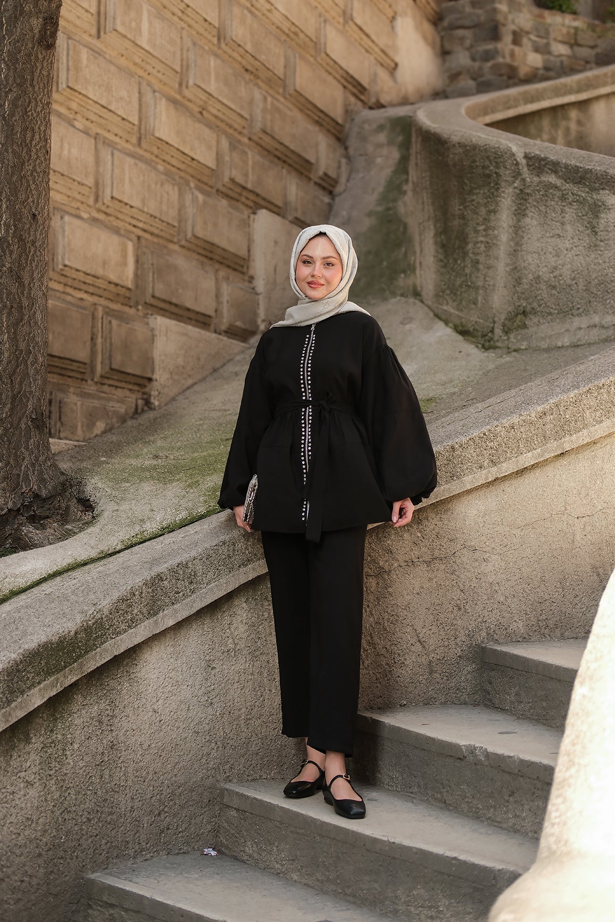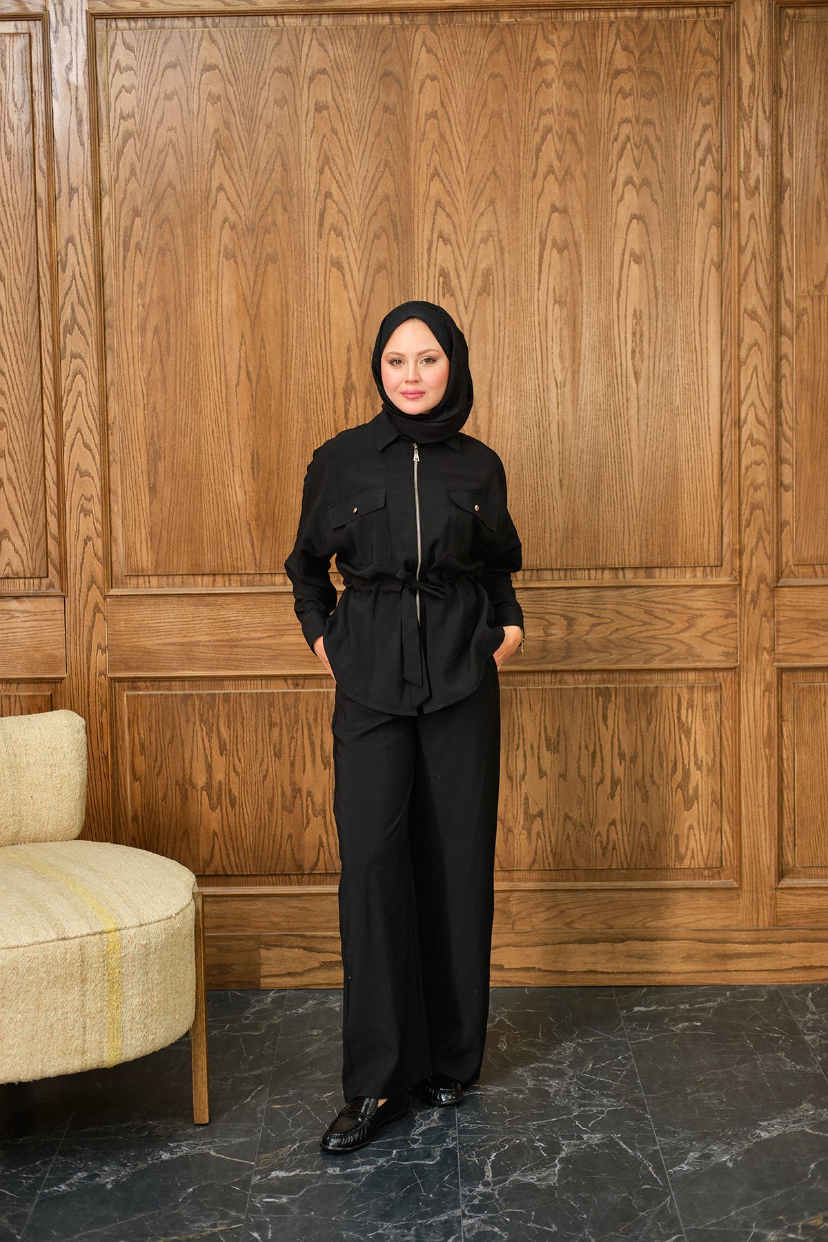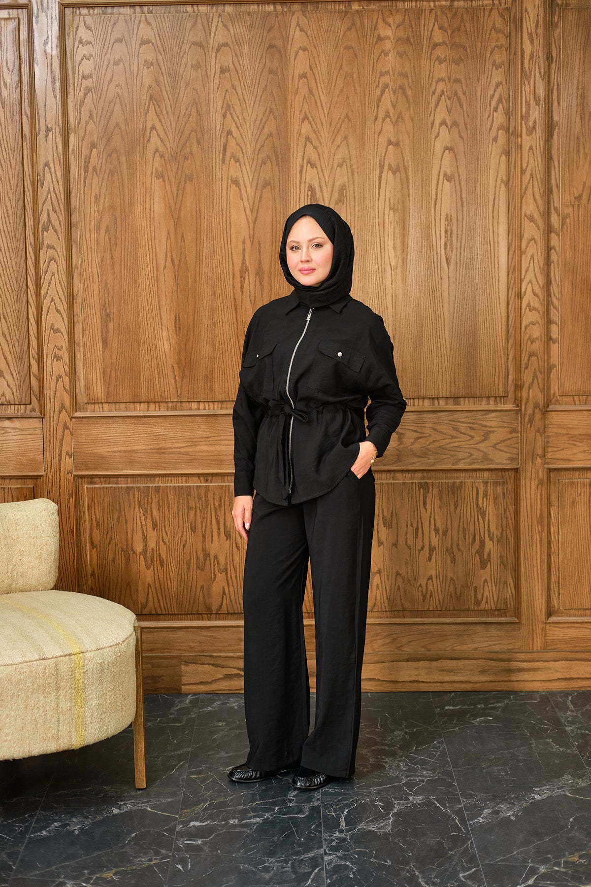 Zippered Two-Piece Set with Stone Details in Black