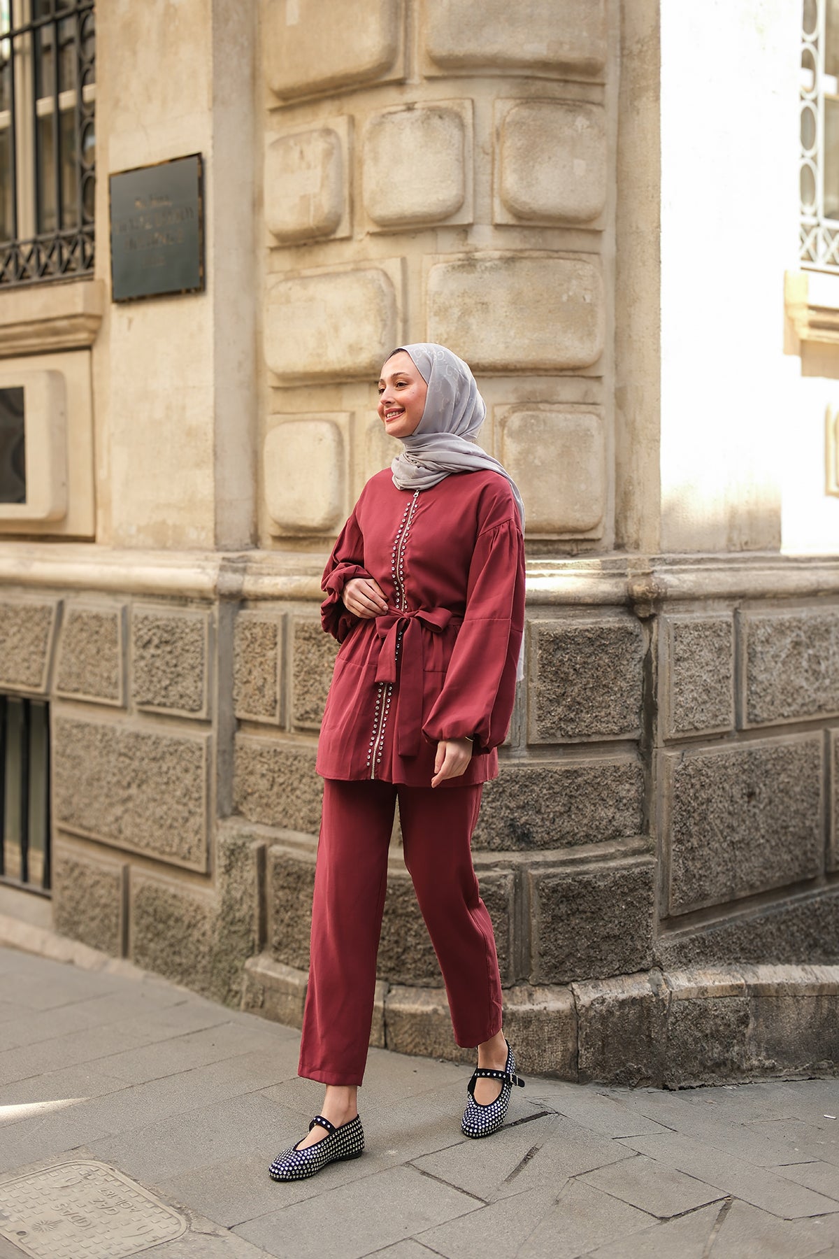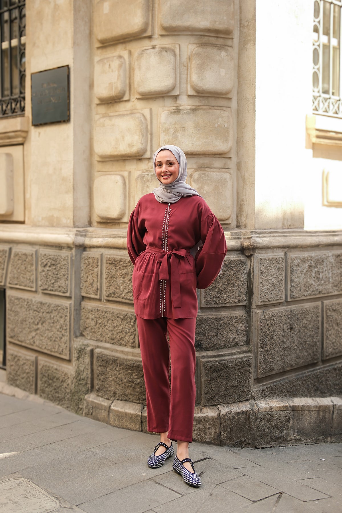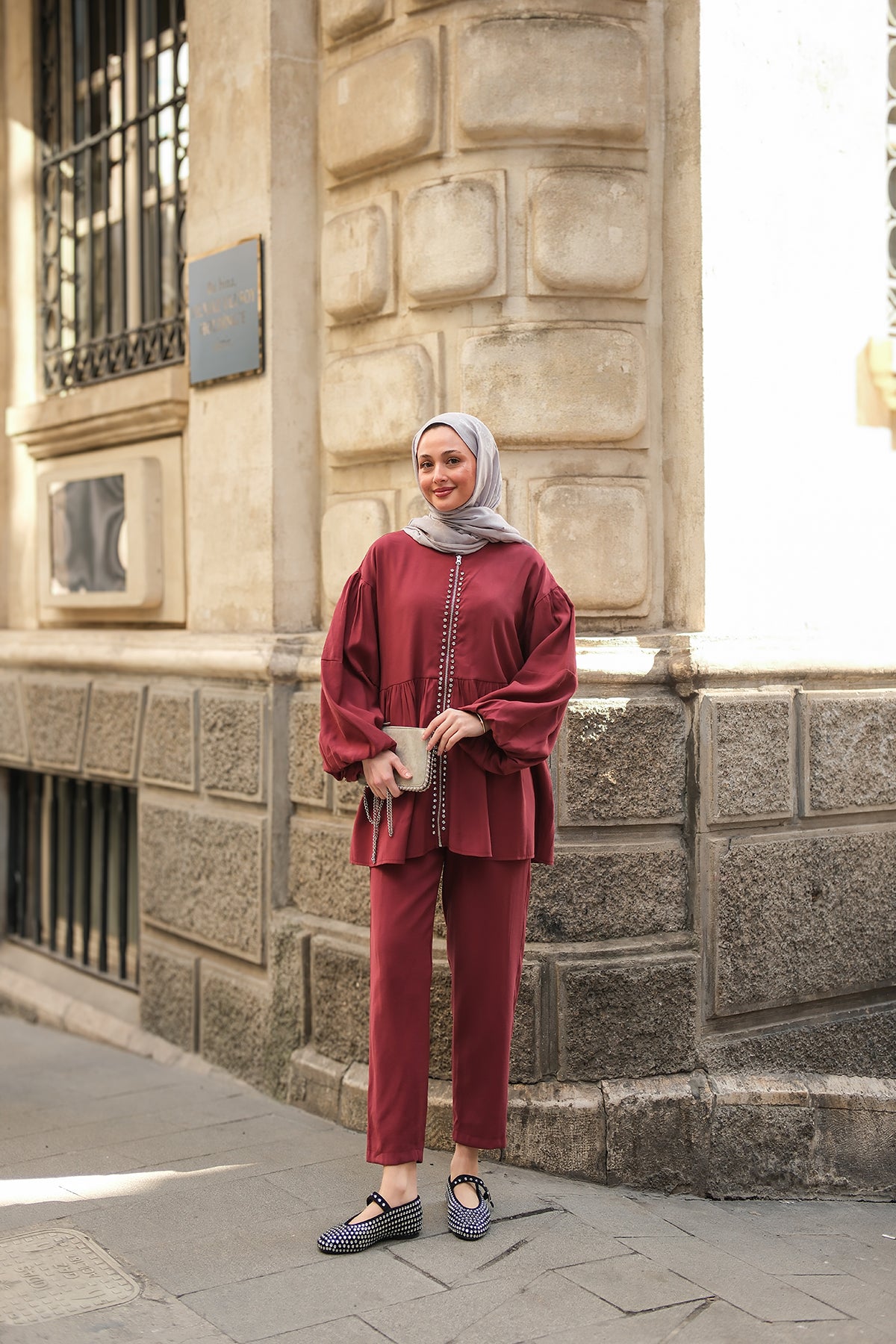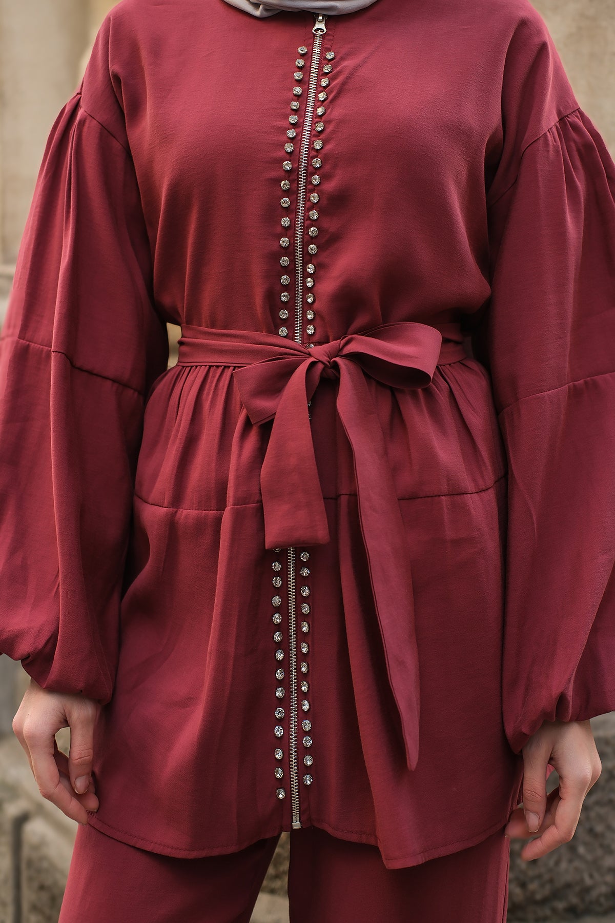 Zippered Stone-Detail Two-Piece Suit - Burgundy