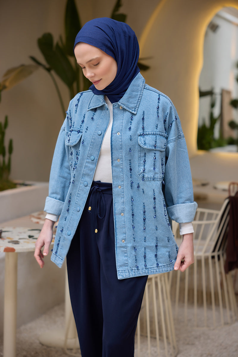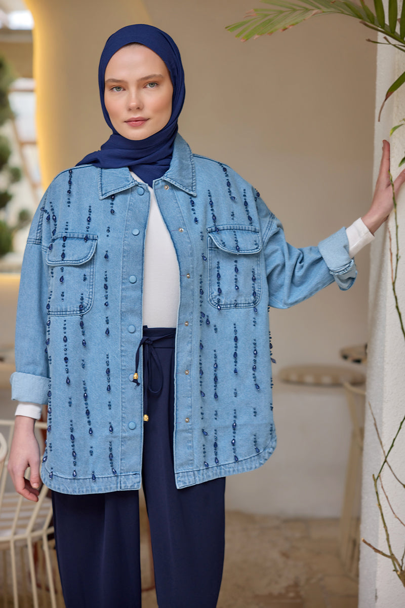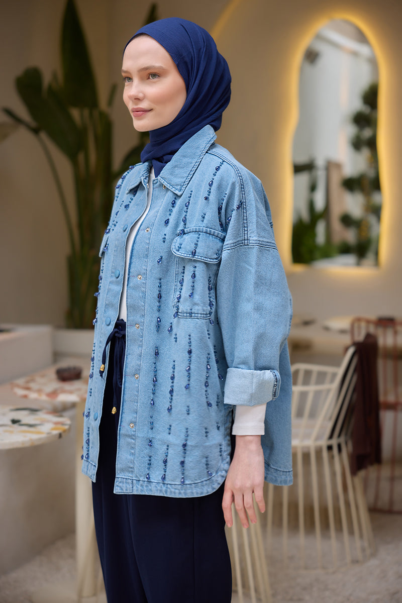 Bead Embroidered Jean Jacket Ice Blue