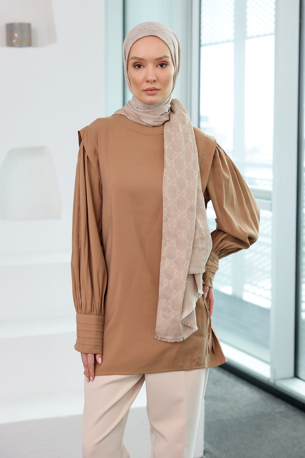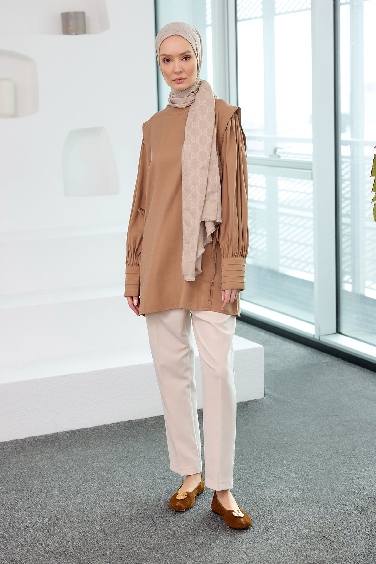 Beige Set with Contrast Colored Blouse