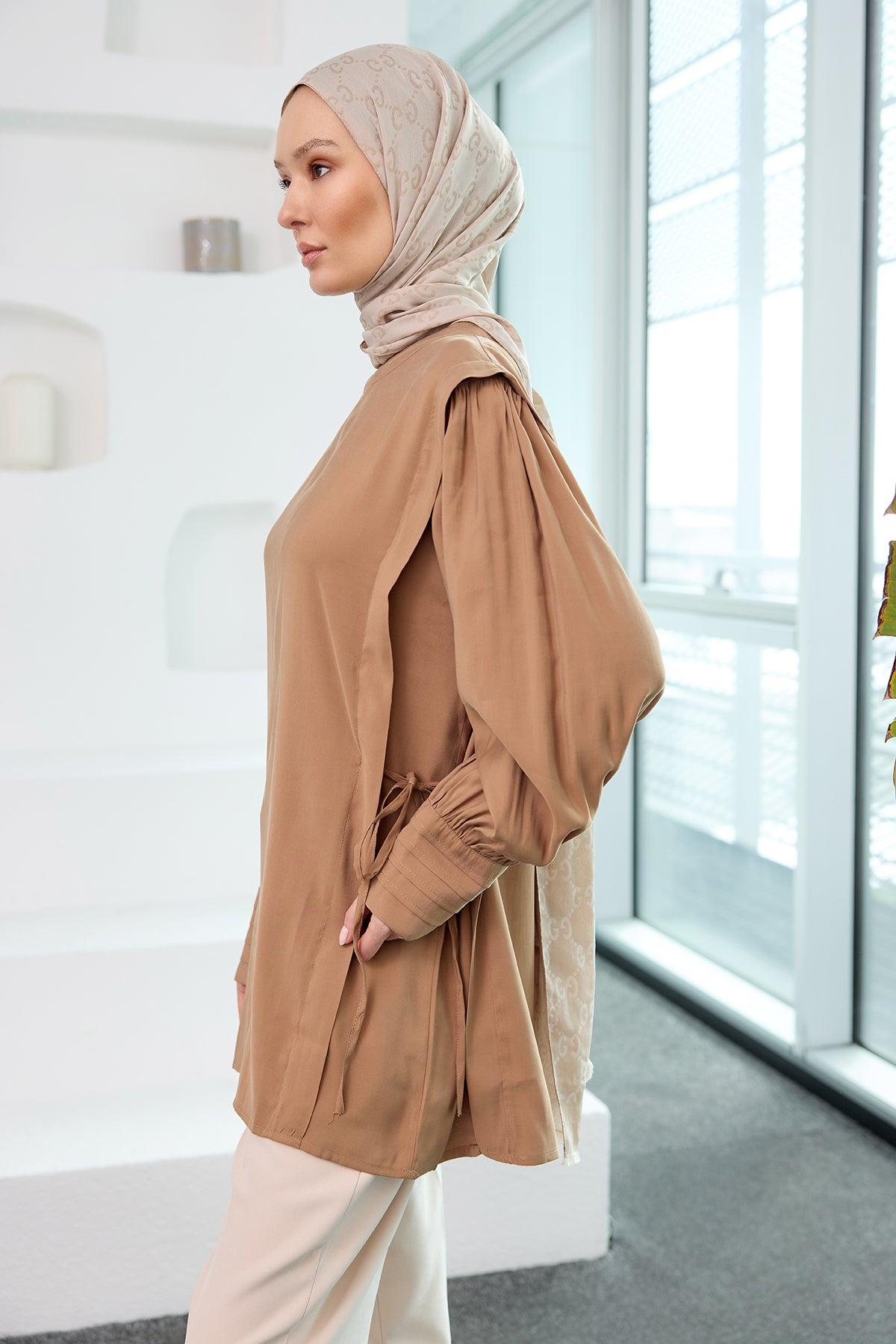 Beige Cupro Tencel Tunic with Piping Detail