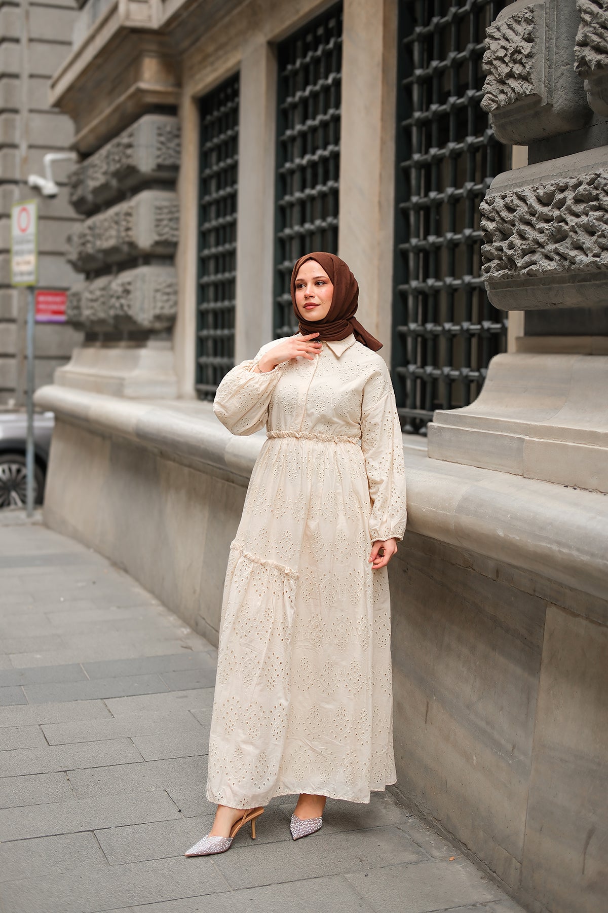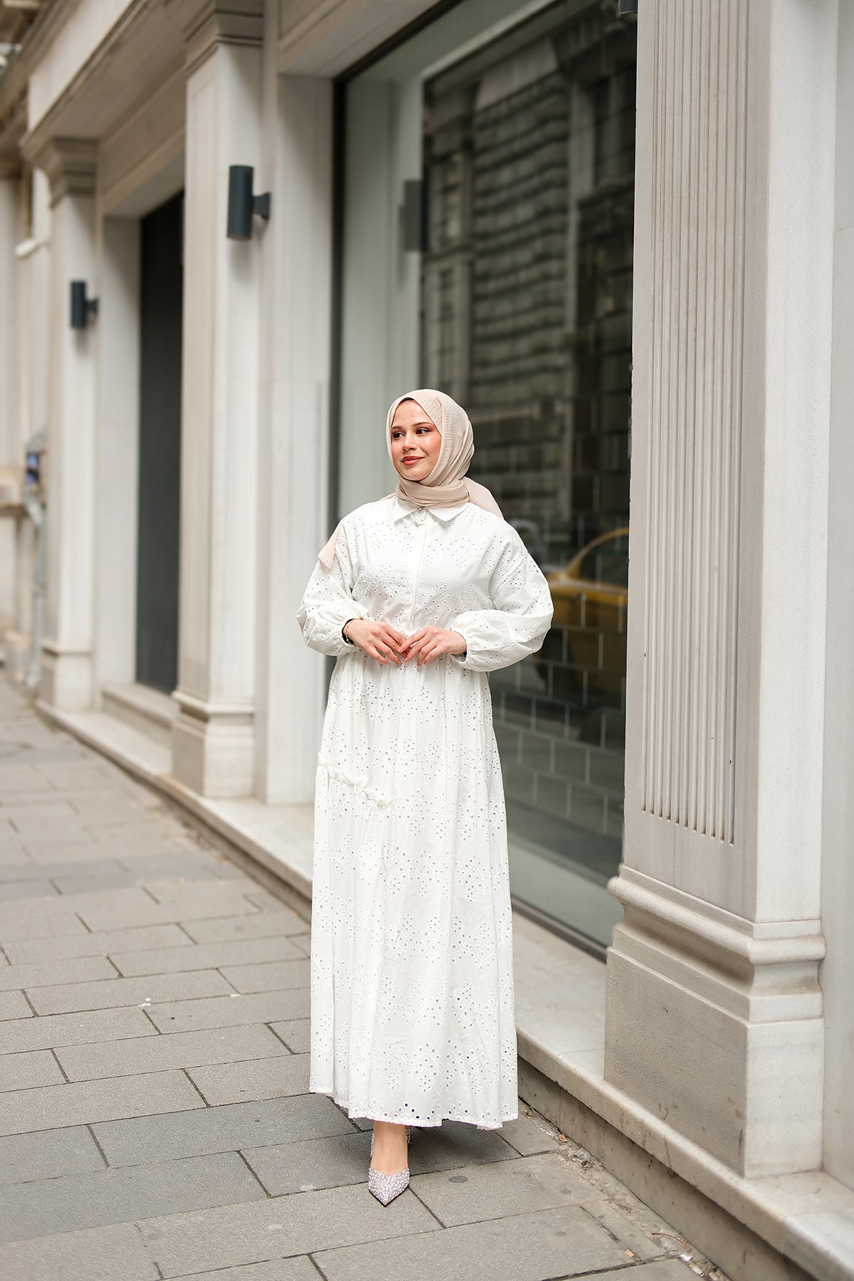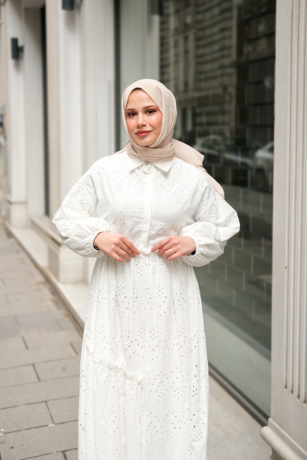 Elastic-Waist Broderie Dress - Cream