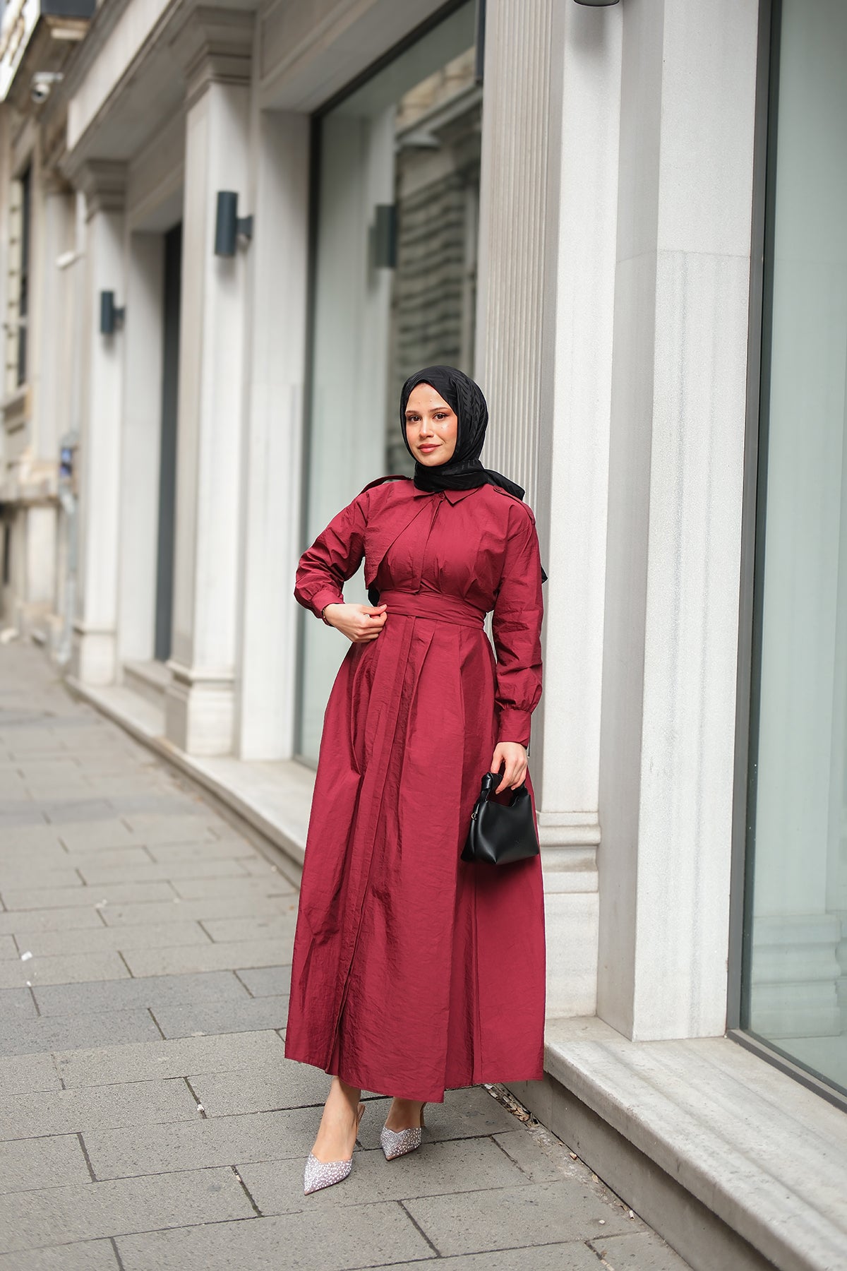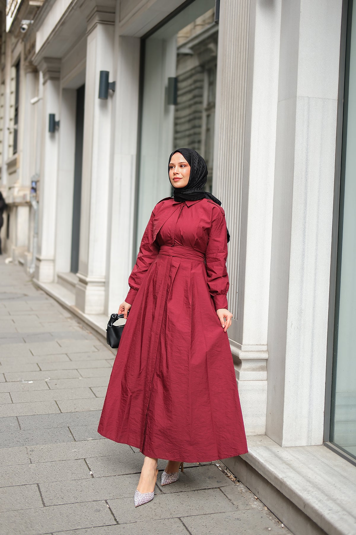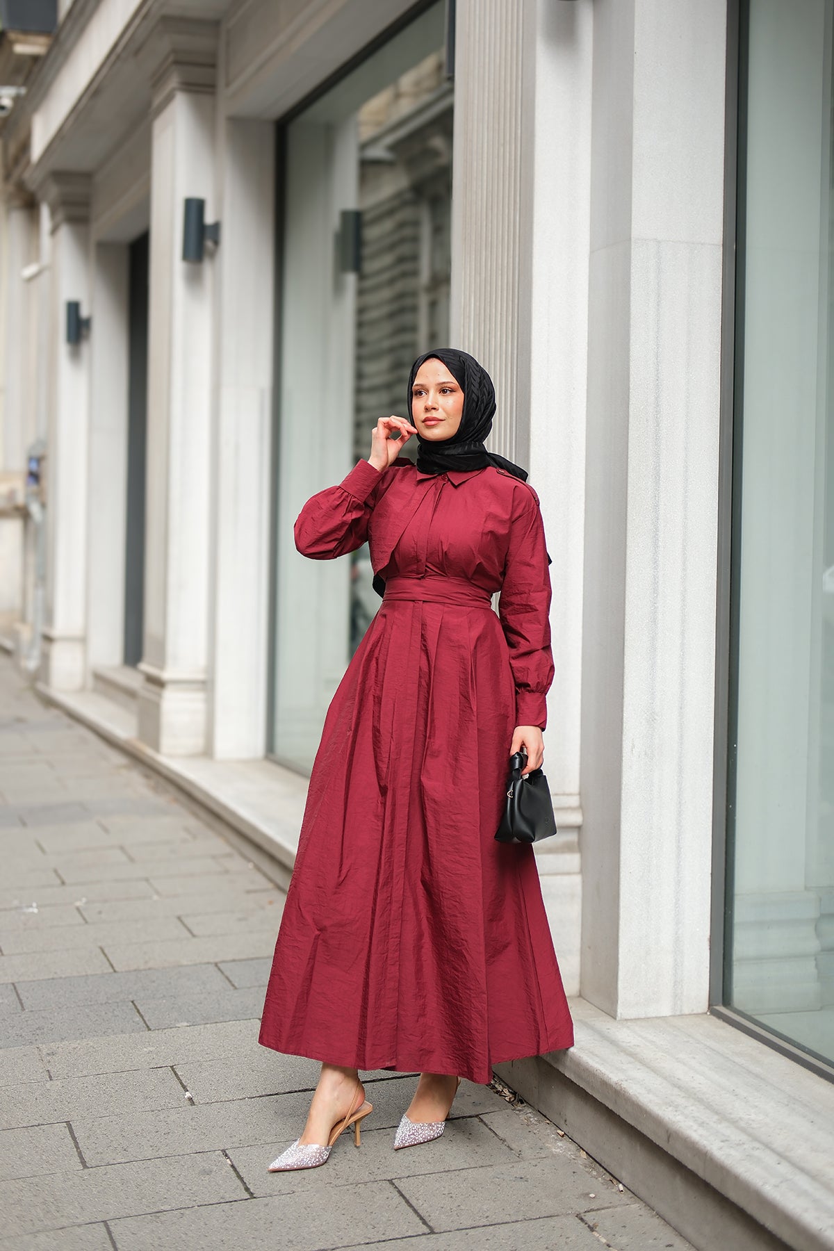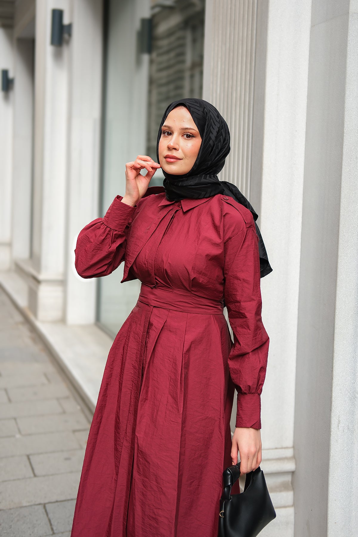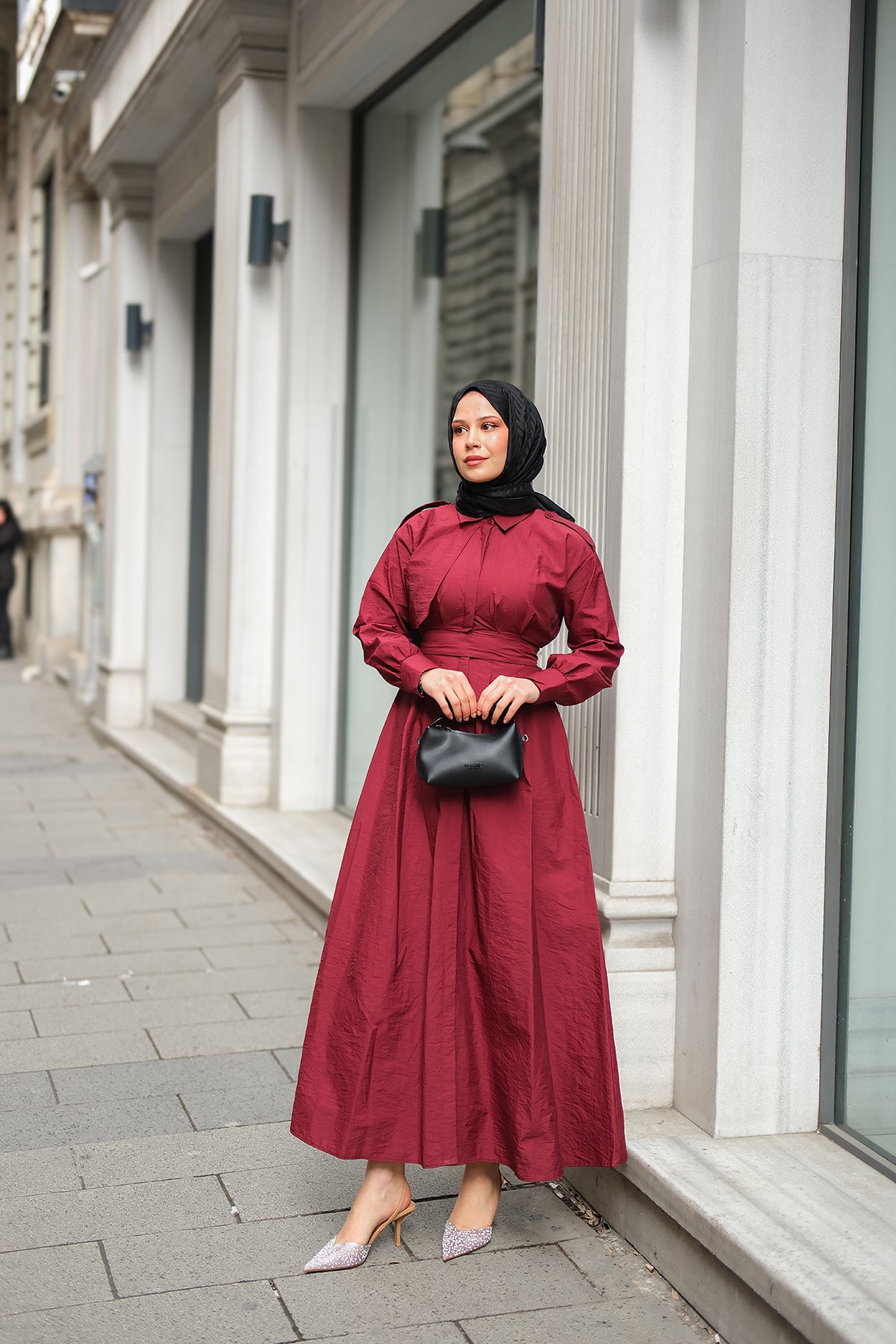 Concealed-Button Epaulette-Detail Dress - Burgundy