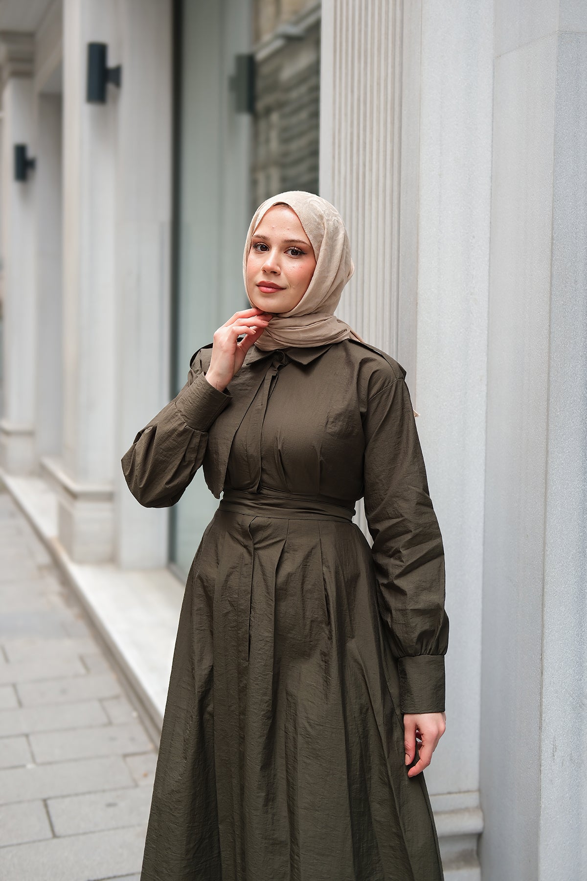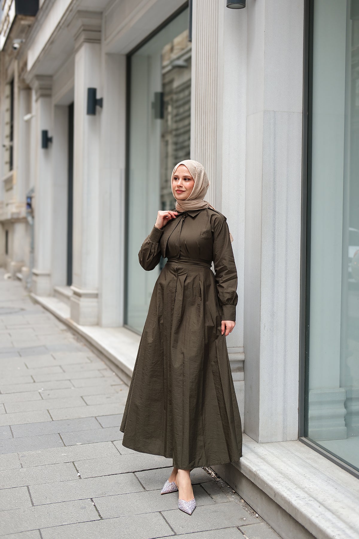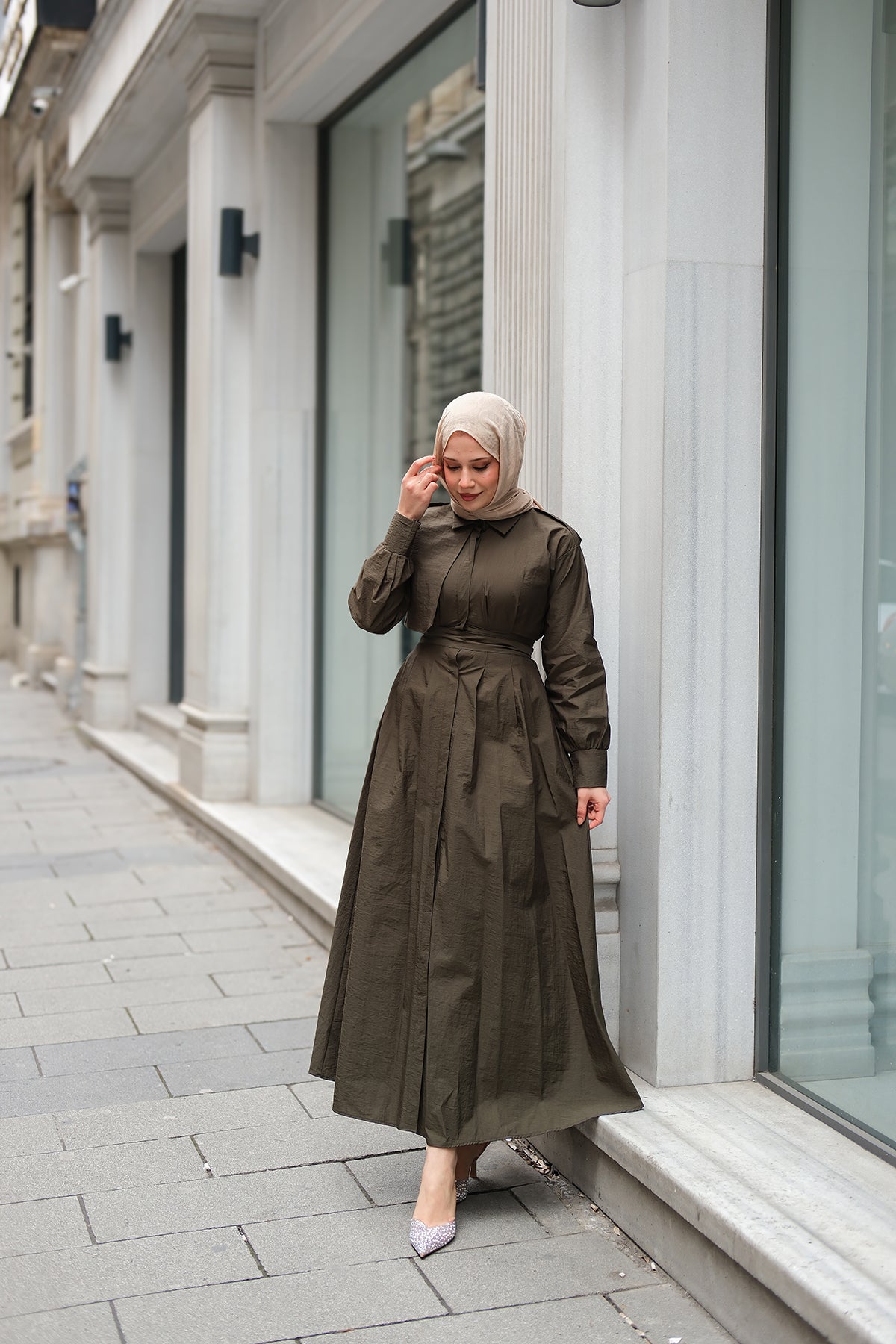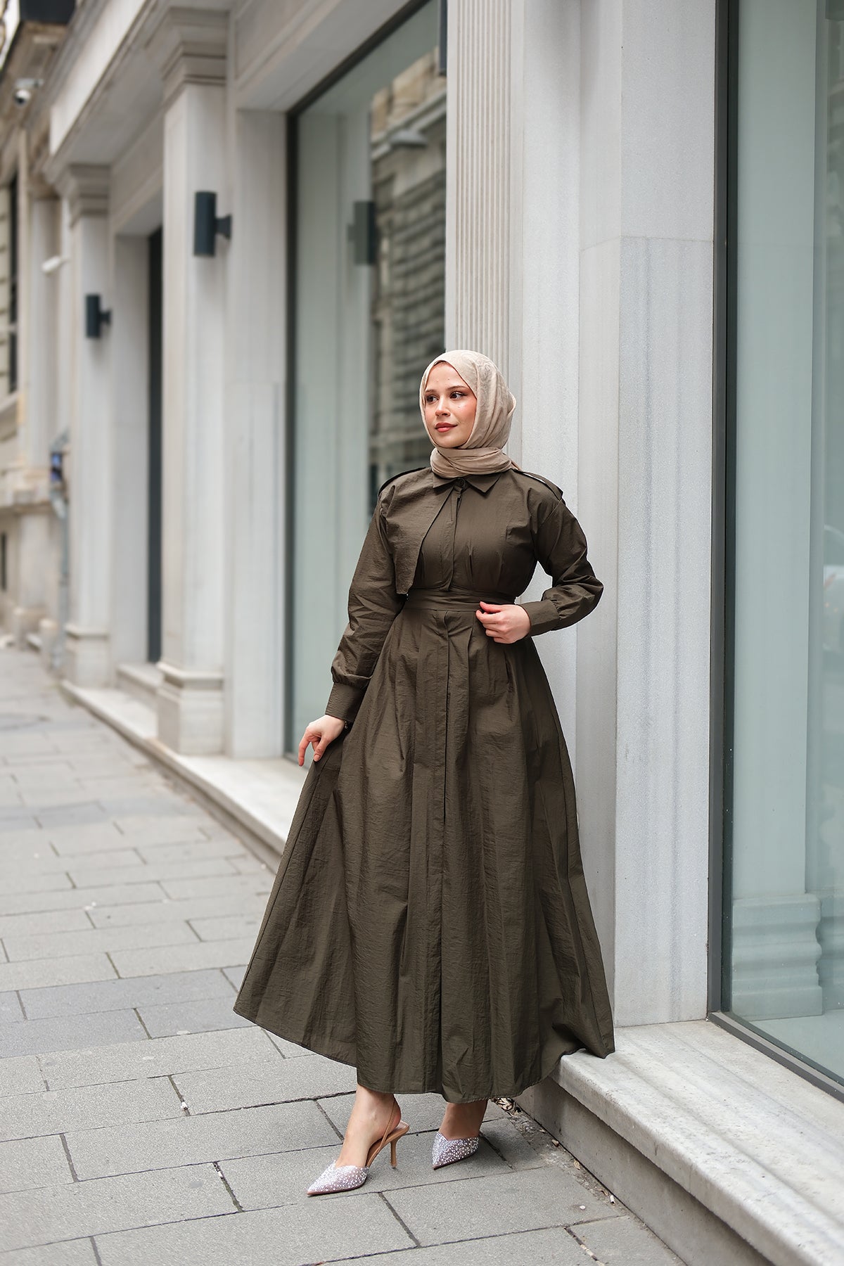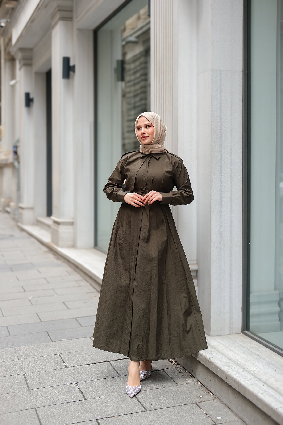 Concealed-Button Epaulette-Detail Dress - Khaki Green