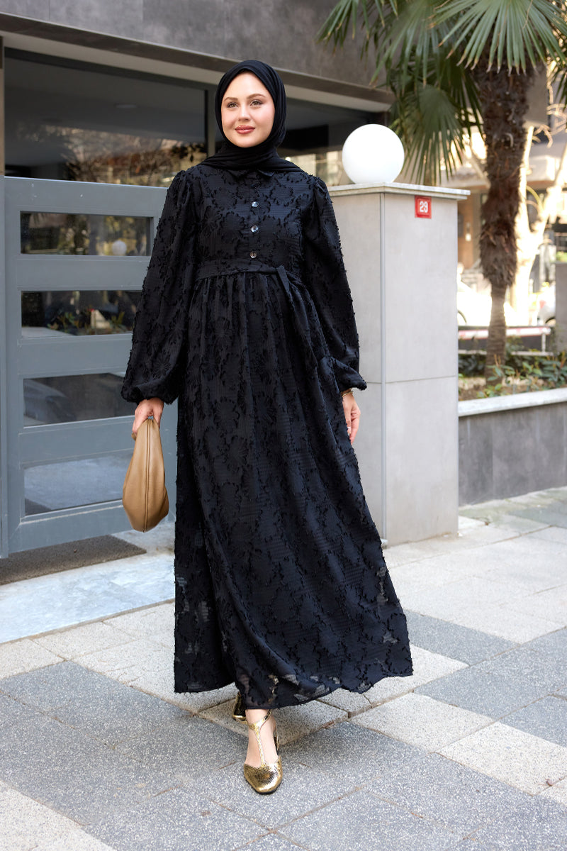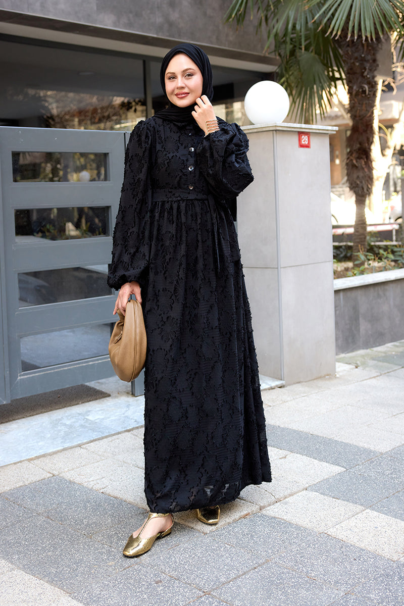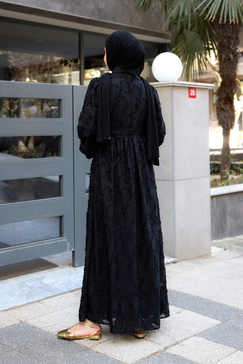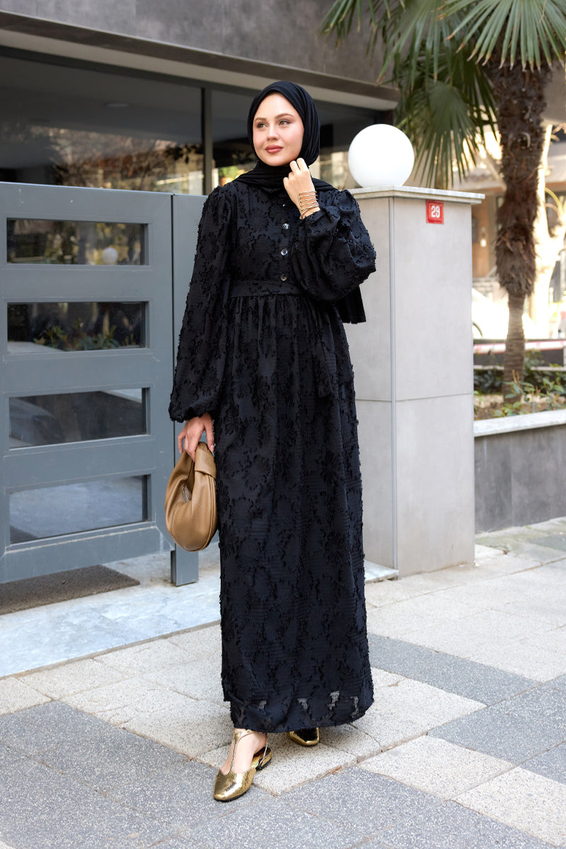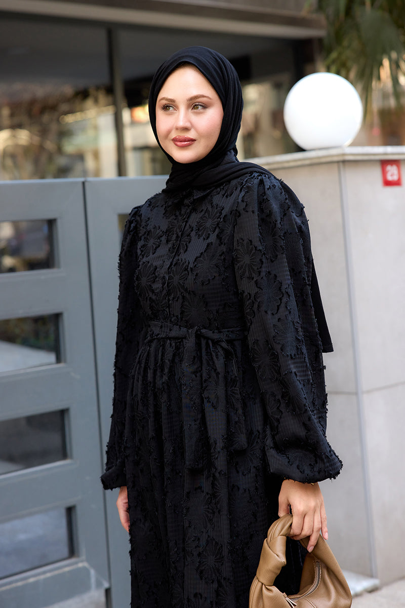 Burnout Floral-Pattern Jacquard Dress - Black