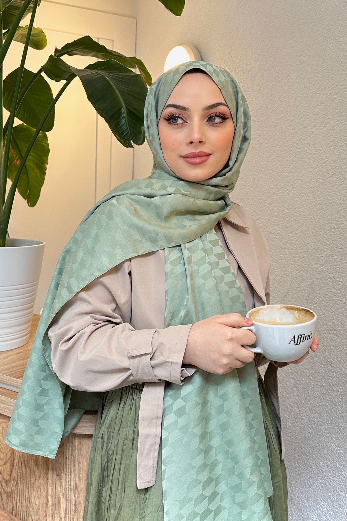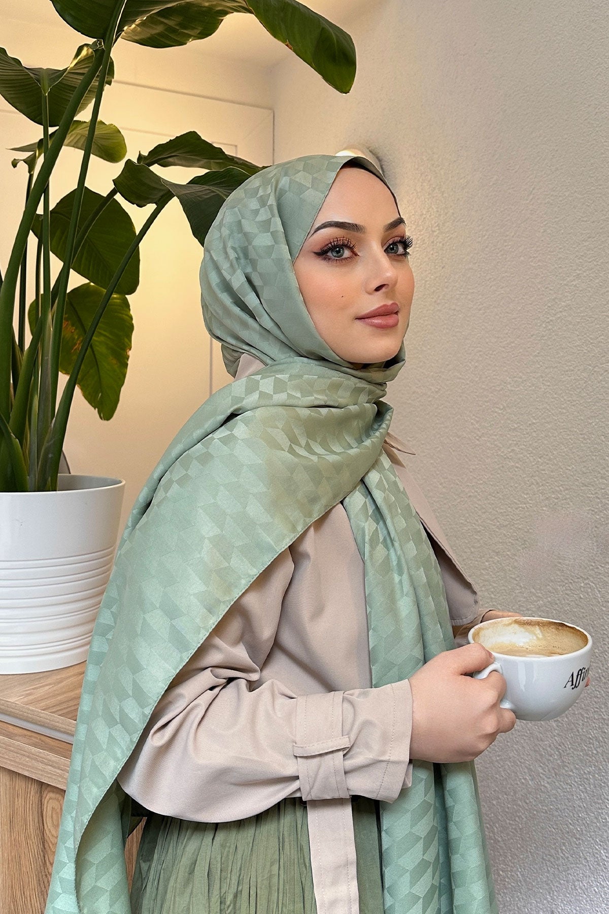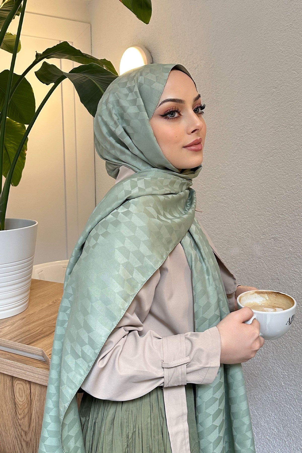 Mint Green Jacquard Shawl with Pyramid Pattern
