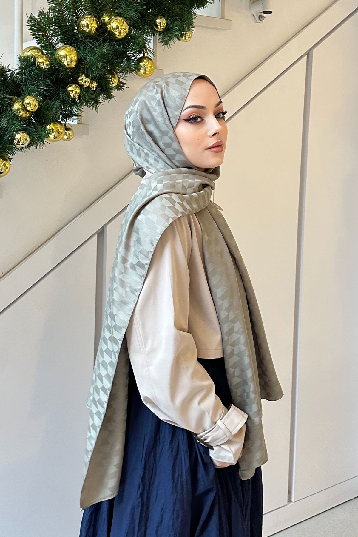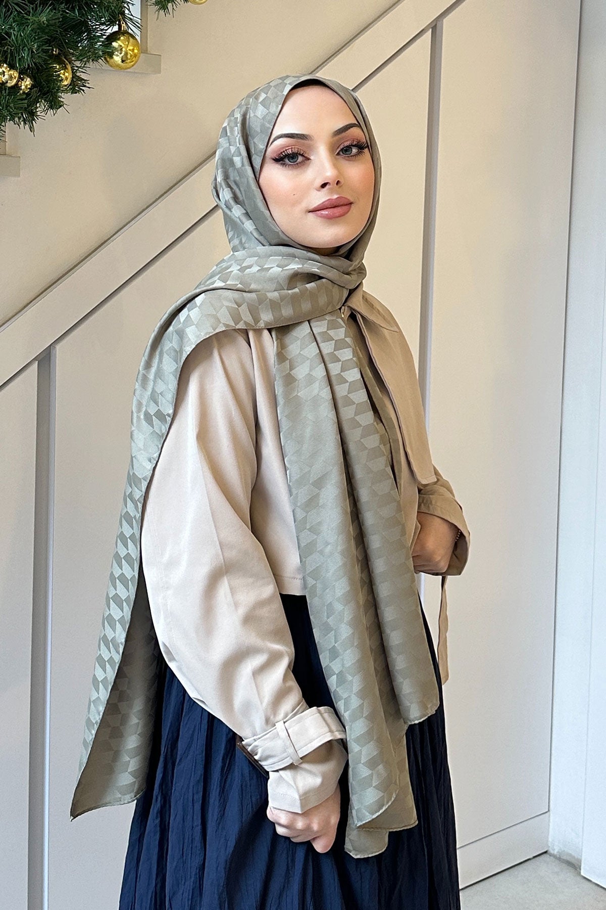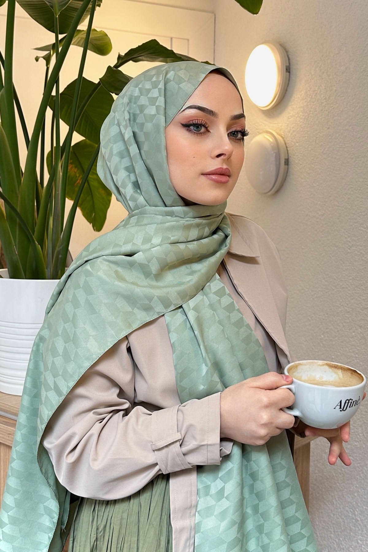Mint Green Jacquard Shawl with Pyramid Pattern