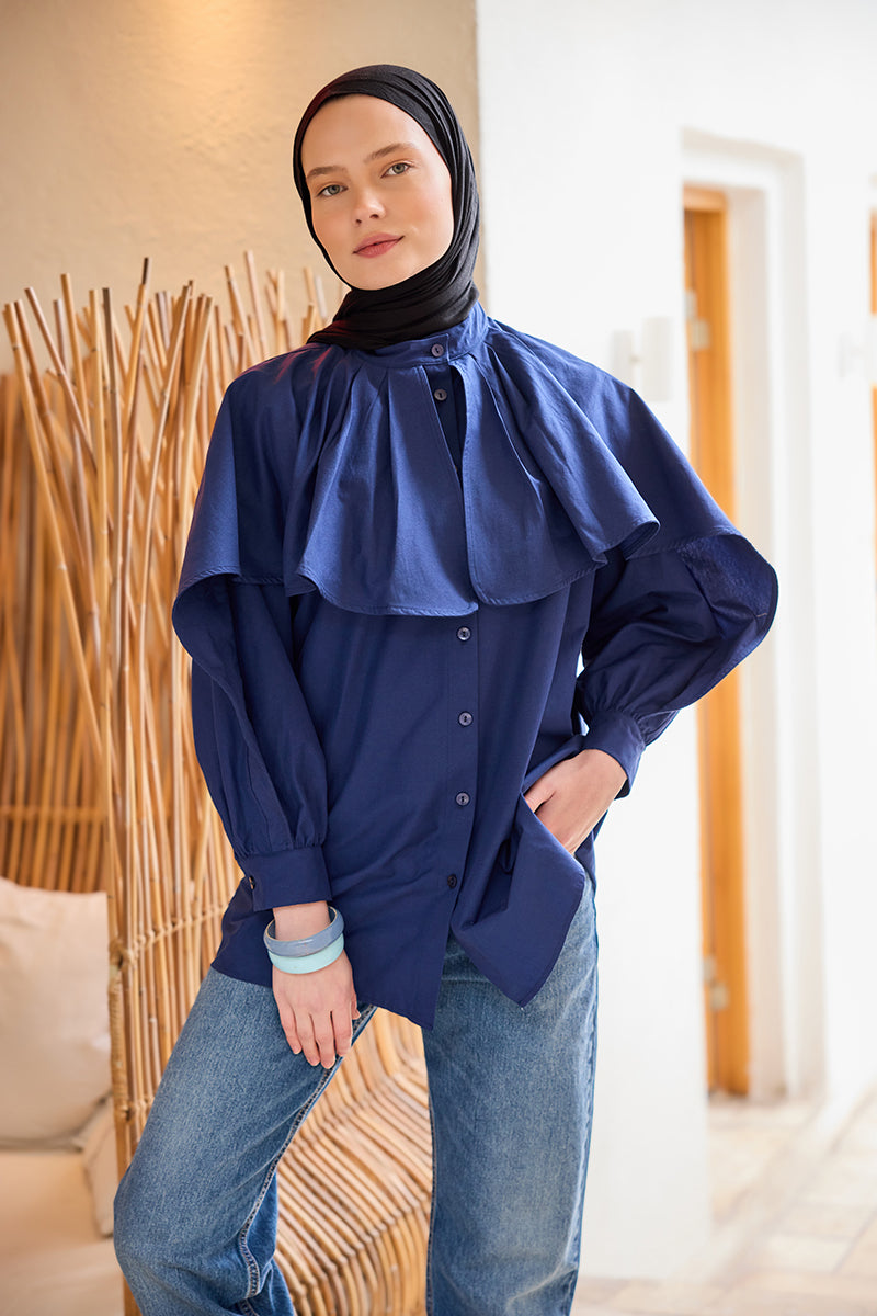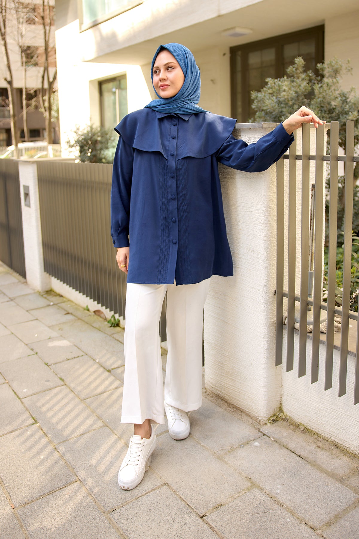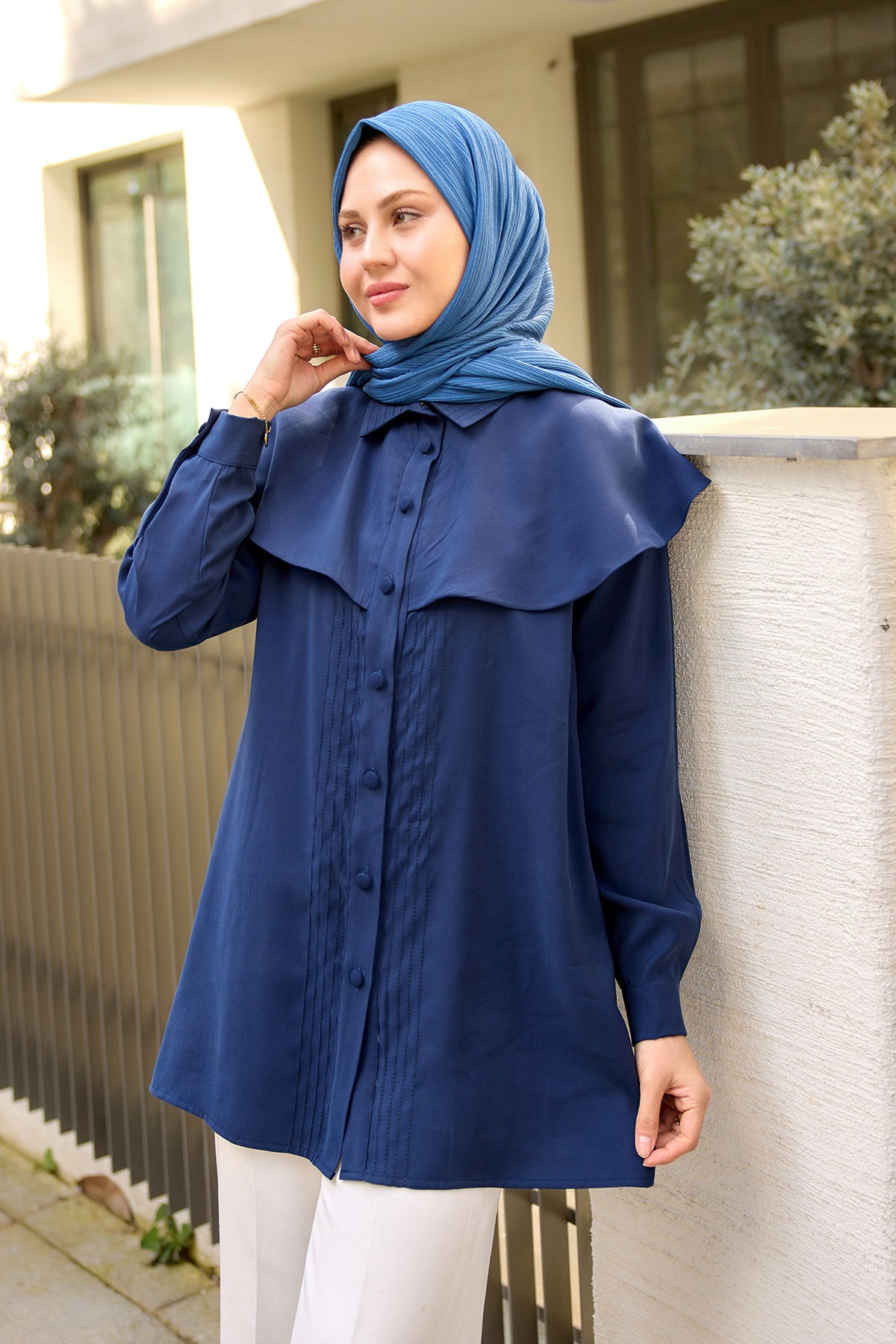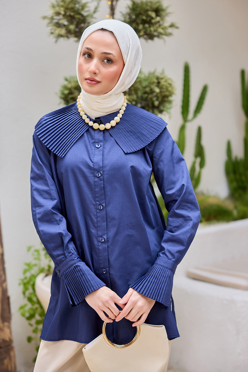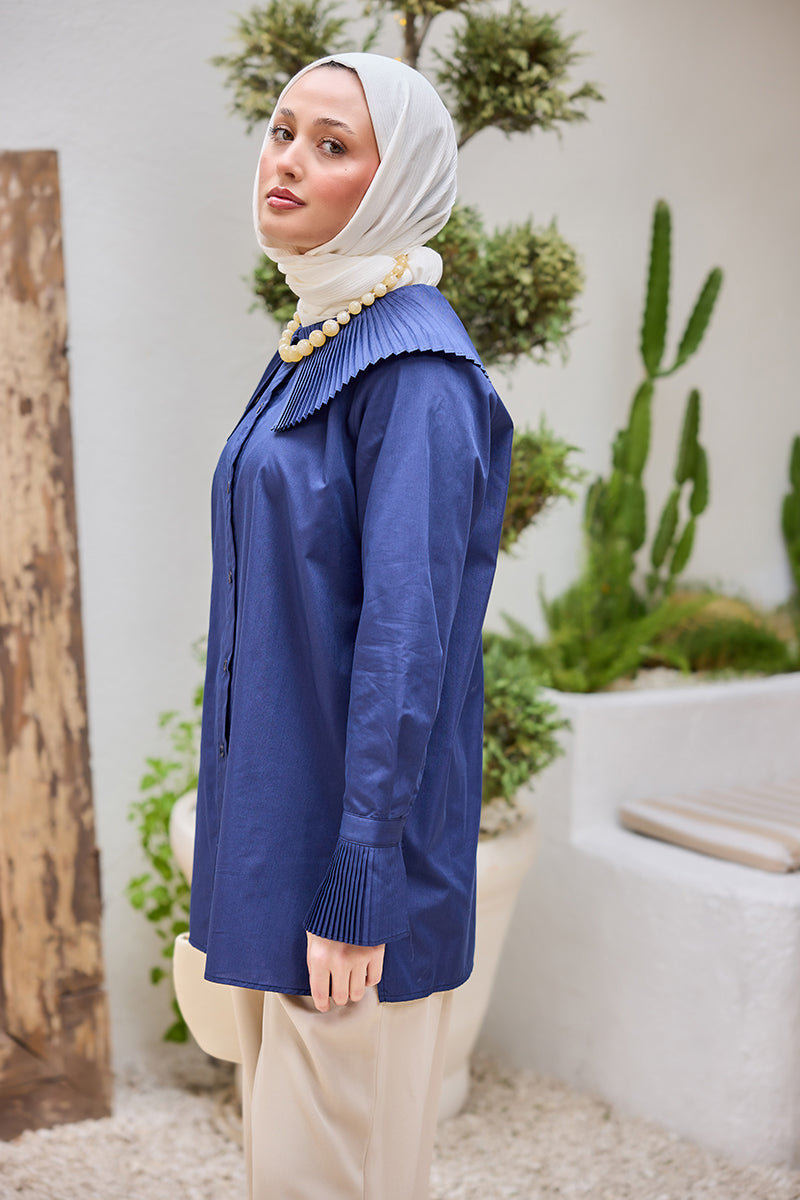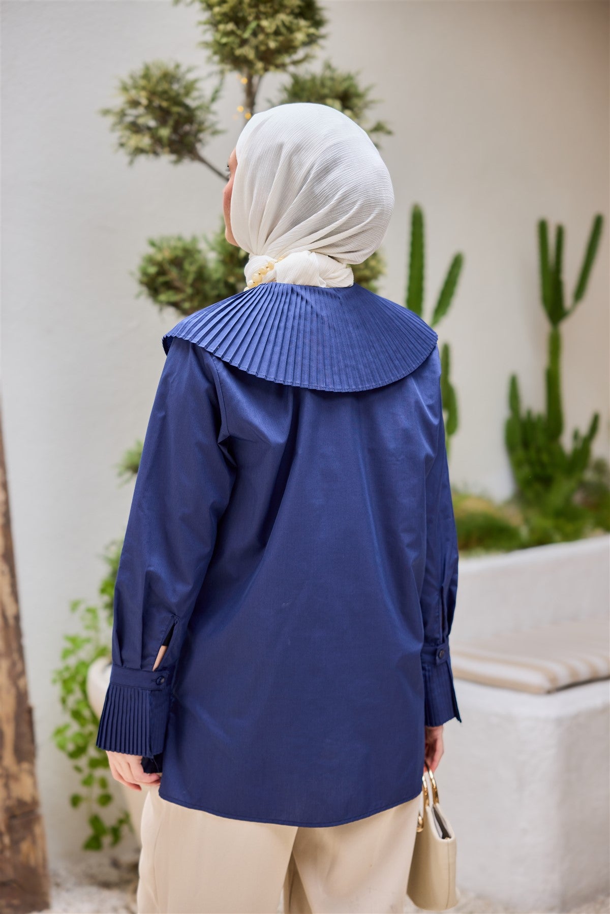Shirt with Pleated Collar and Sleeve Details Navy Blue