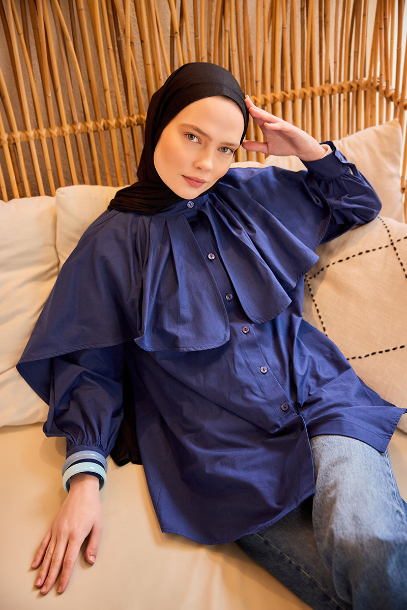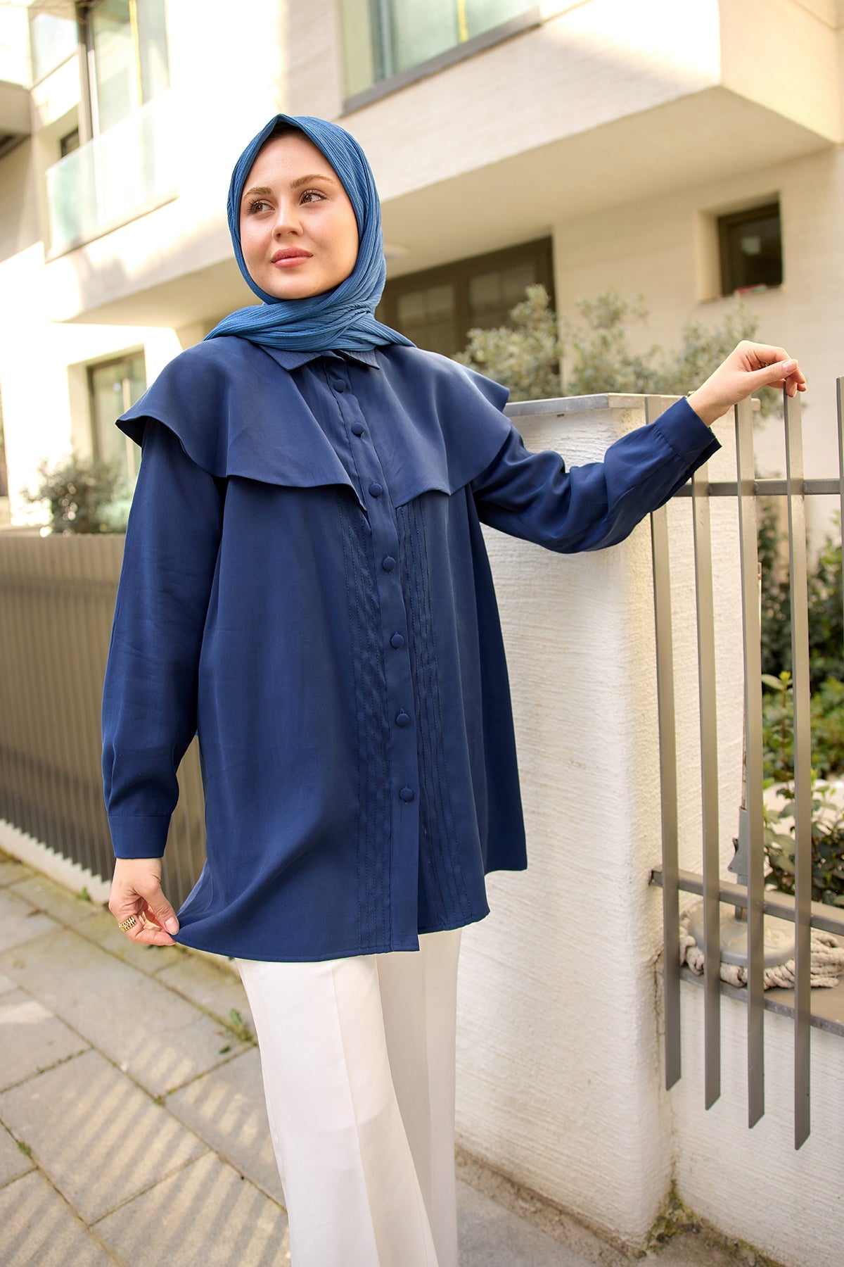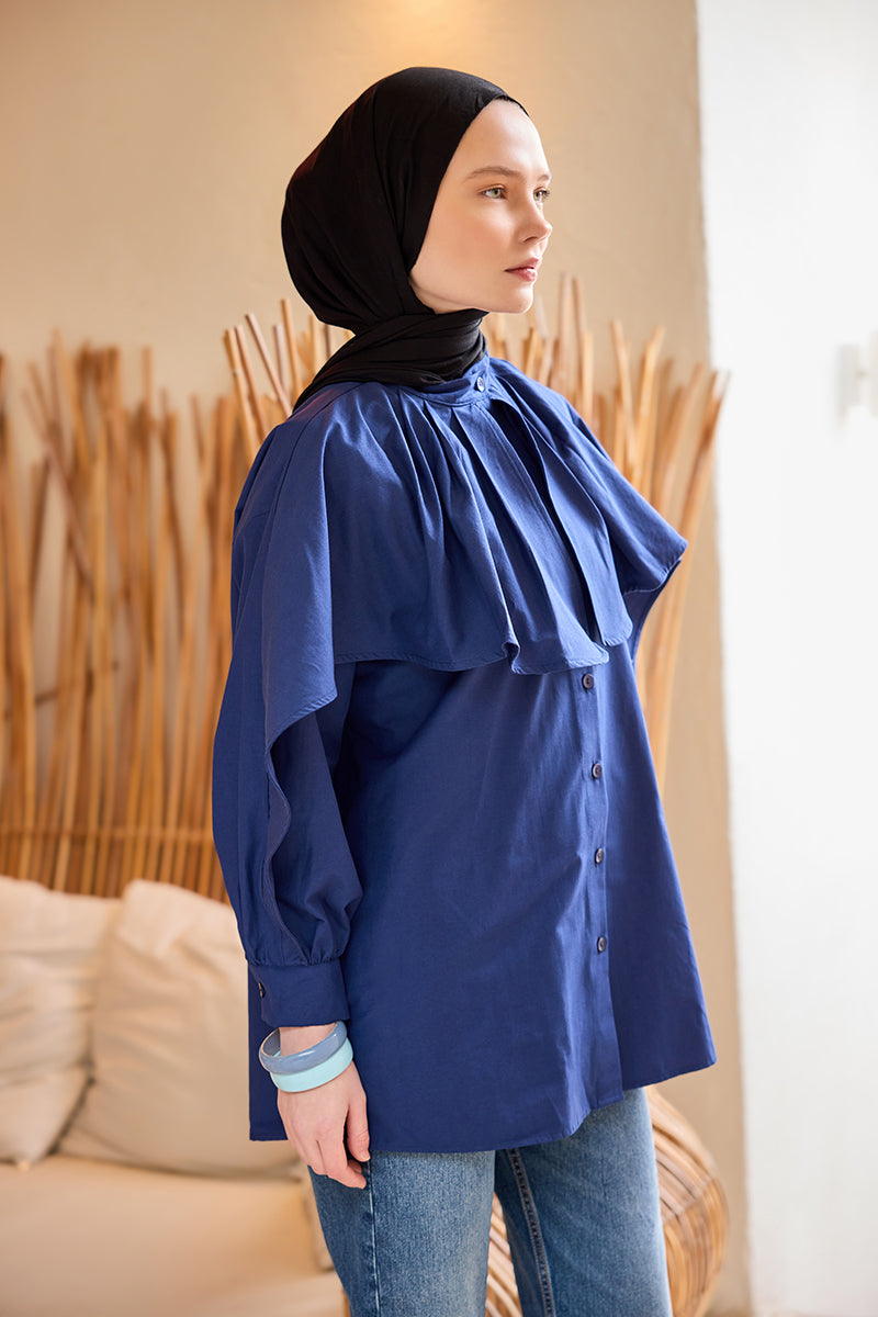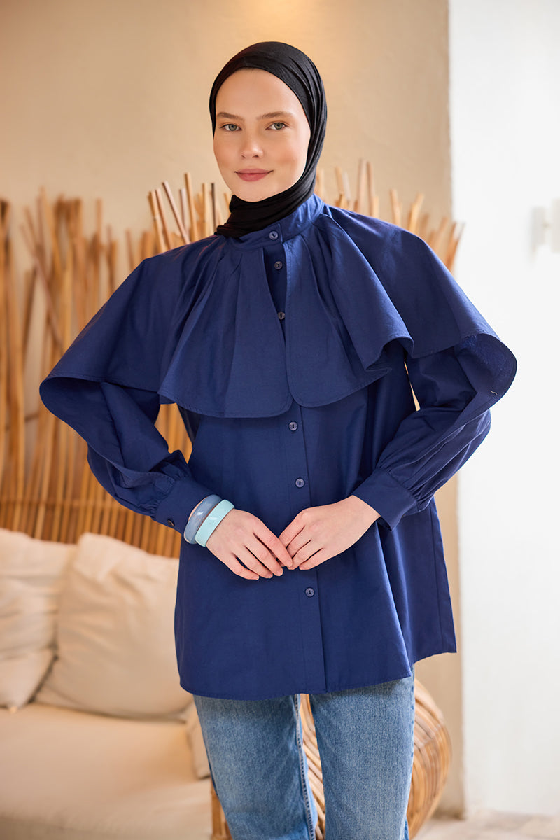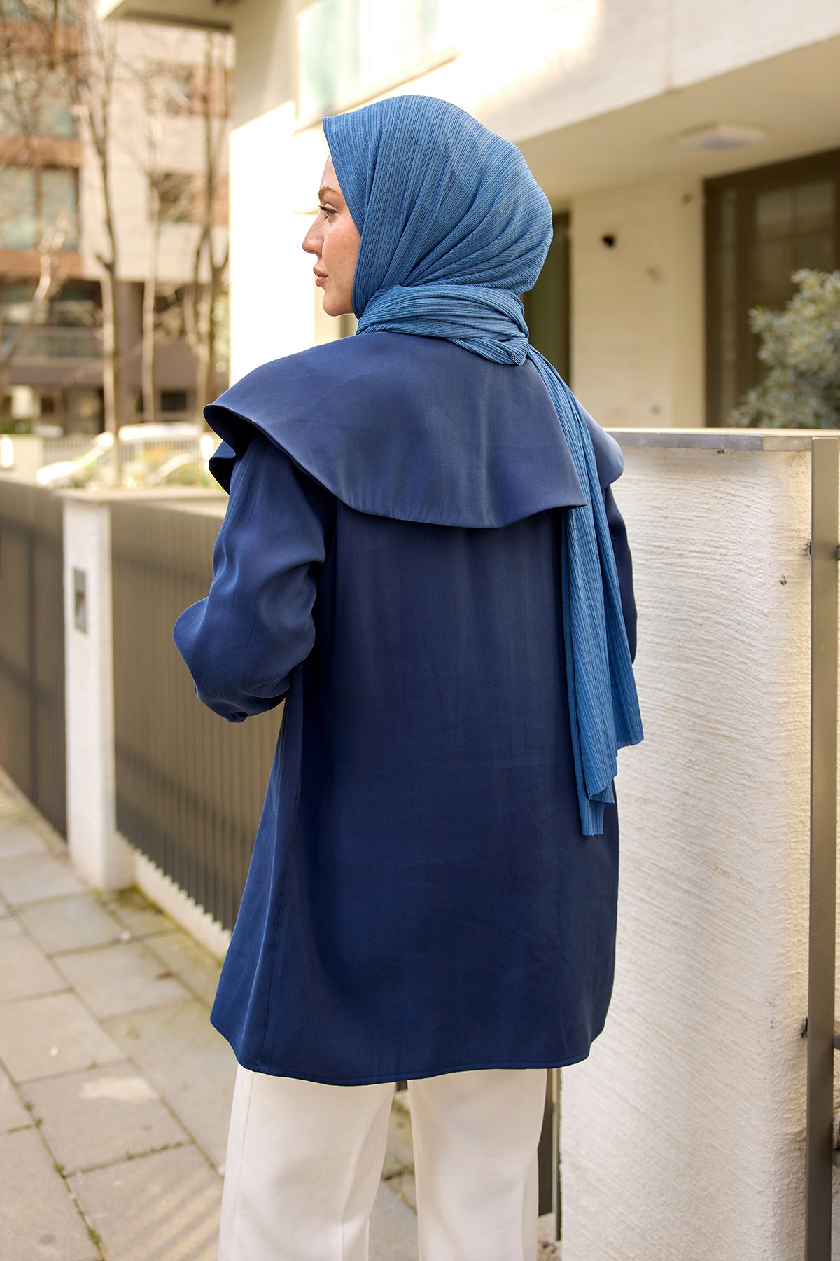 Shirt with Pleated Collar and Sleeve Details Navy Blue