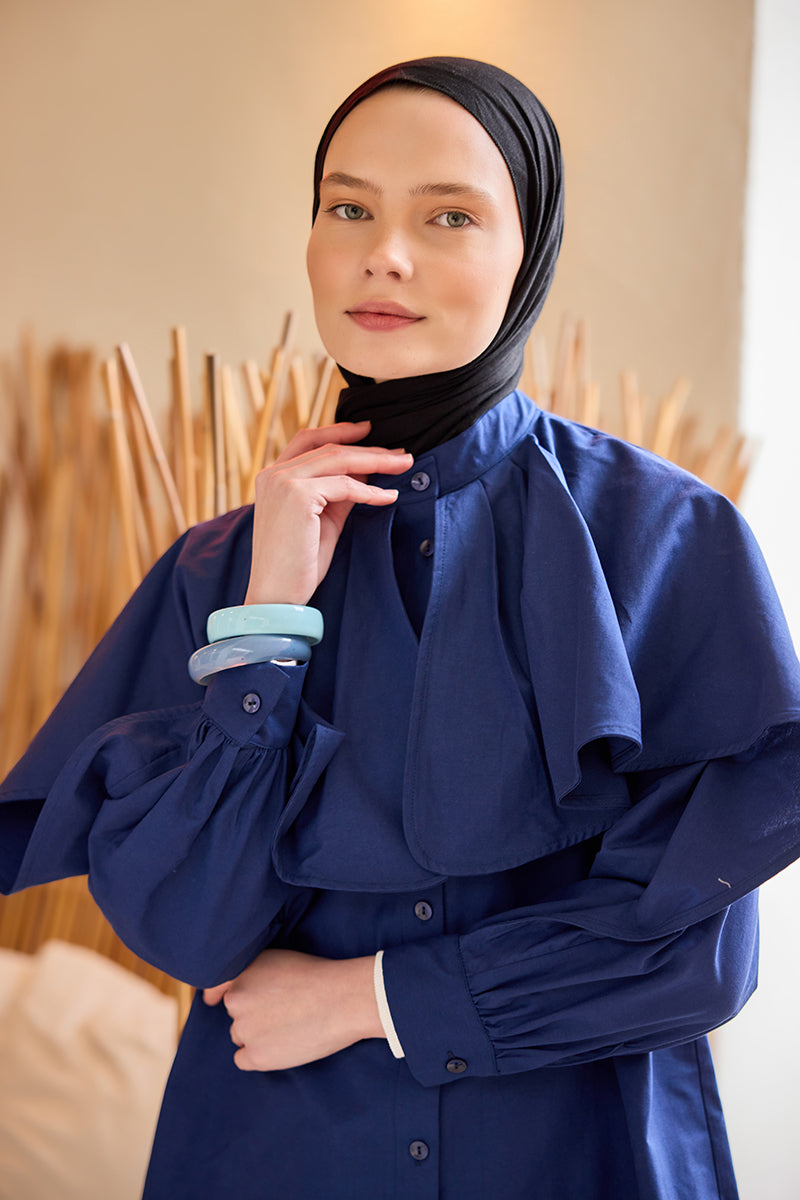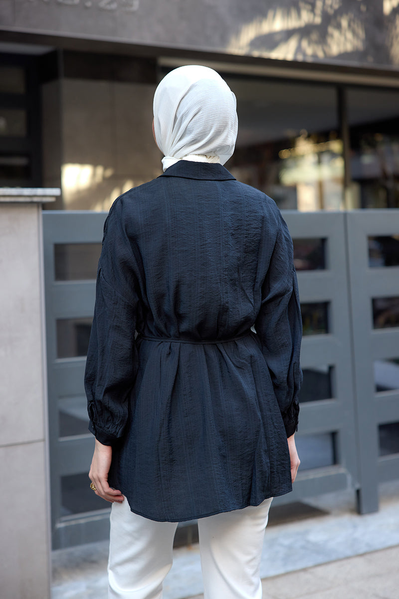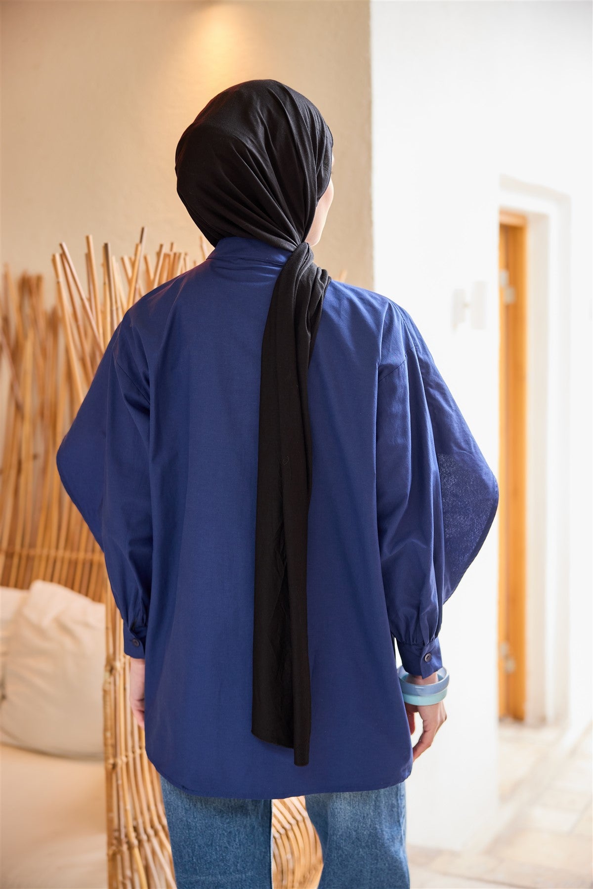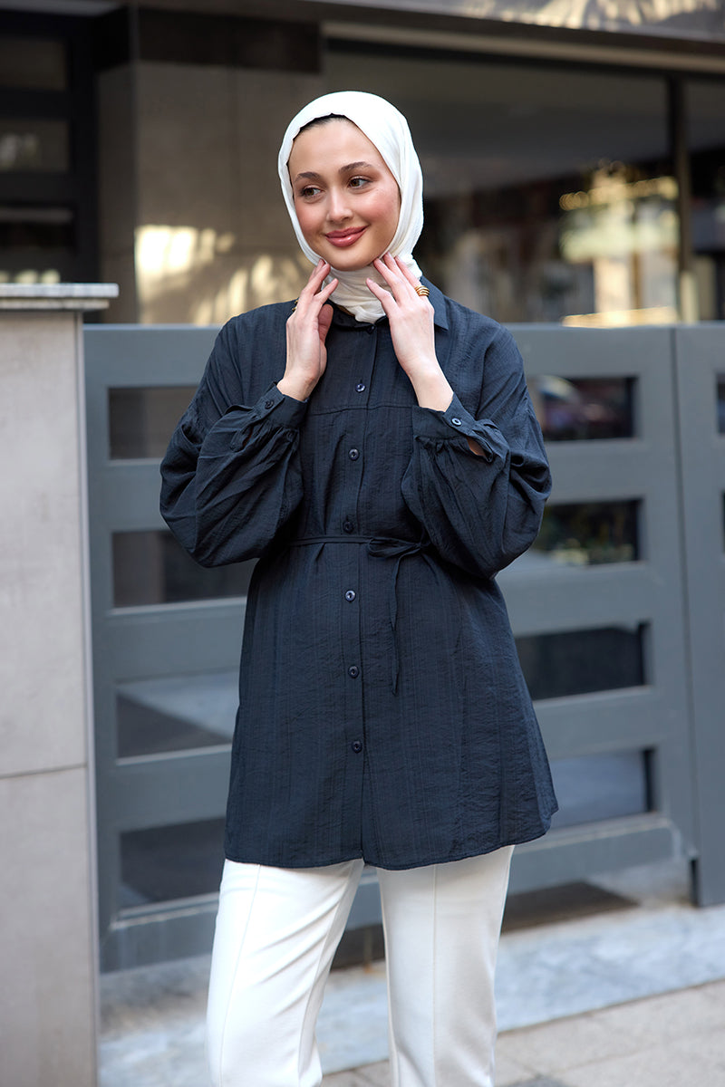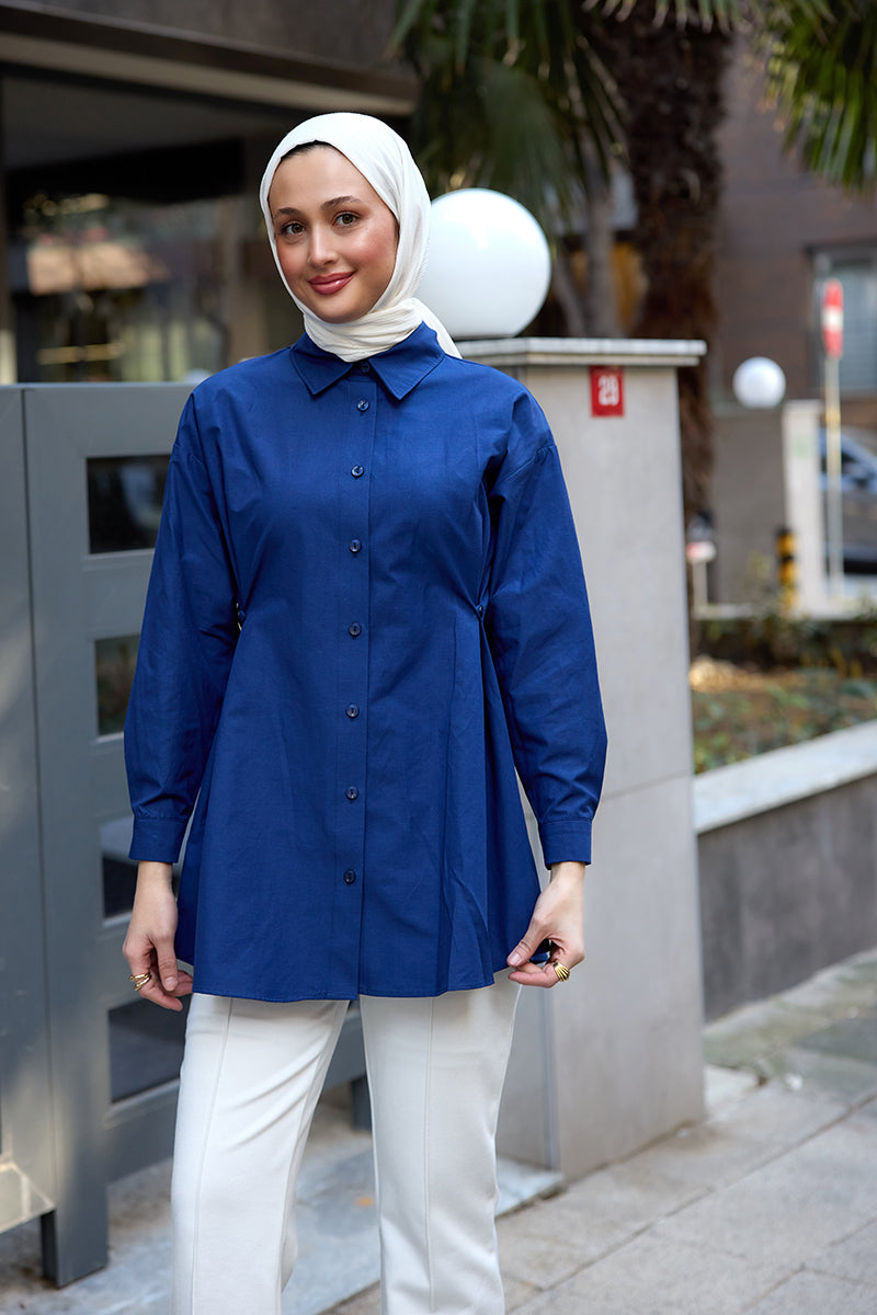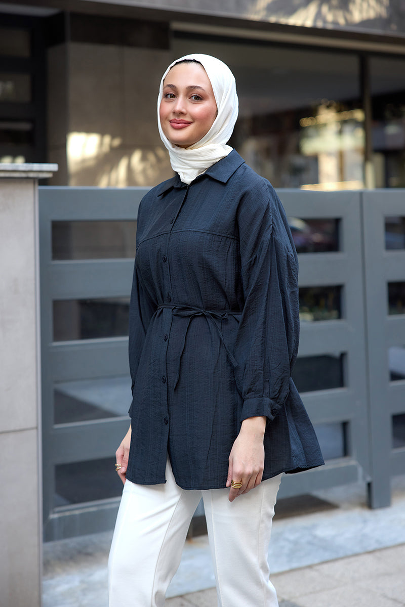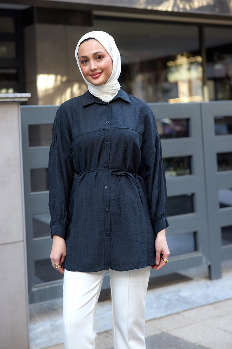 Shirt with Pleated Collar and Sleeve Details Navy Blue