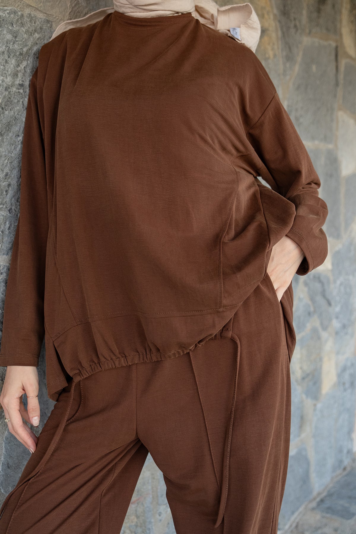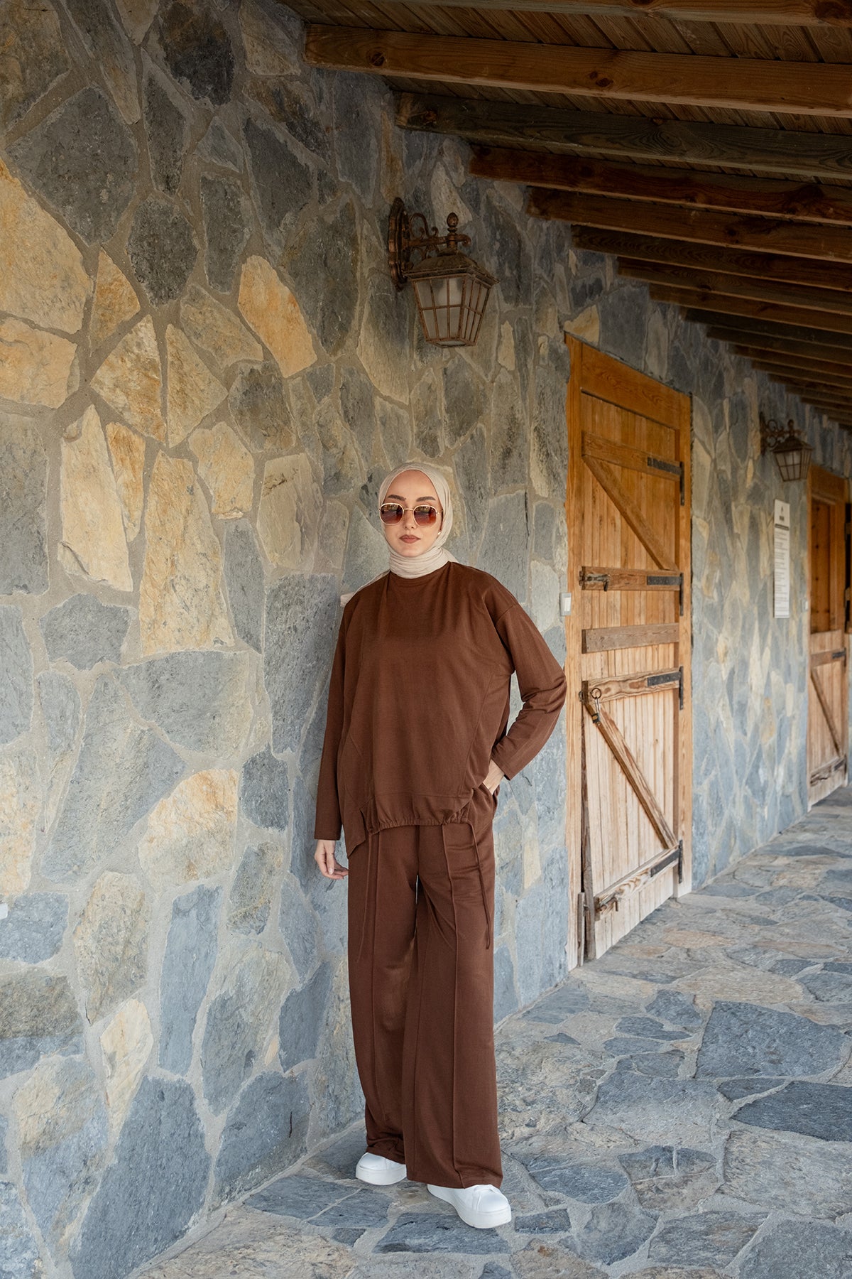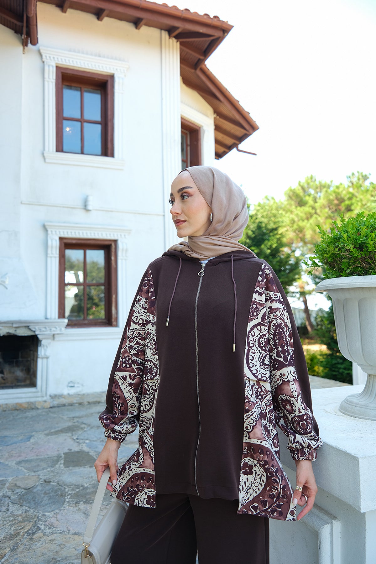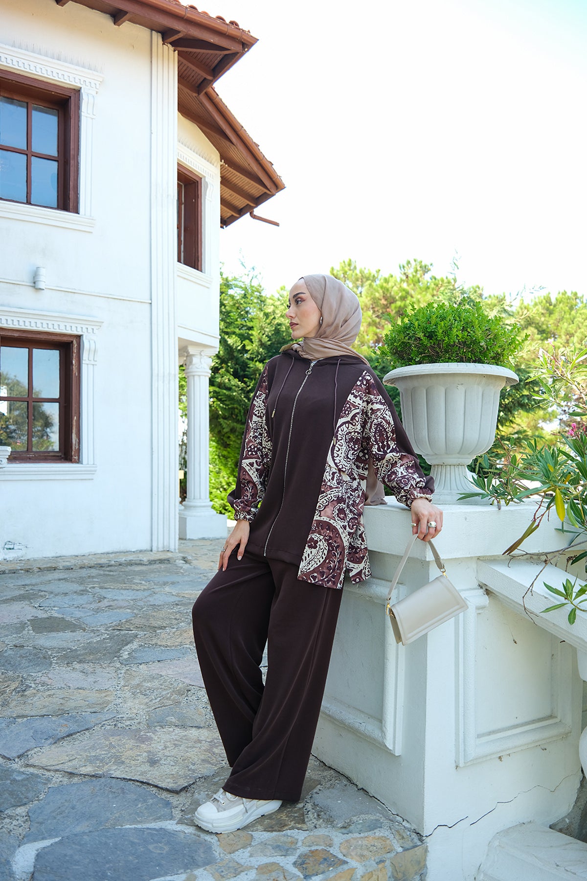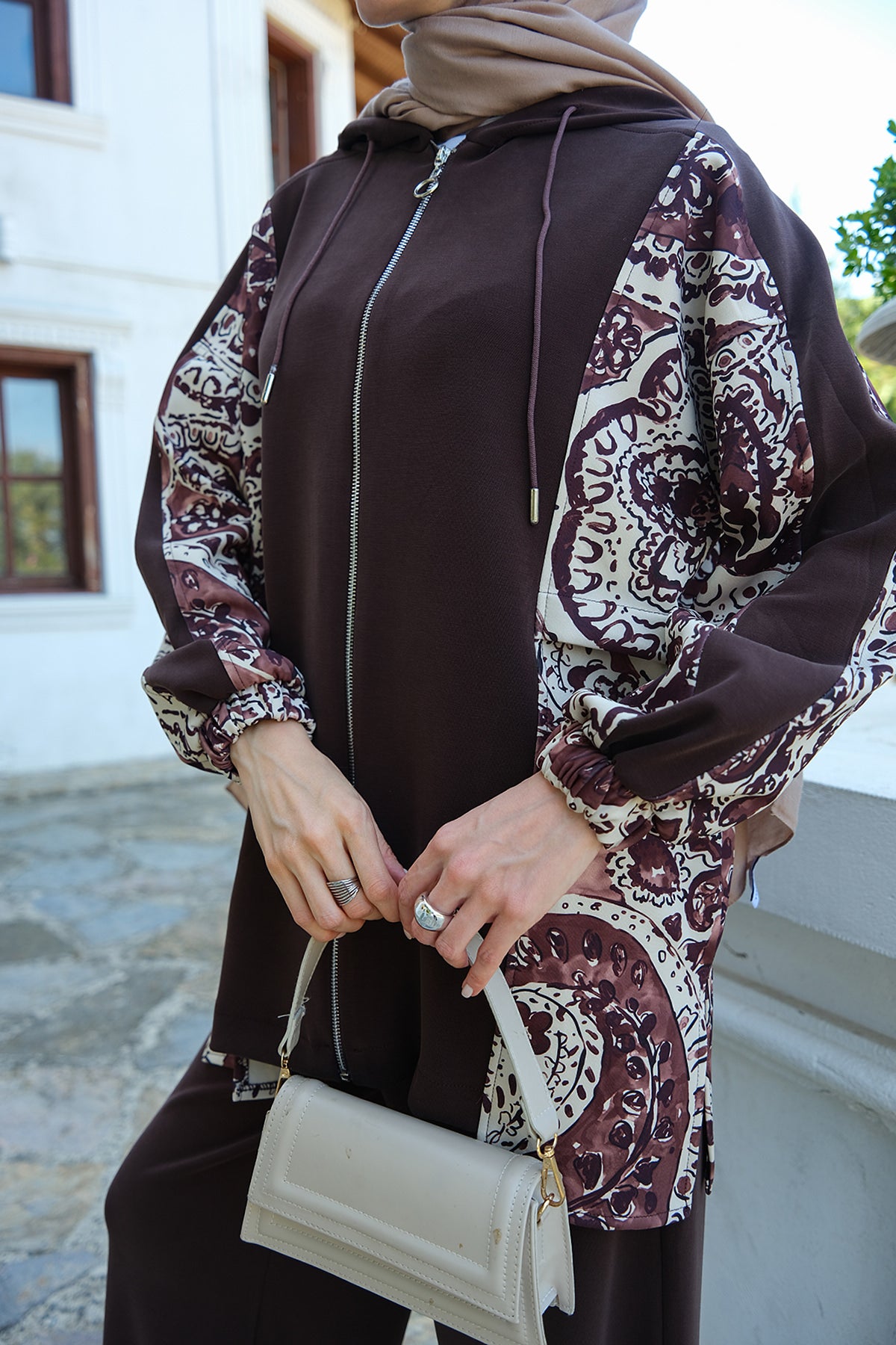 Ethnic Pattern Hooded Two-Piece Set – Brown