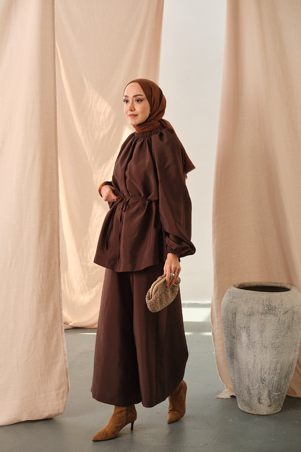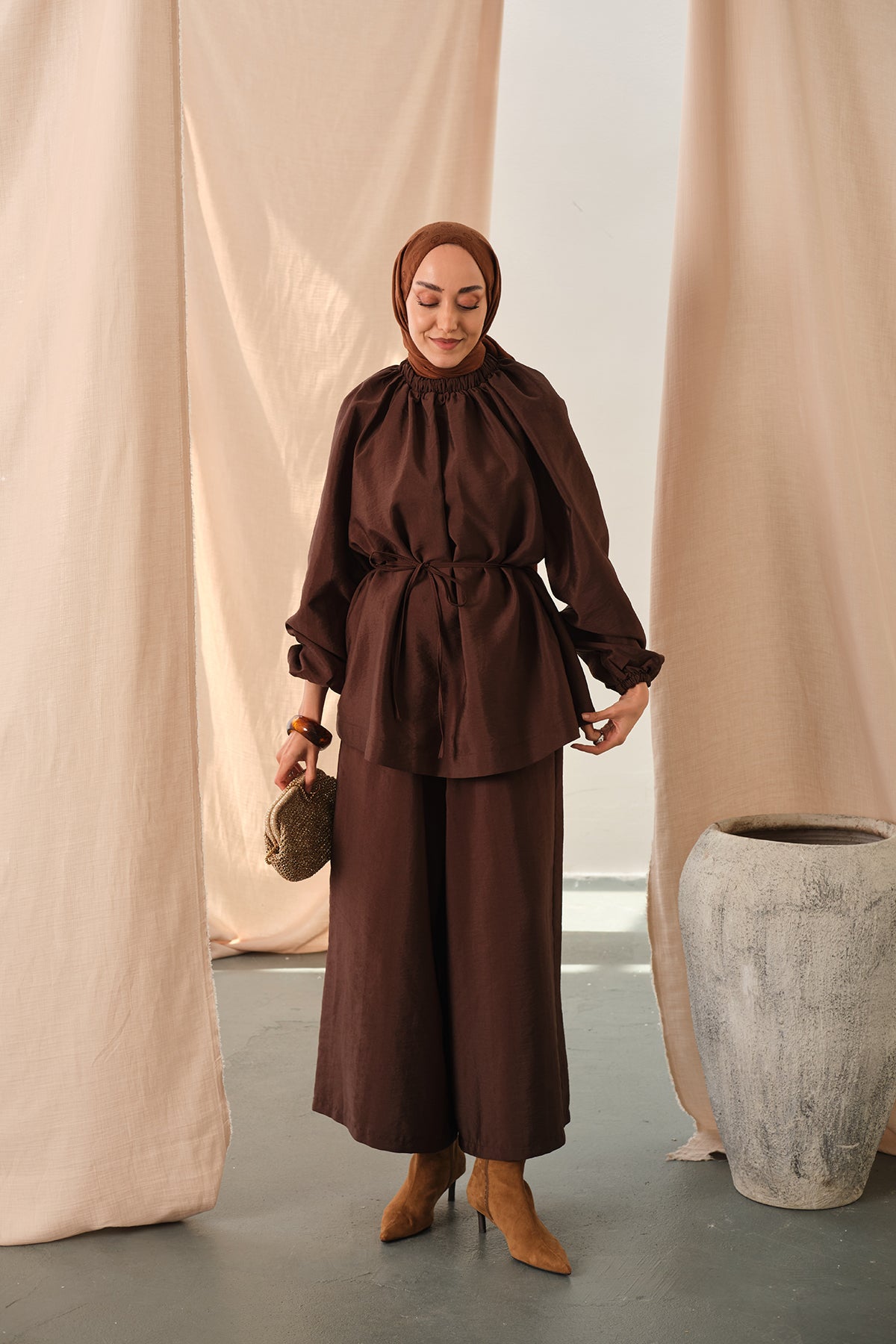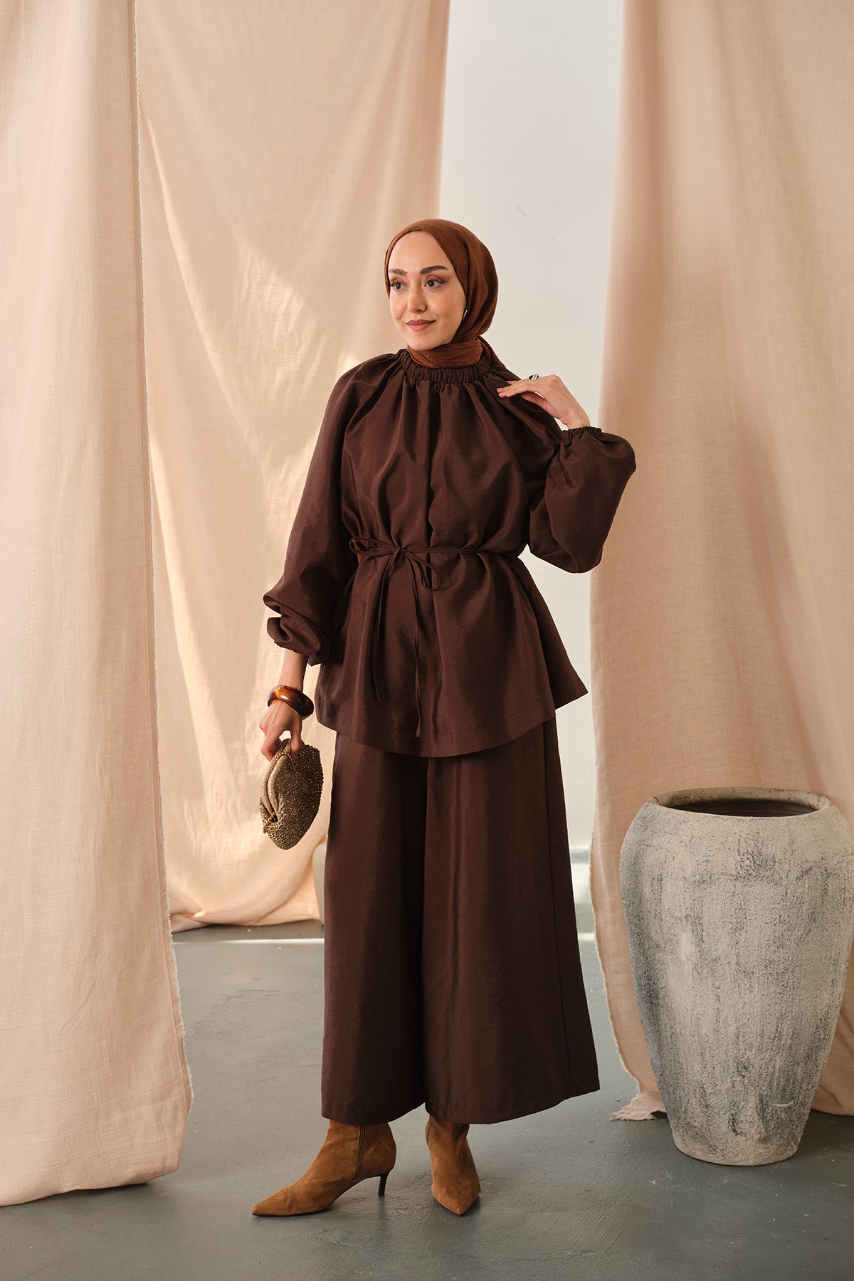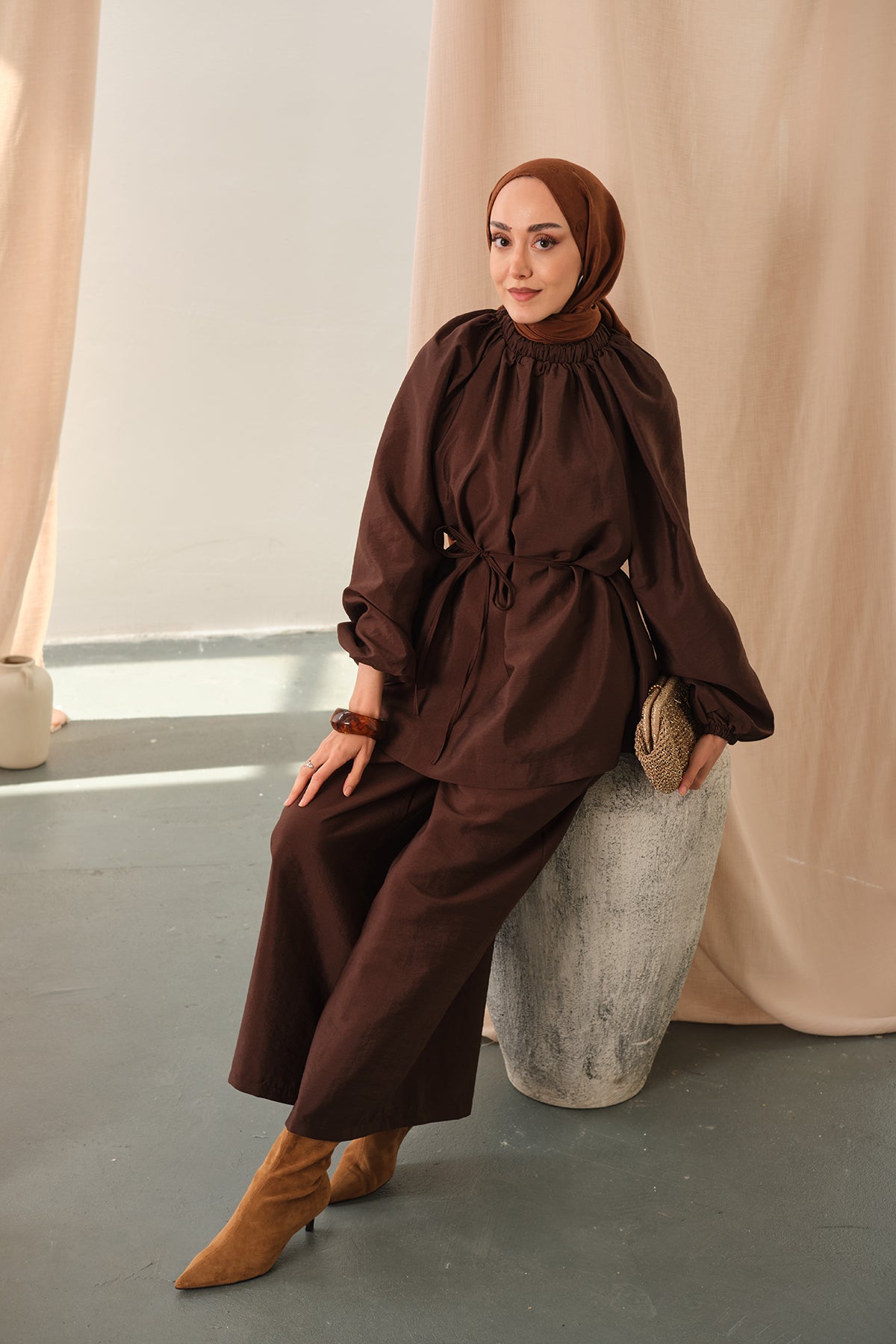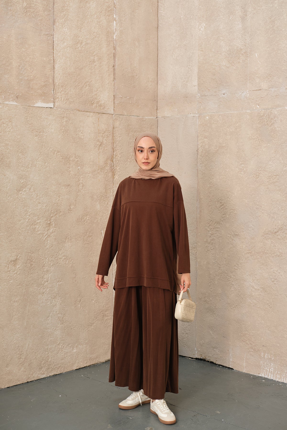 Ethnic Pattern Hooded Two-Piece Set – Brown