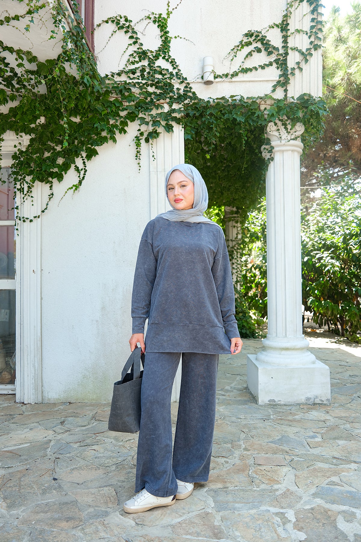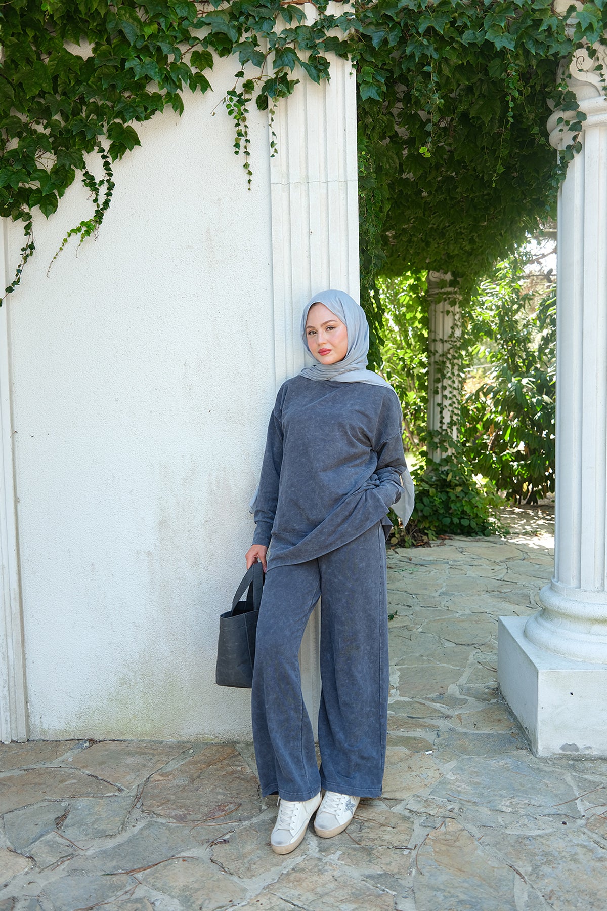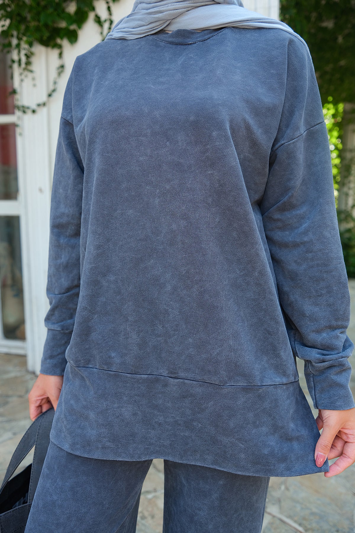 Side-Slit Washed Two-Piece Set – Charcoal Gray