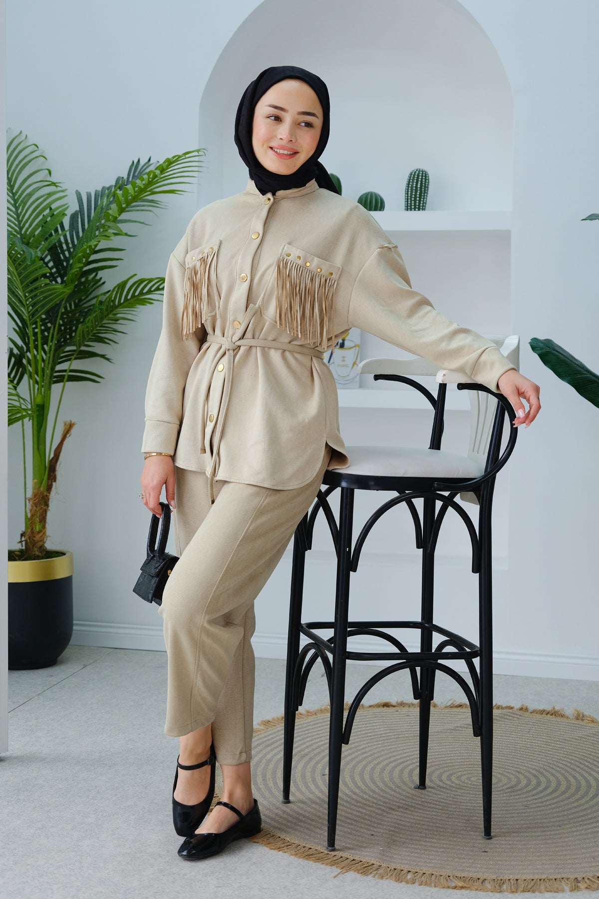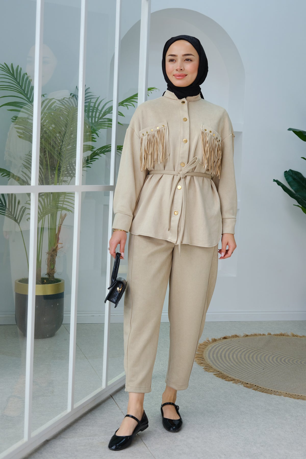 Fringe Detail Suede Set stone