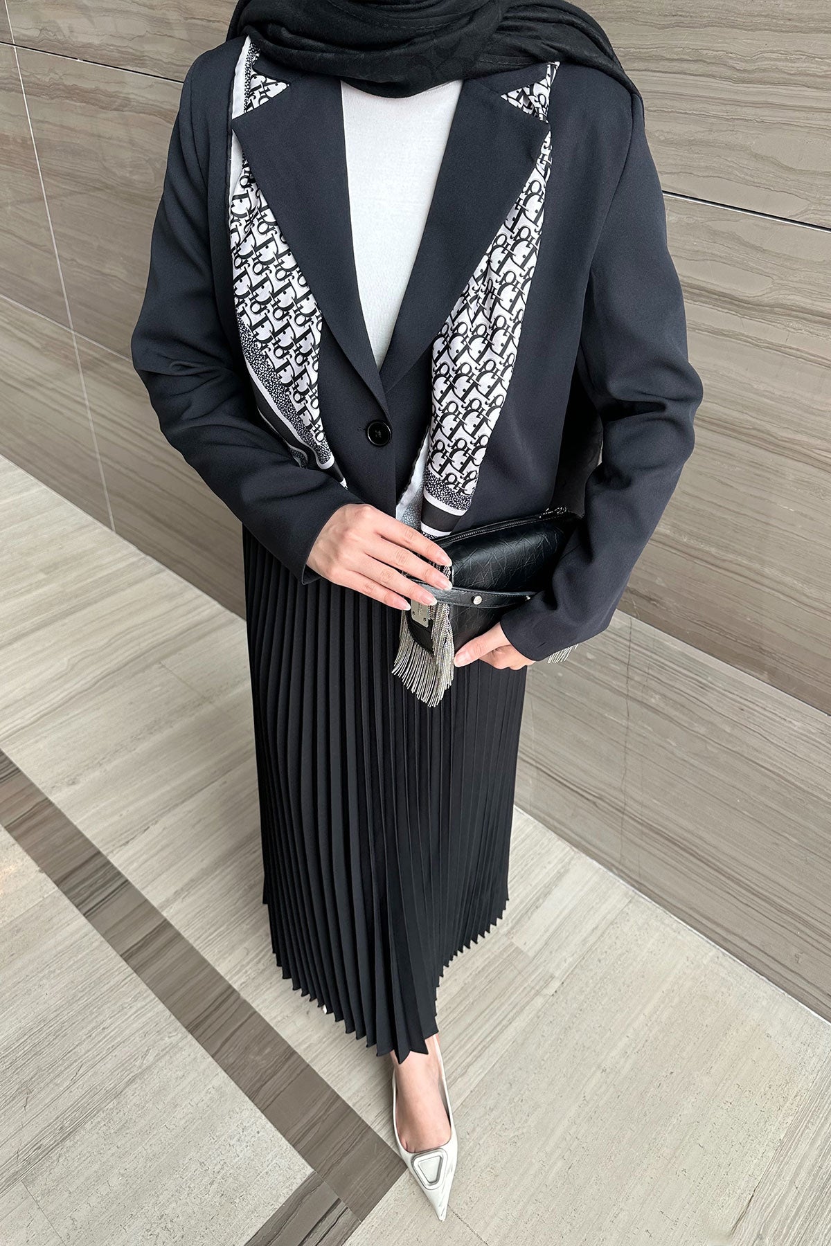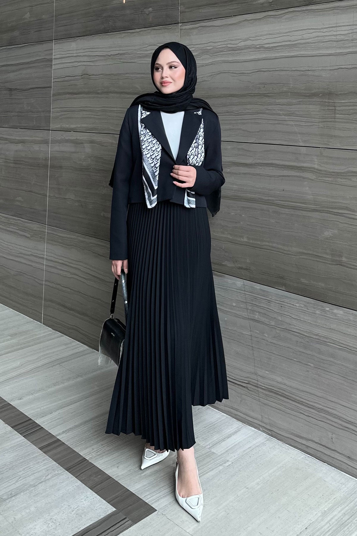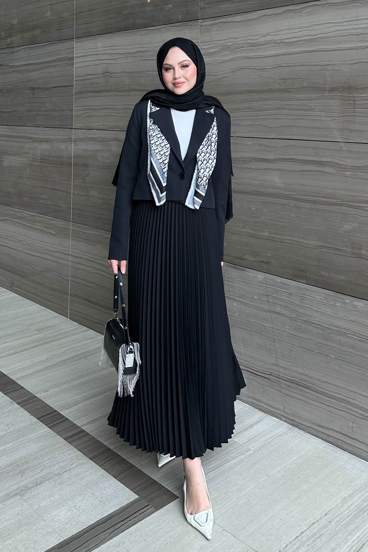 Pleated Skirt Jacket Set Black