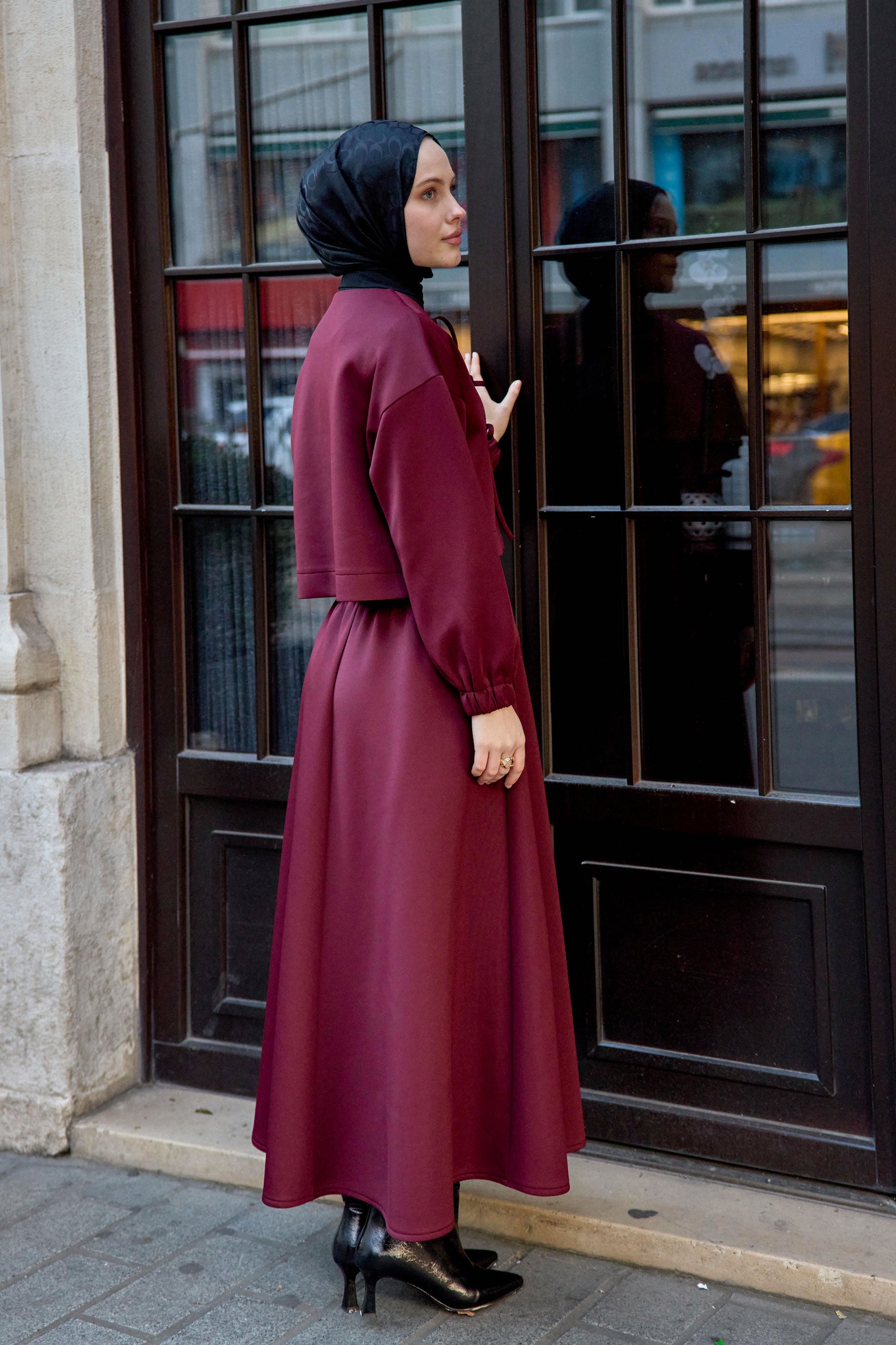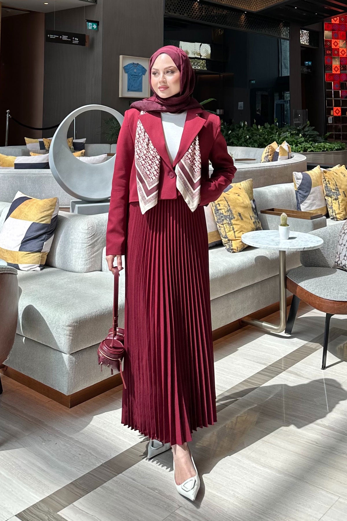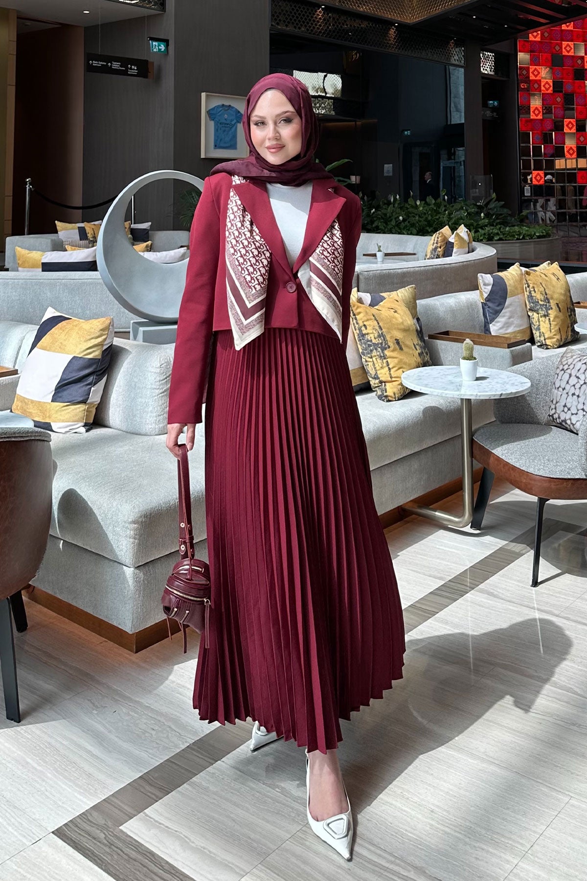 Pleated Skirt Jacket Set Burgundy