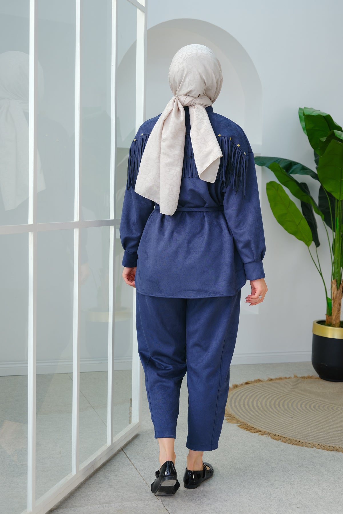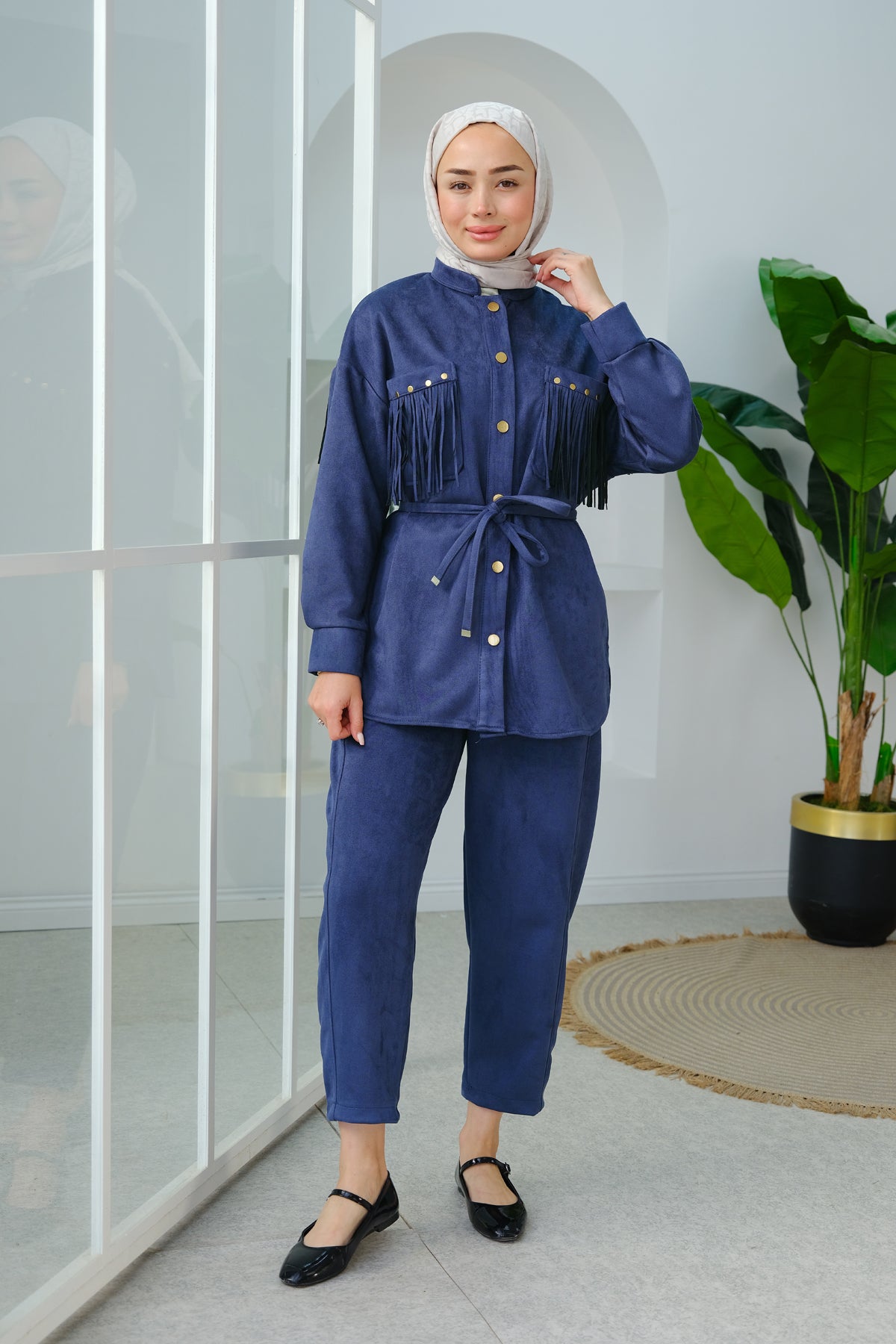 Fringe Detail Suede Set navy blue