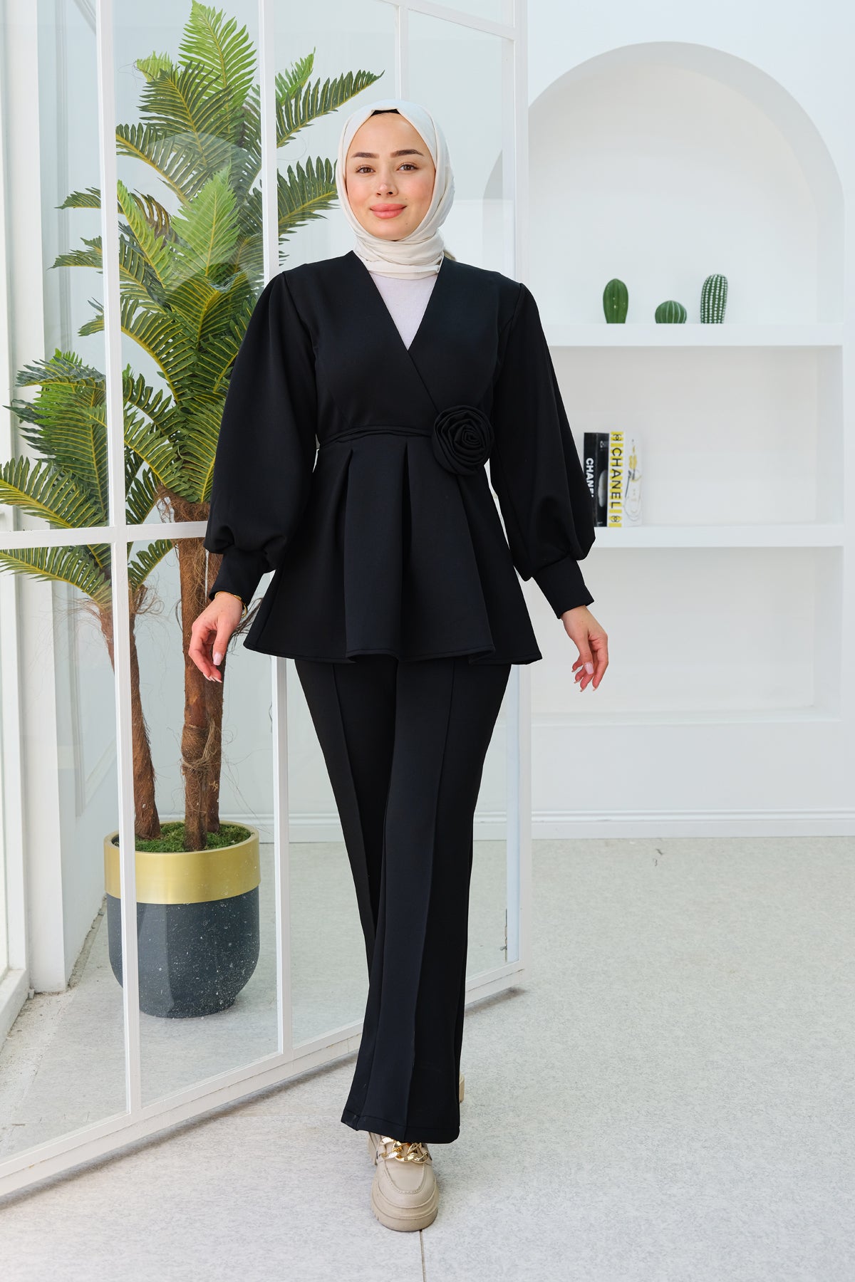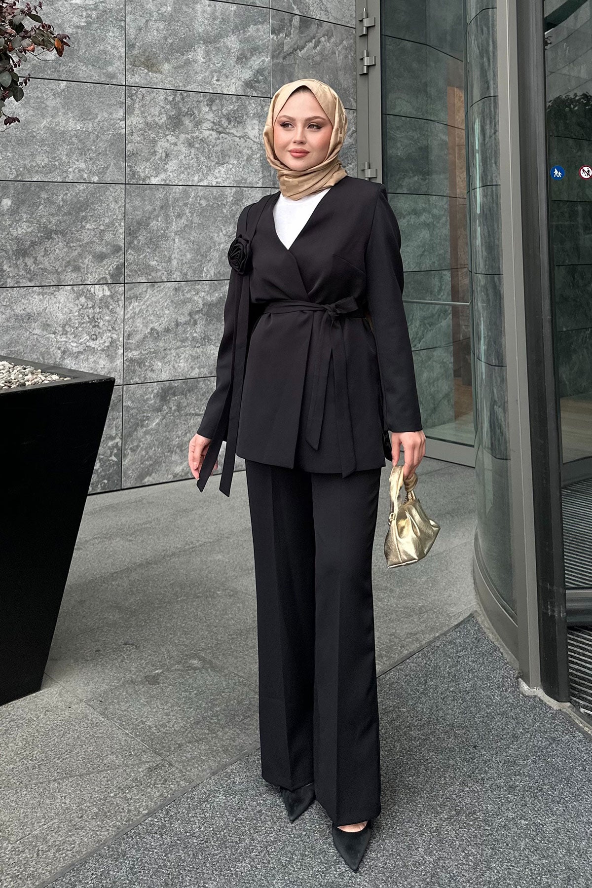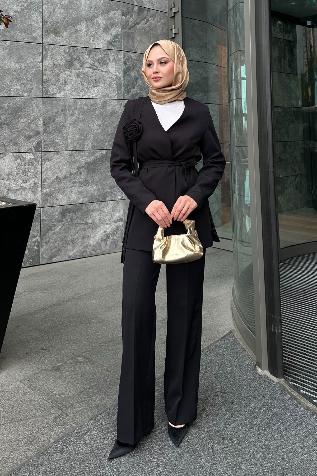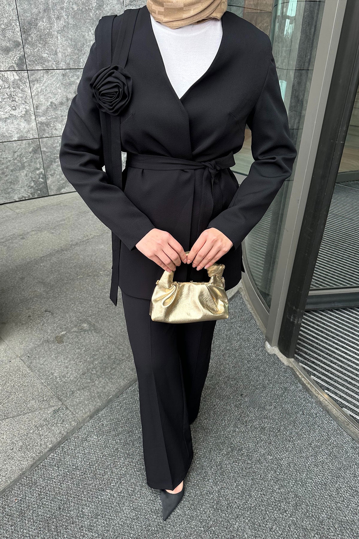 Rose Detail Two-Piece Set with Waist Tie Black