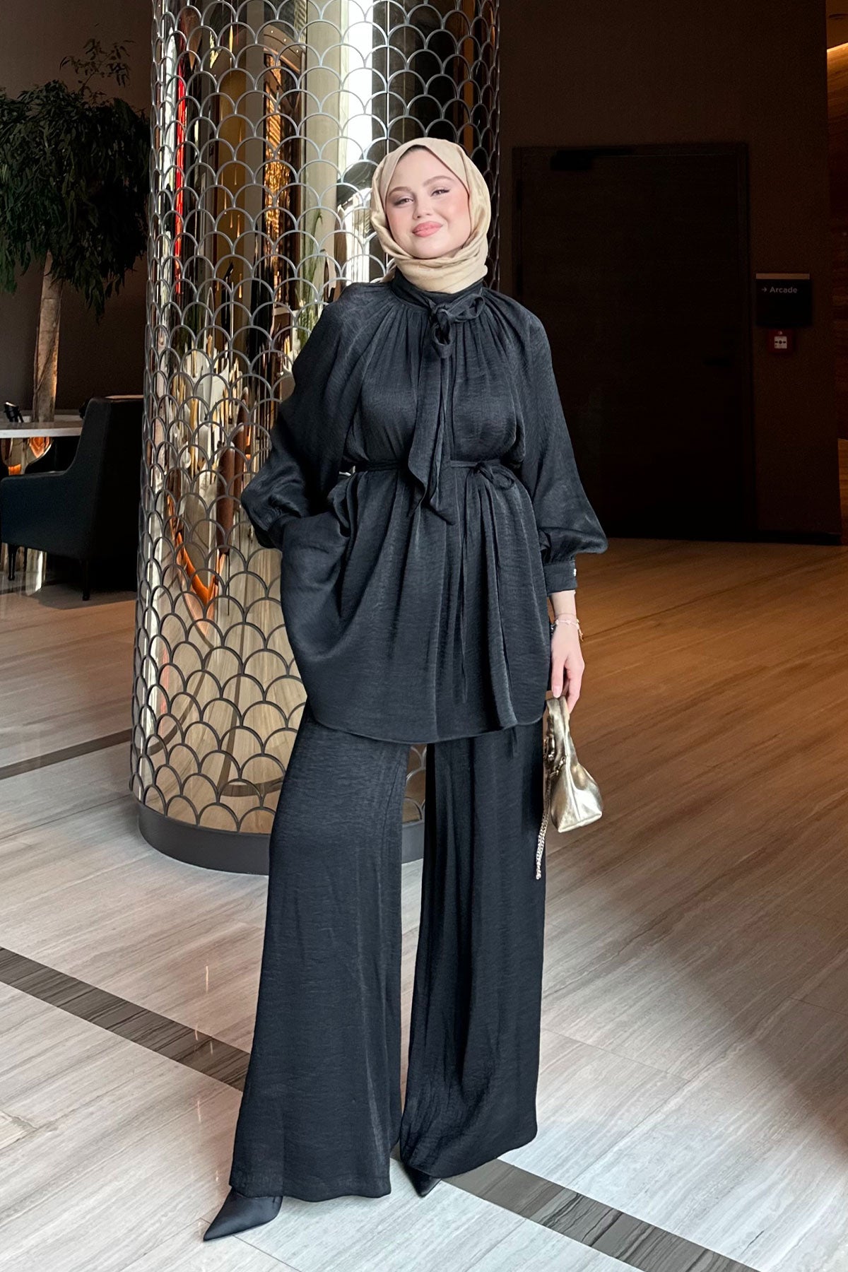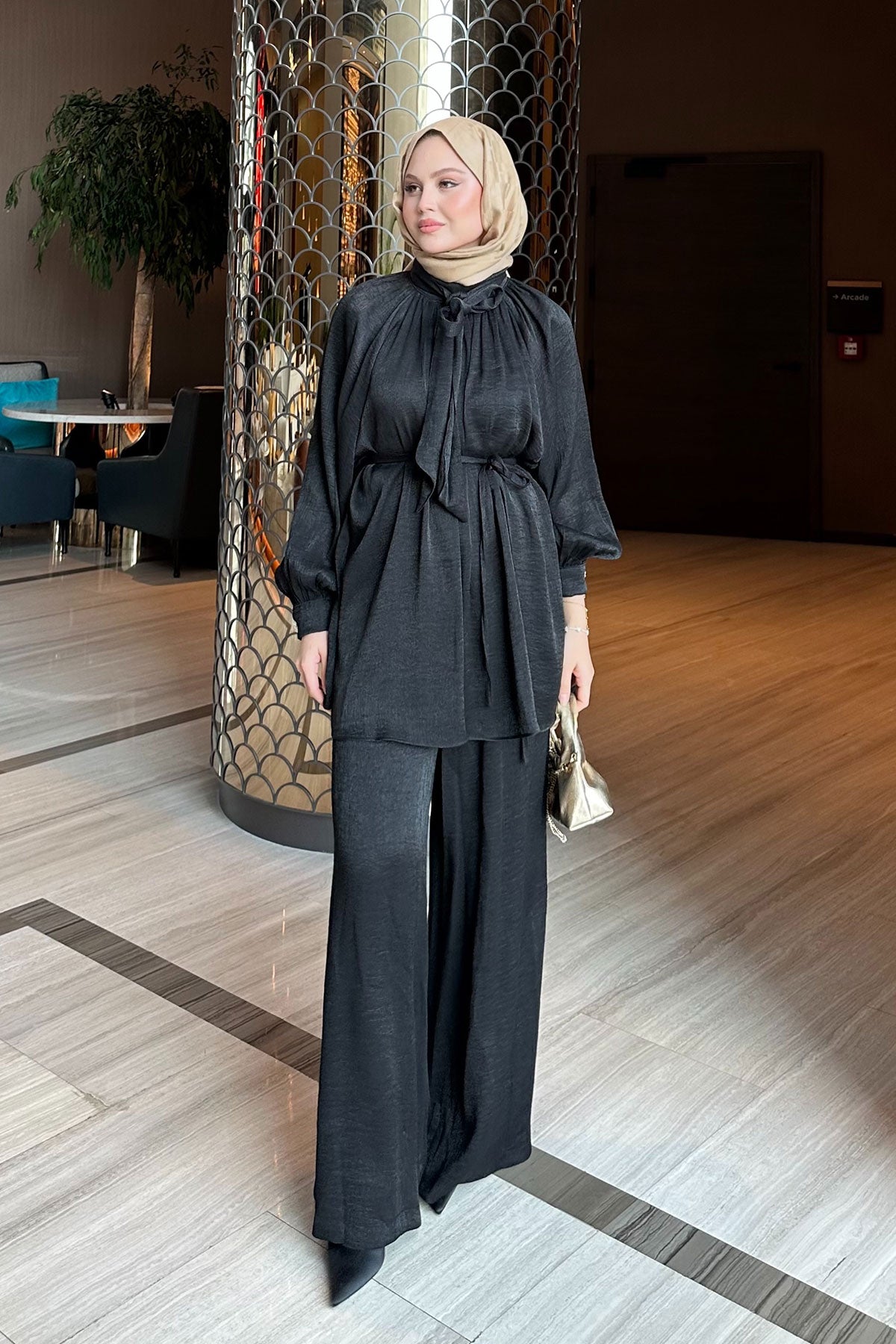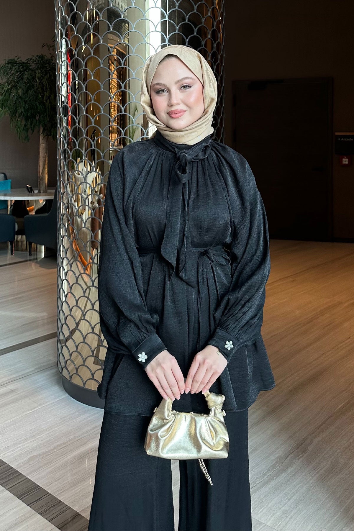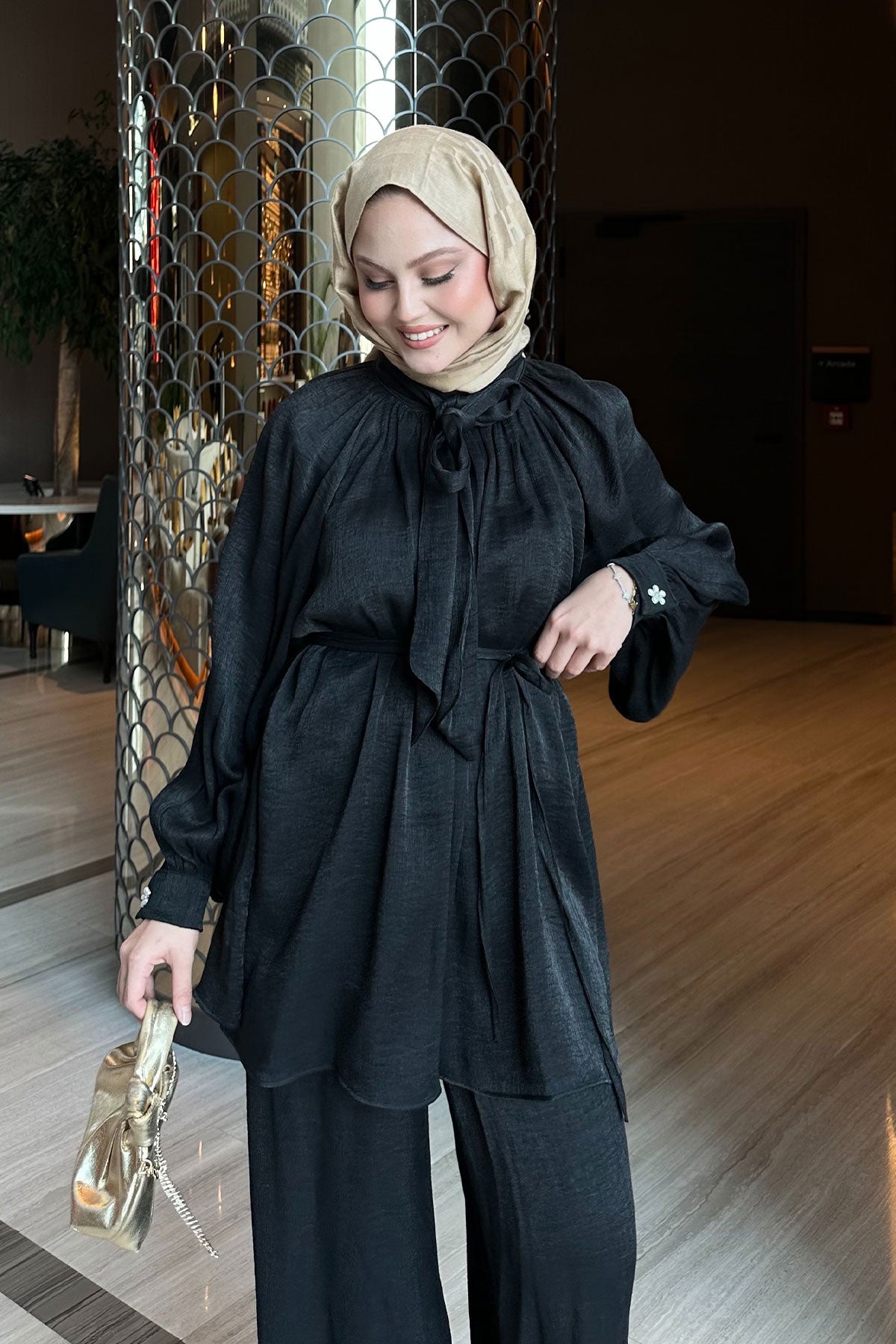 Rose Detail Two-Piece Set with Waist Tie Black