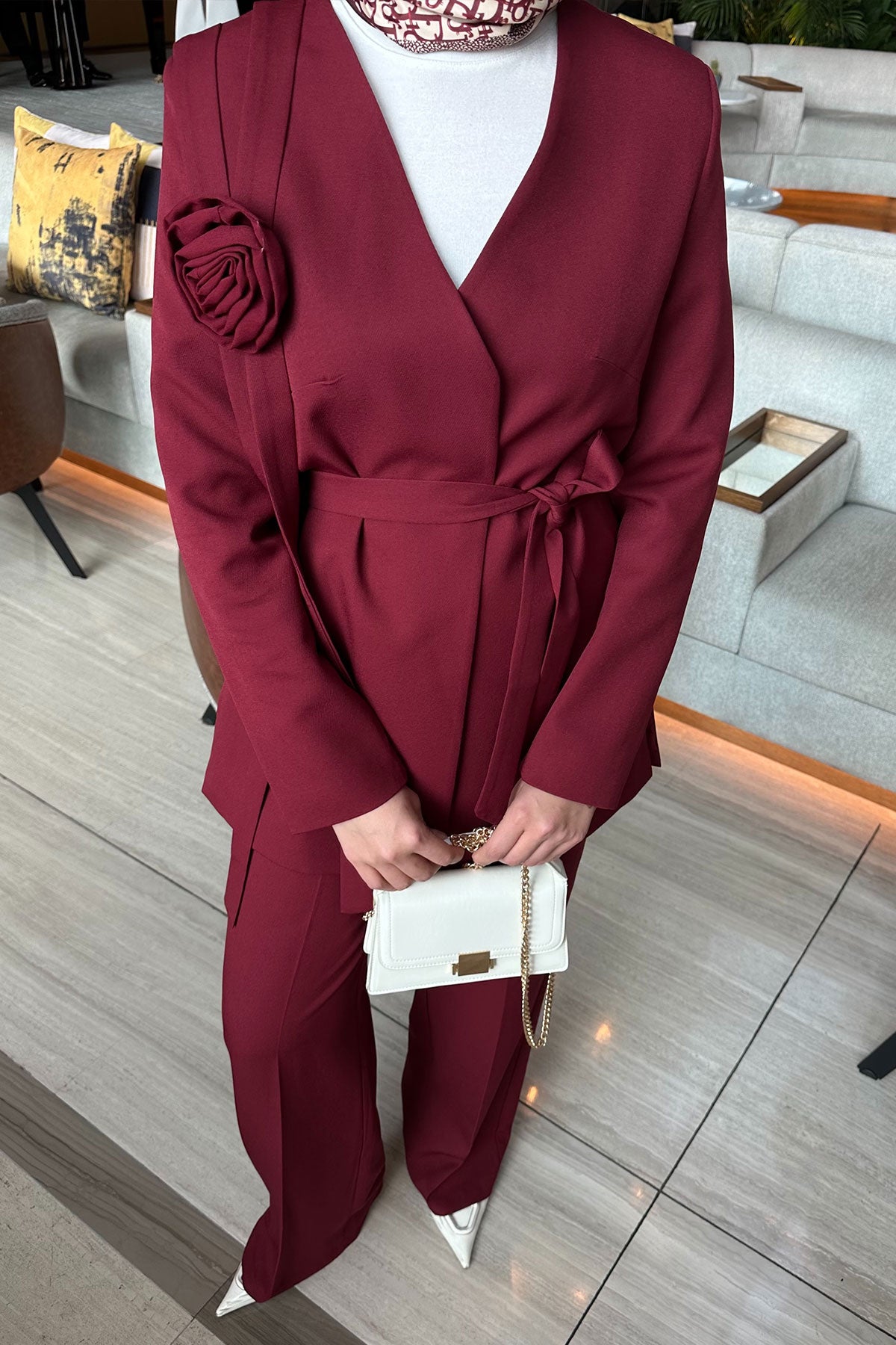 Flower-Accessory Suit - Burgundy
