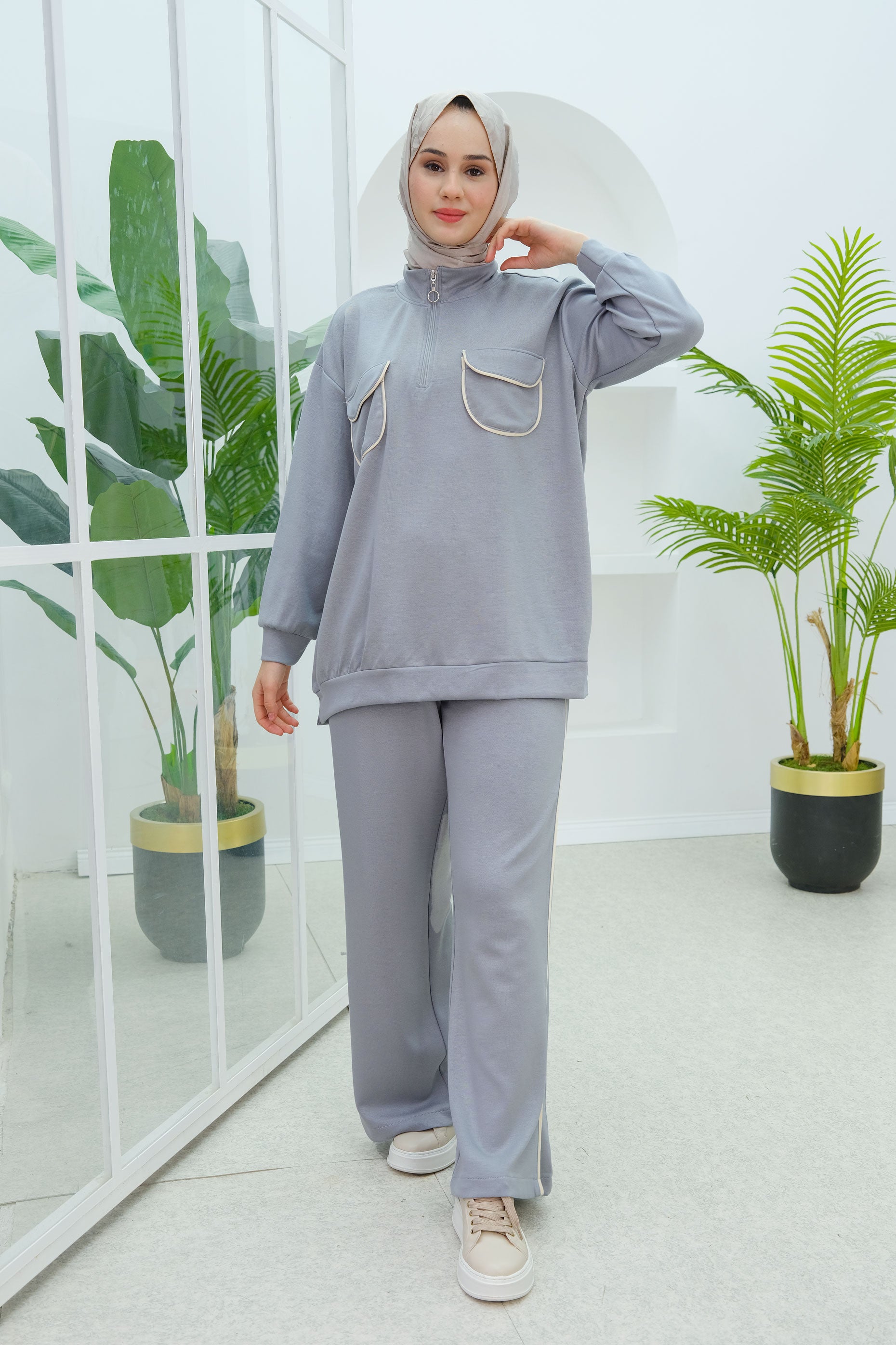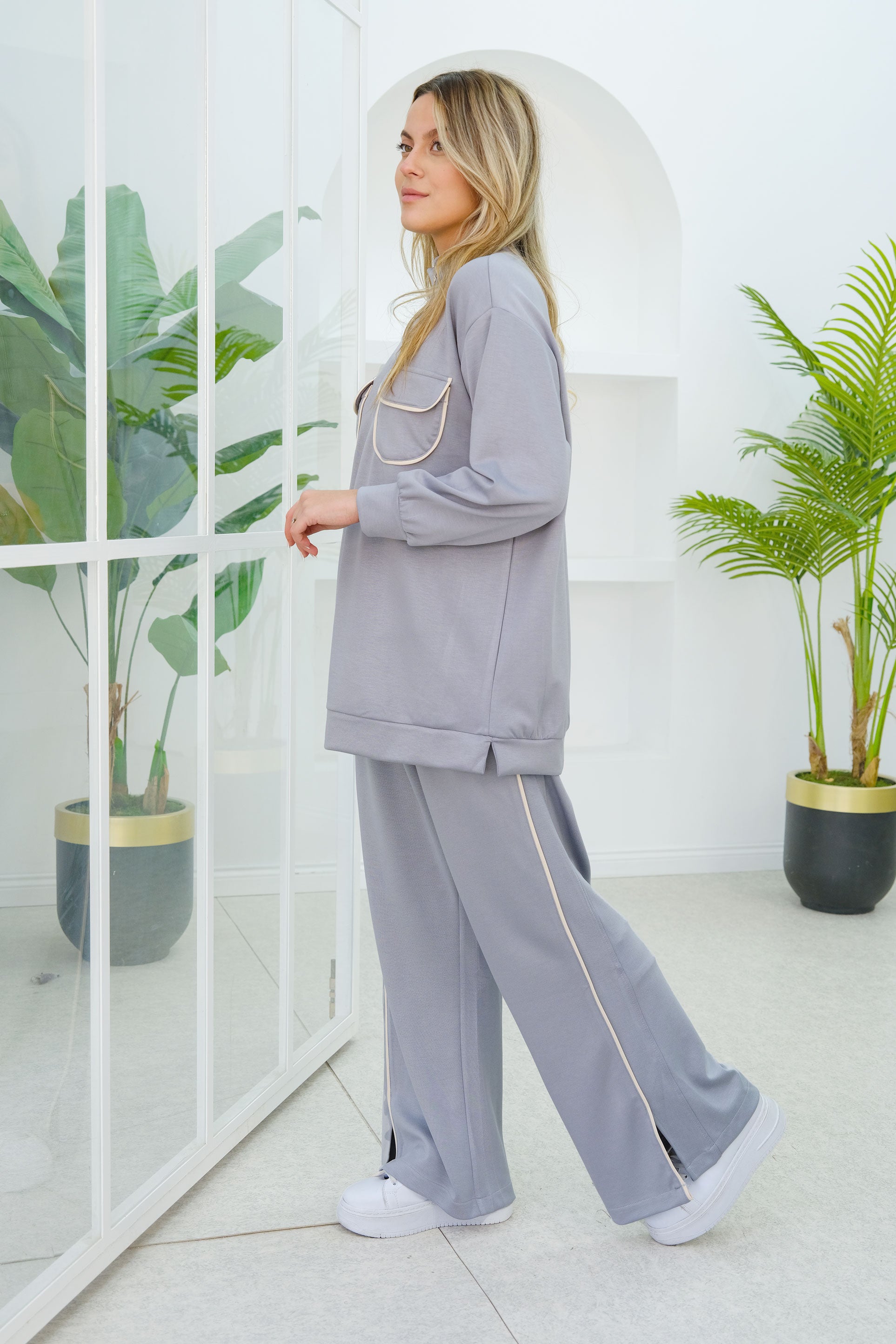 Double Pocket Detailed Two-Piece Set in Gray
