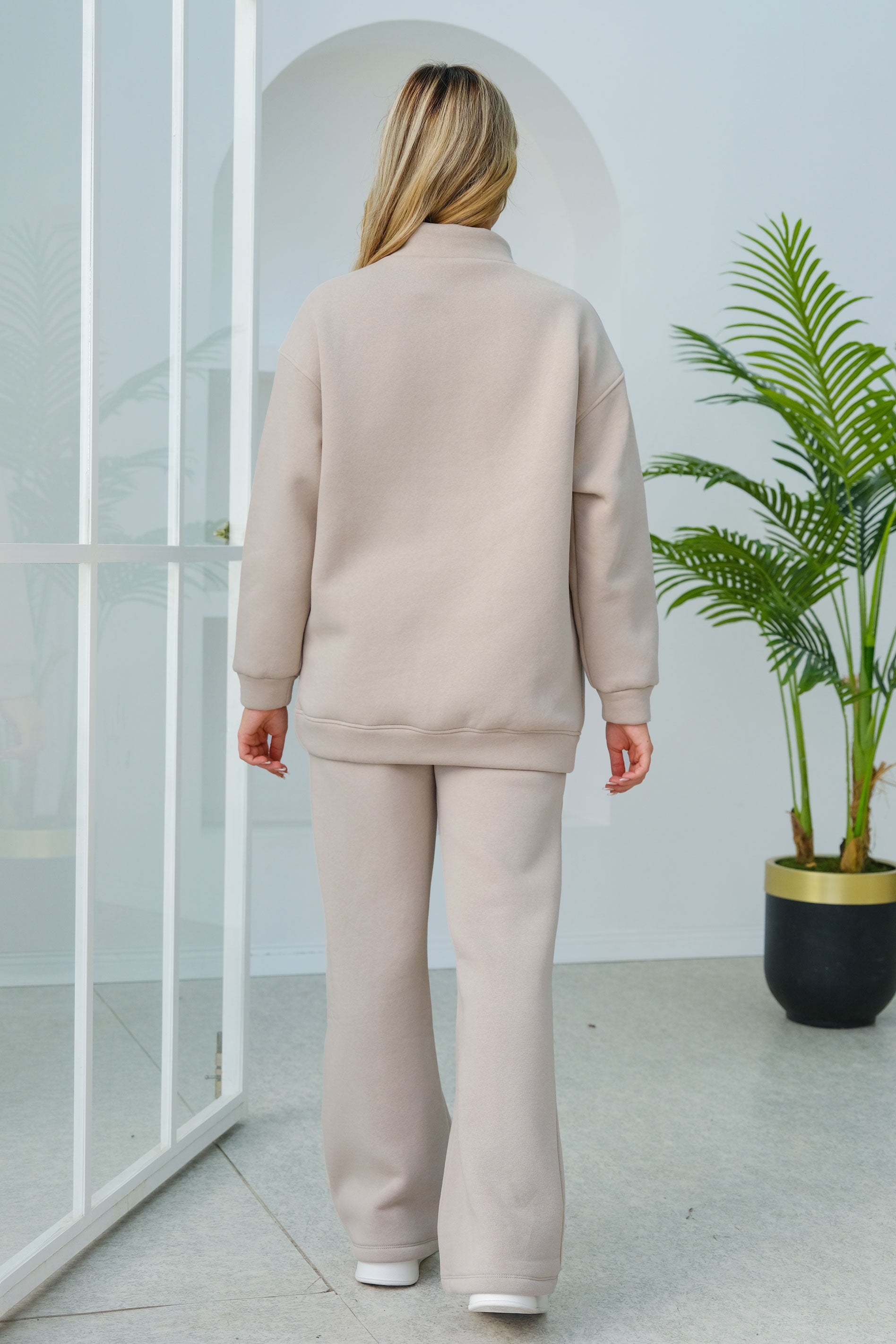 Half-Zip and Stitch Detailed Two-Piece Set in Cream