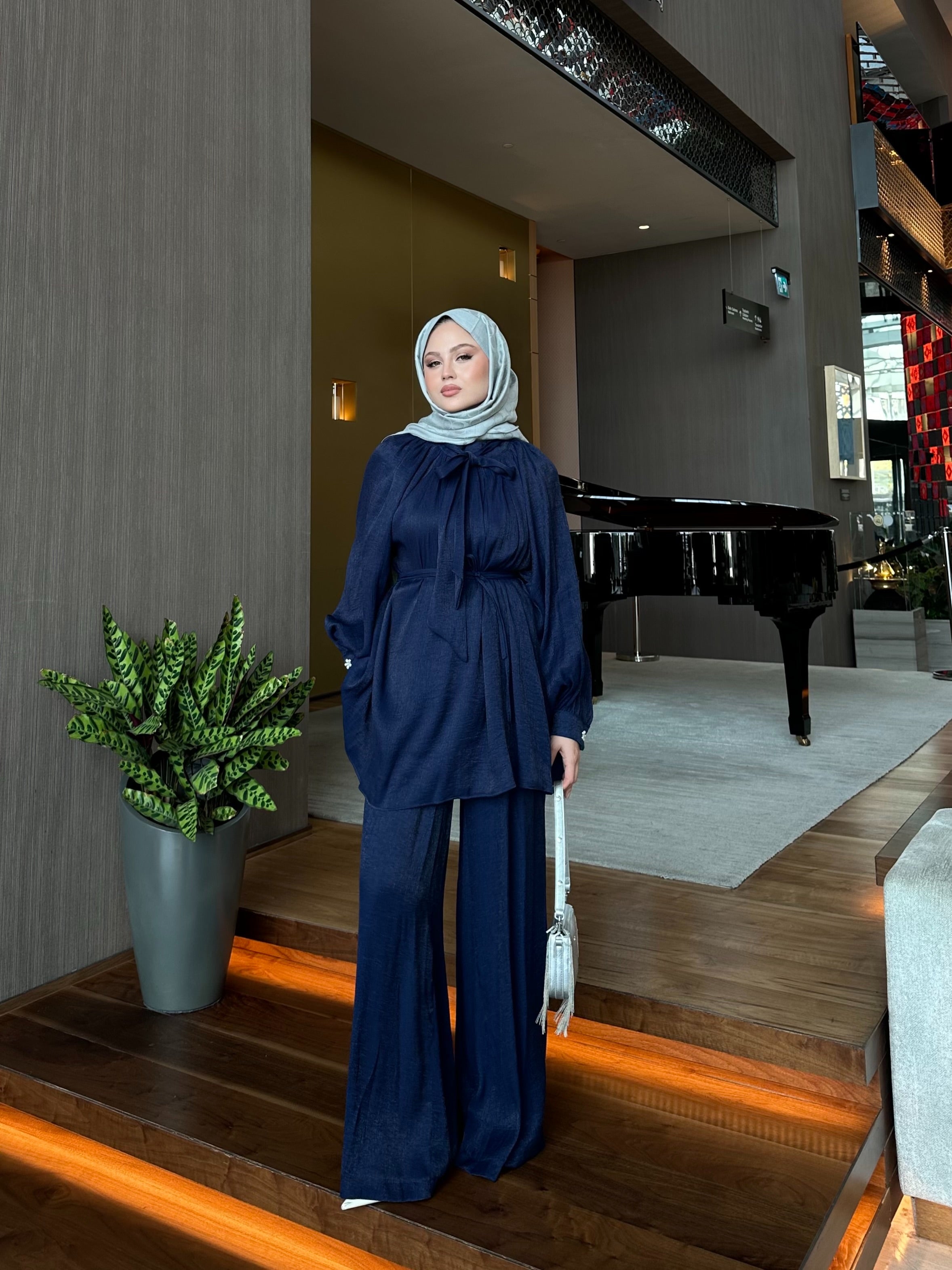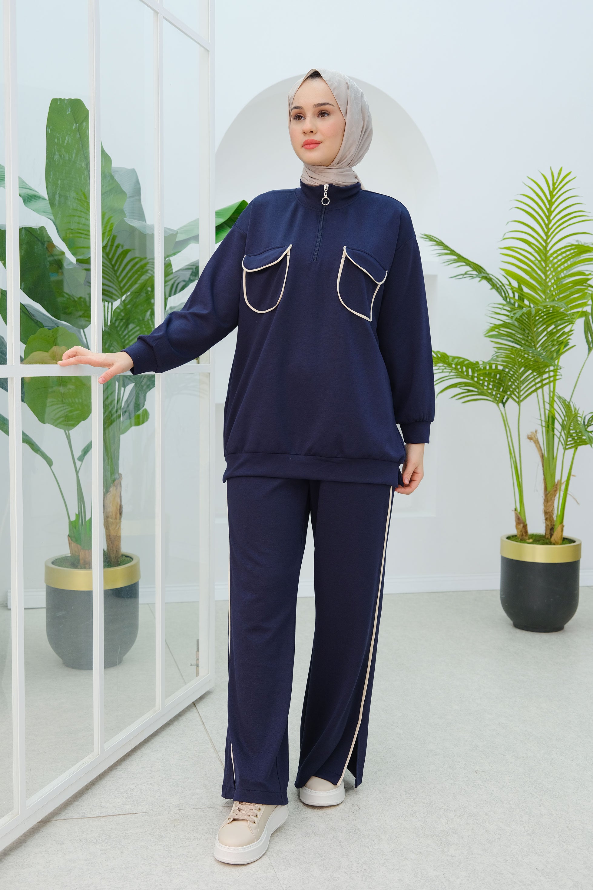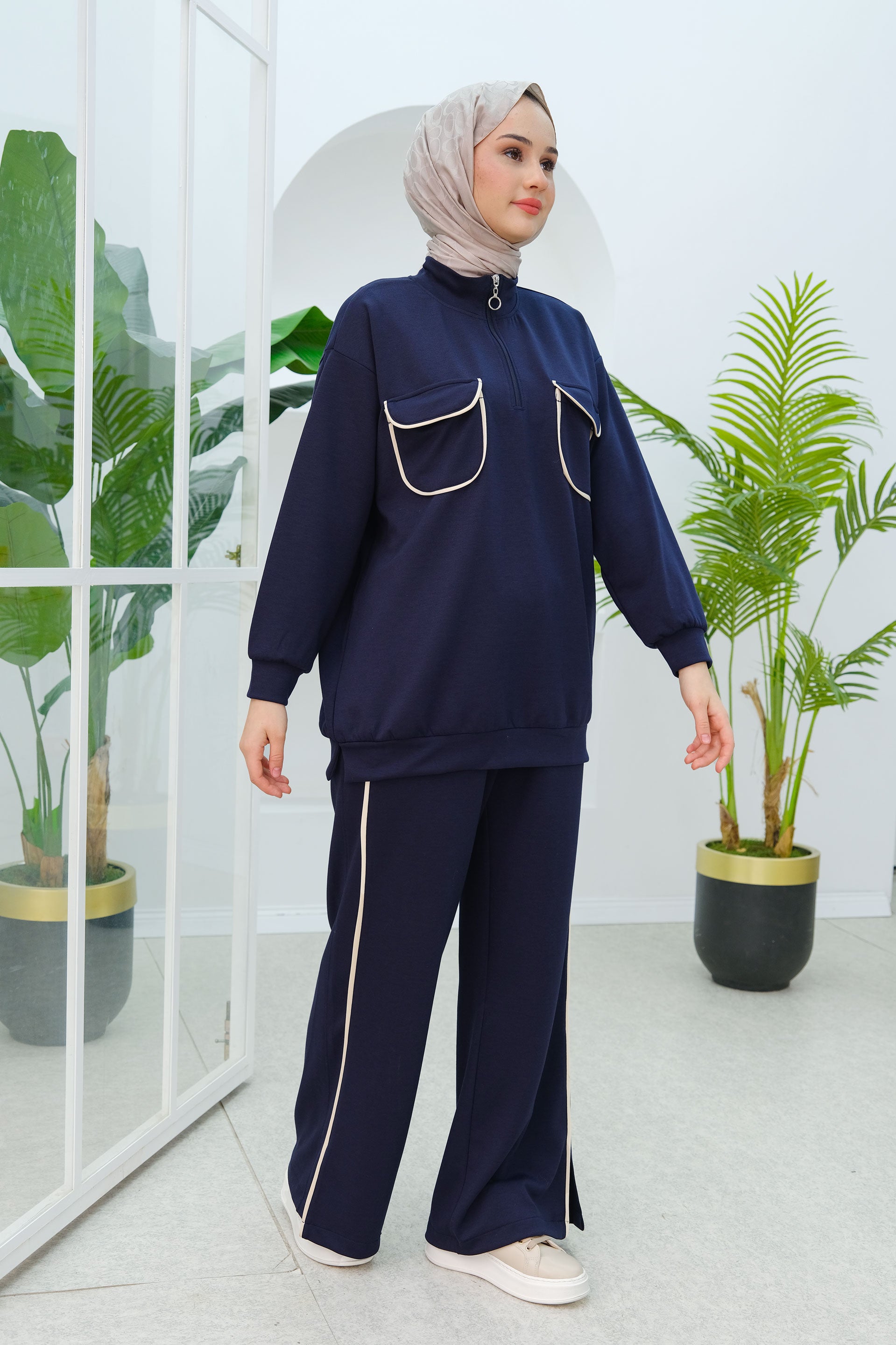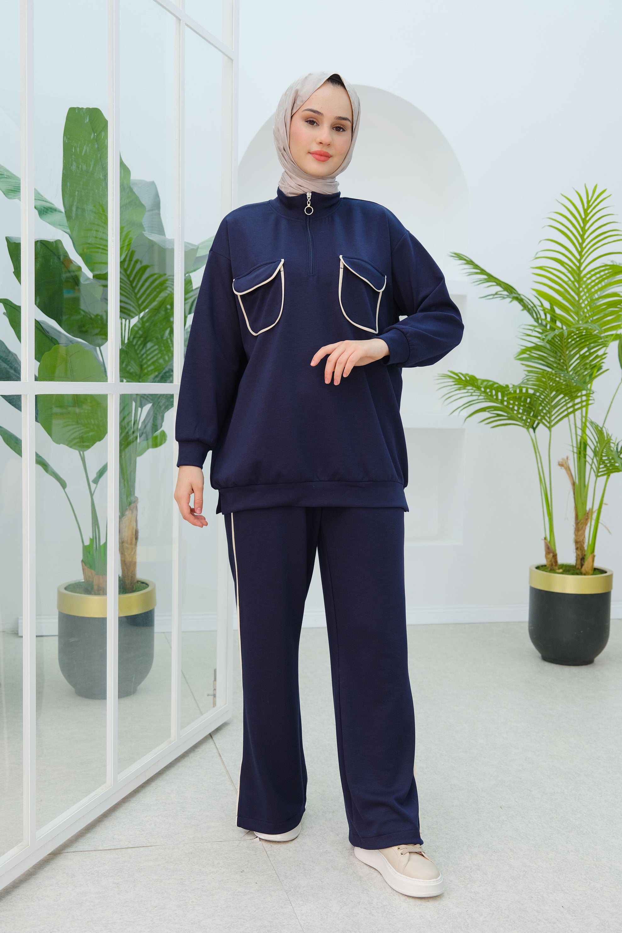 Navy Blue Two-Piece Set with Double Pocket Detail on the Front