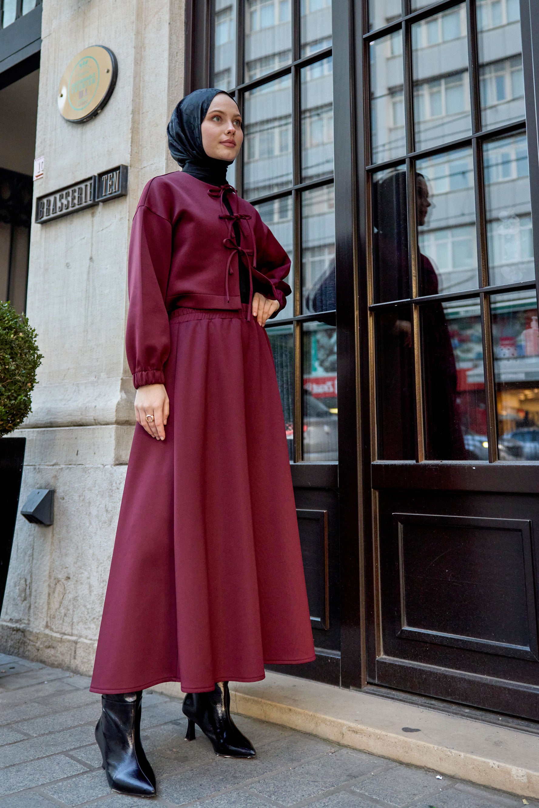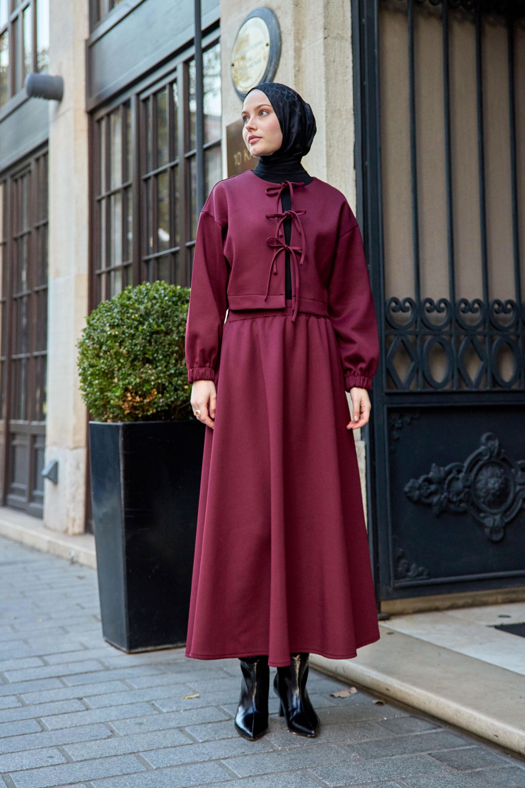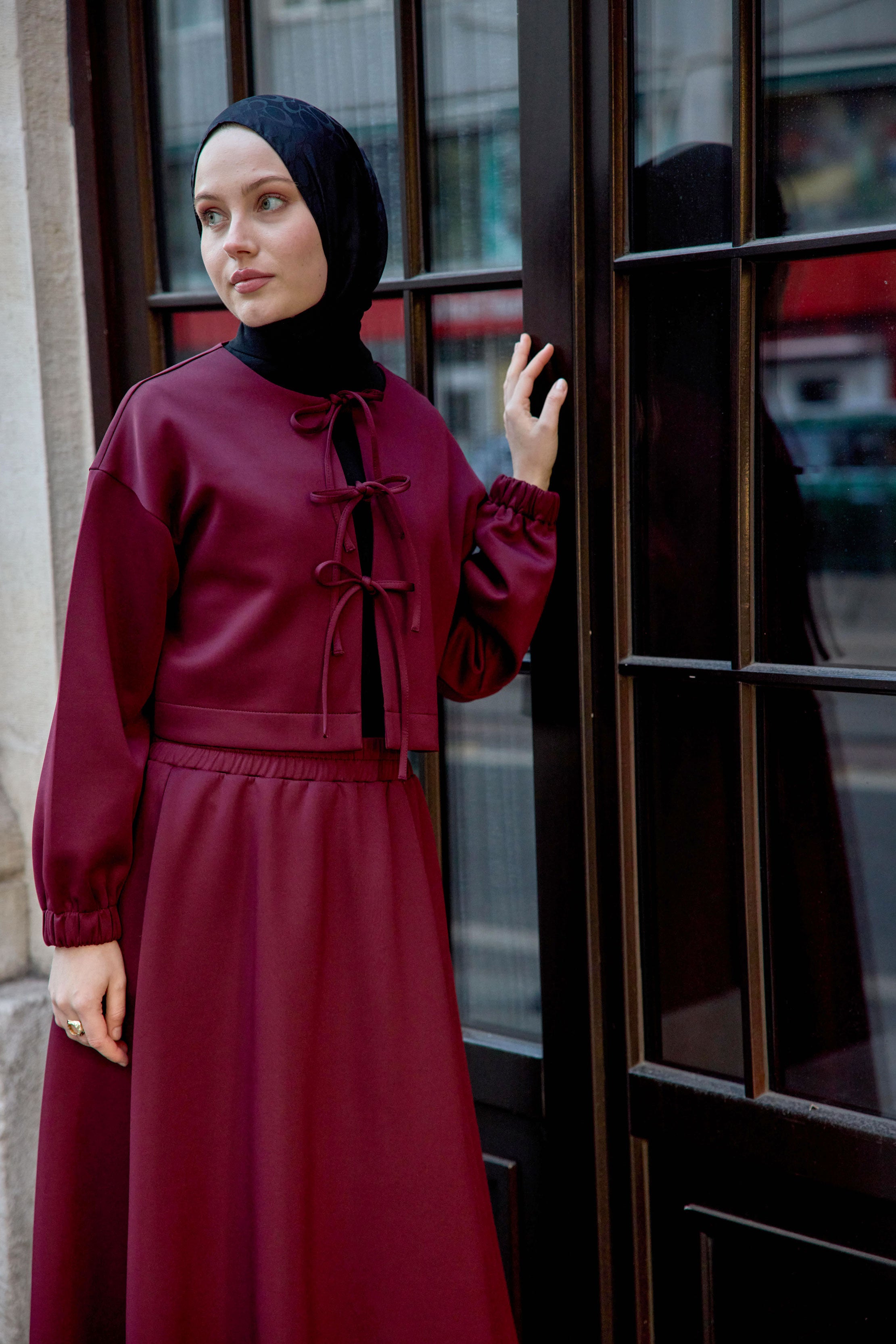 Front Tied Skirt Set Burgundy