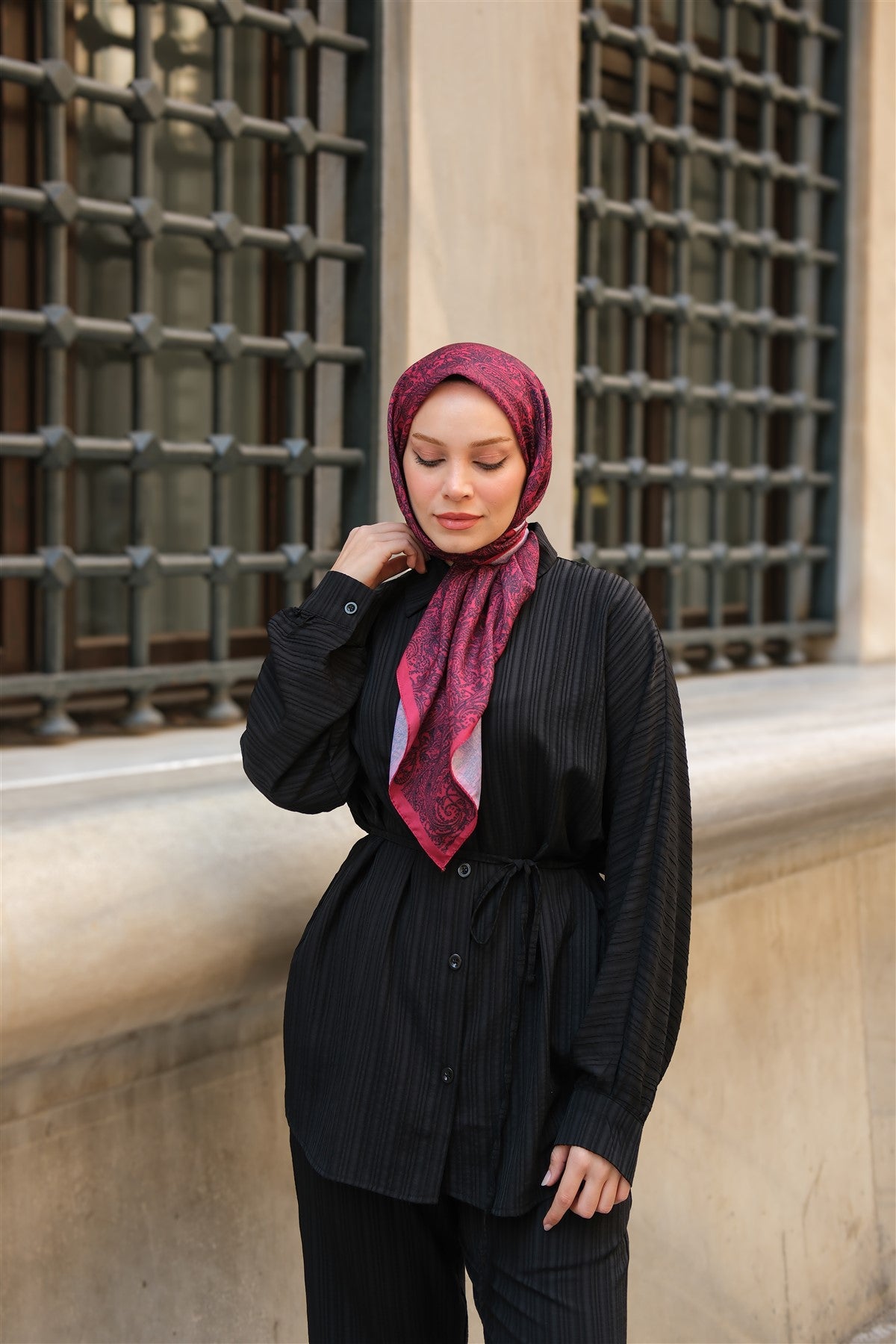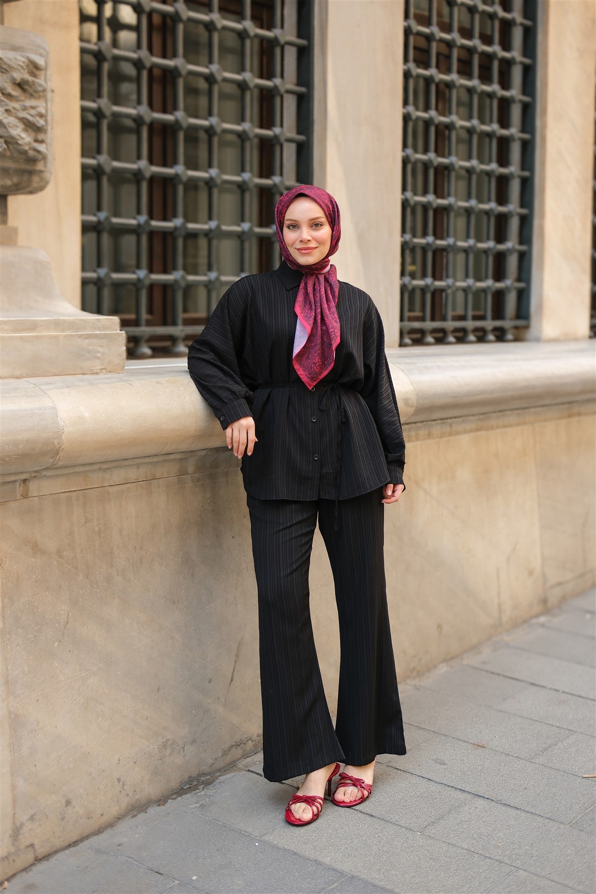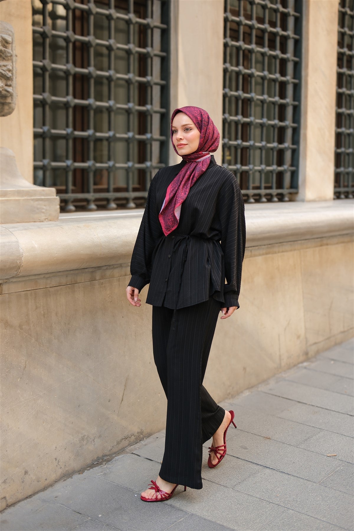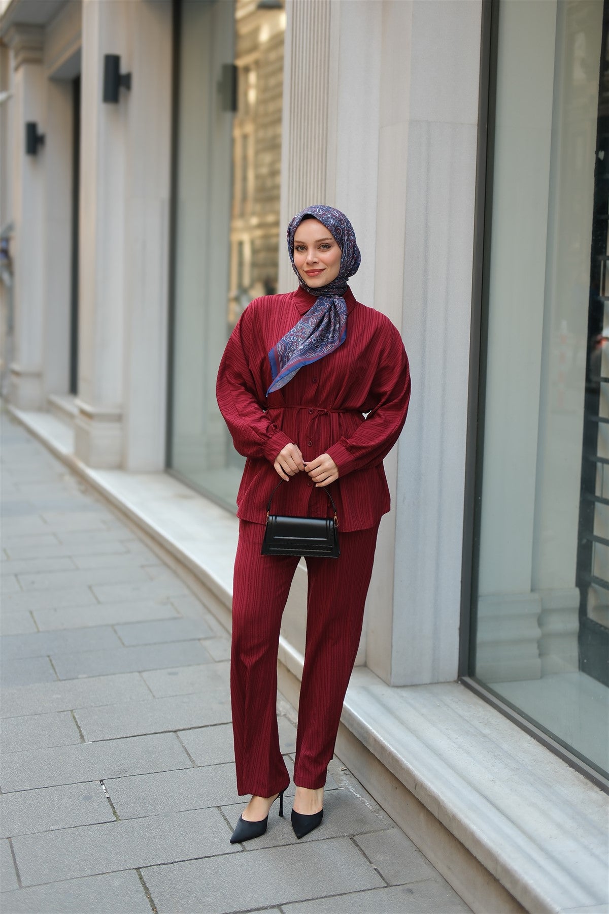Crinkle-Fabric Waist-Tied Suit - Burgundy