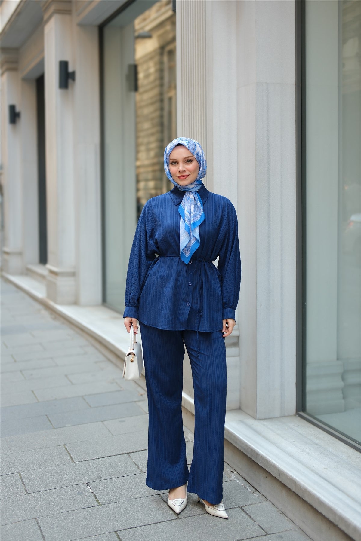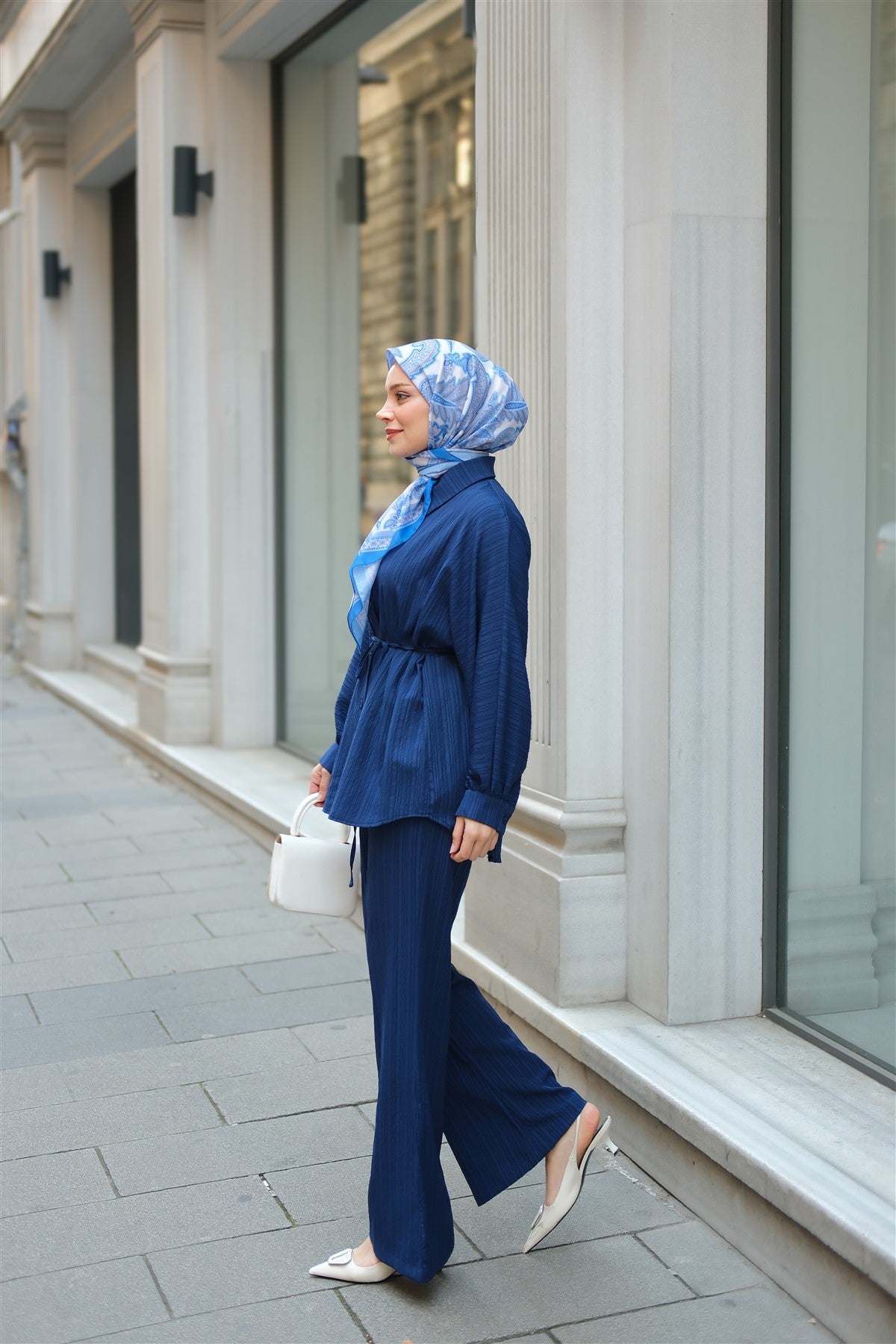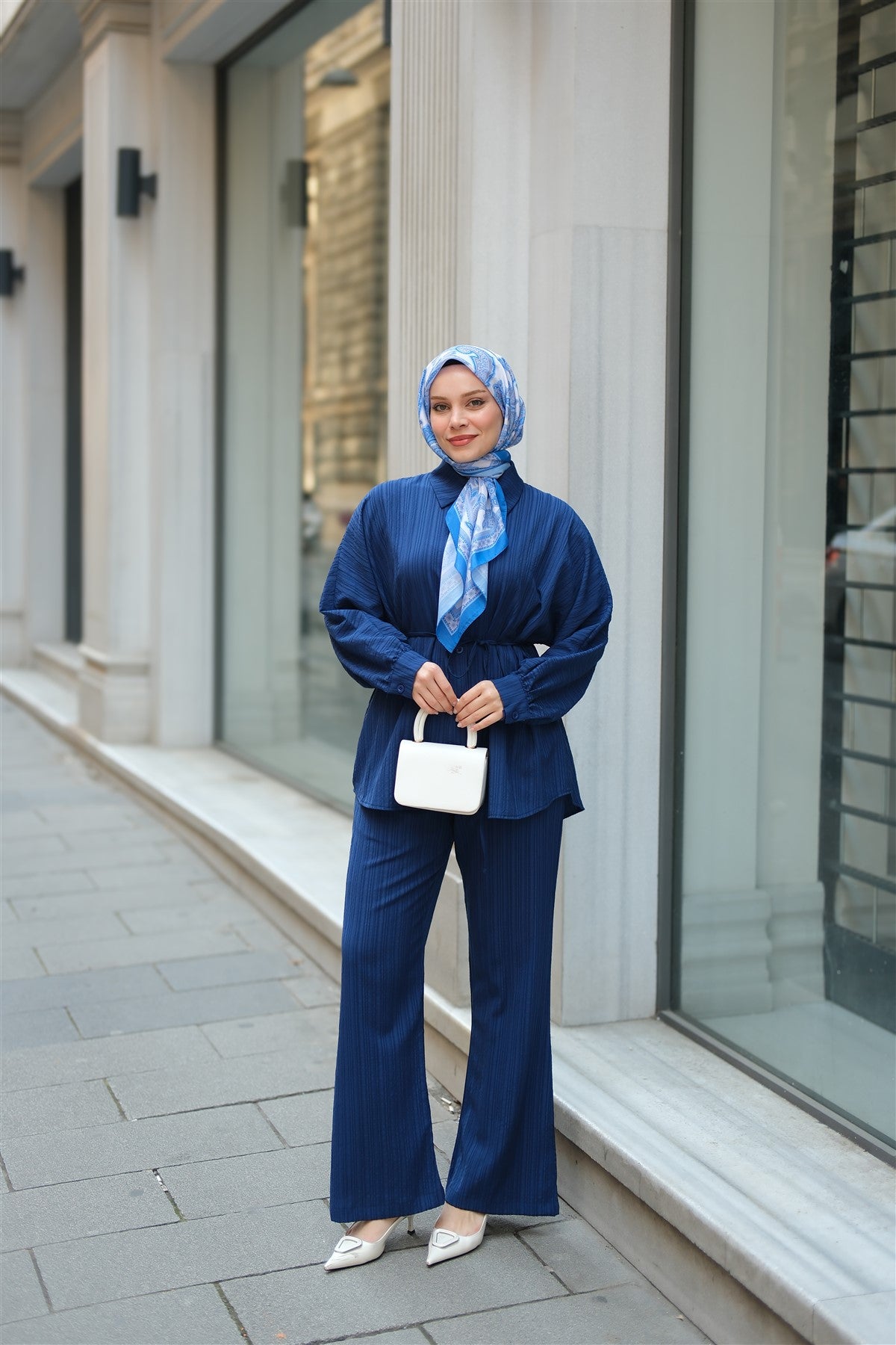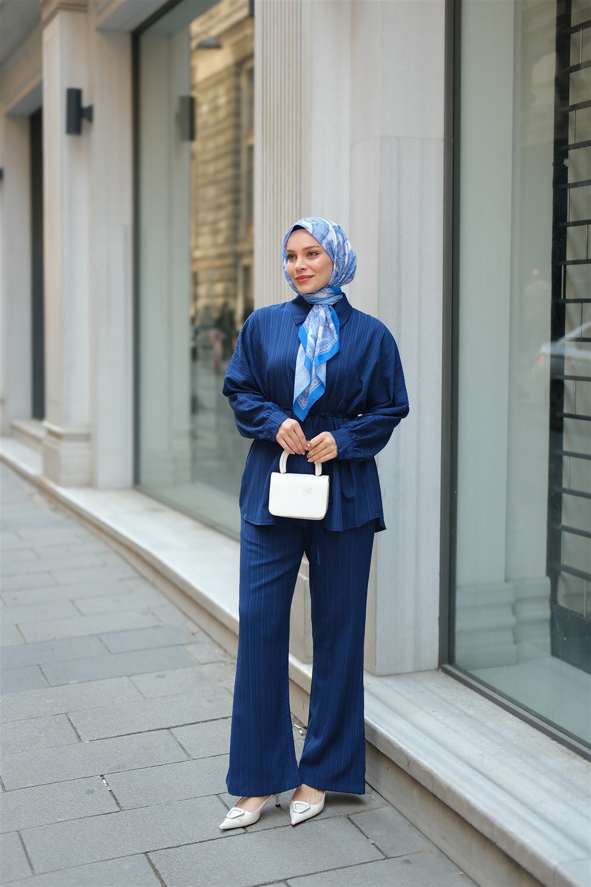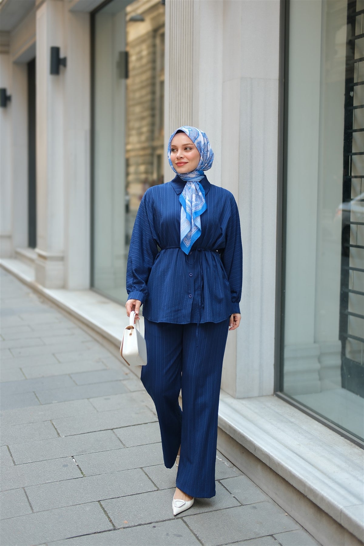 Crinkle Fabric Waist Tied Set Navy Blue