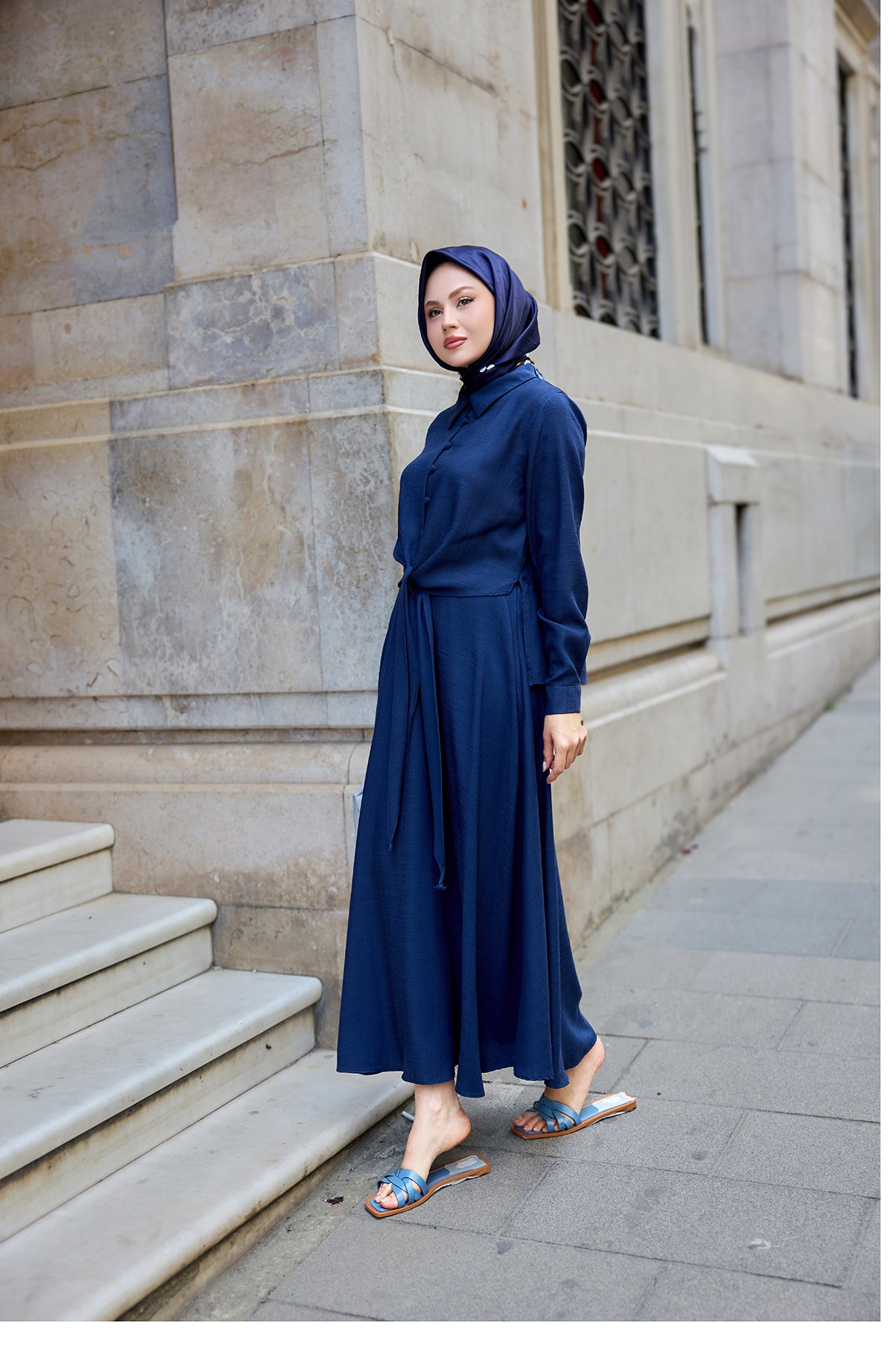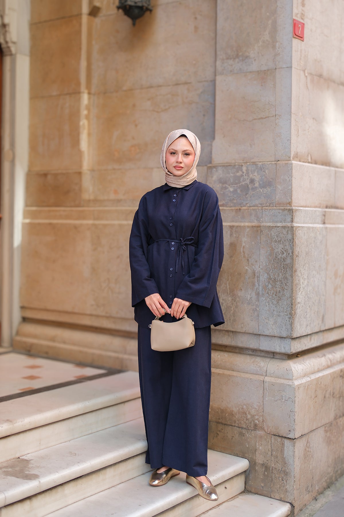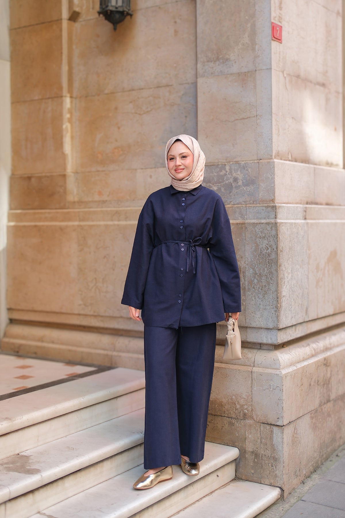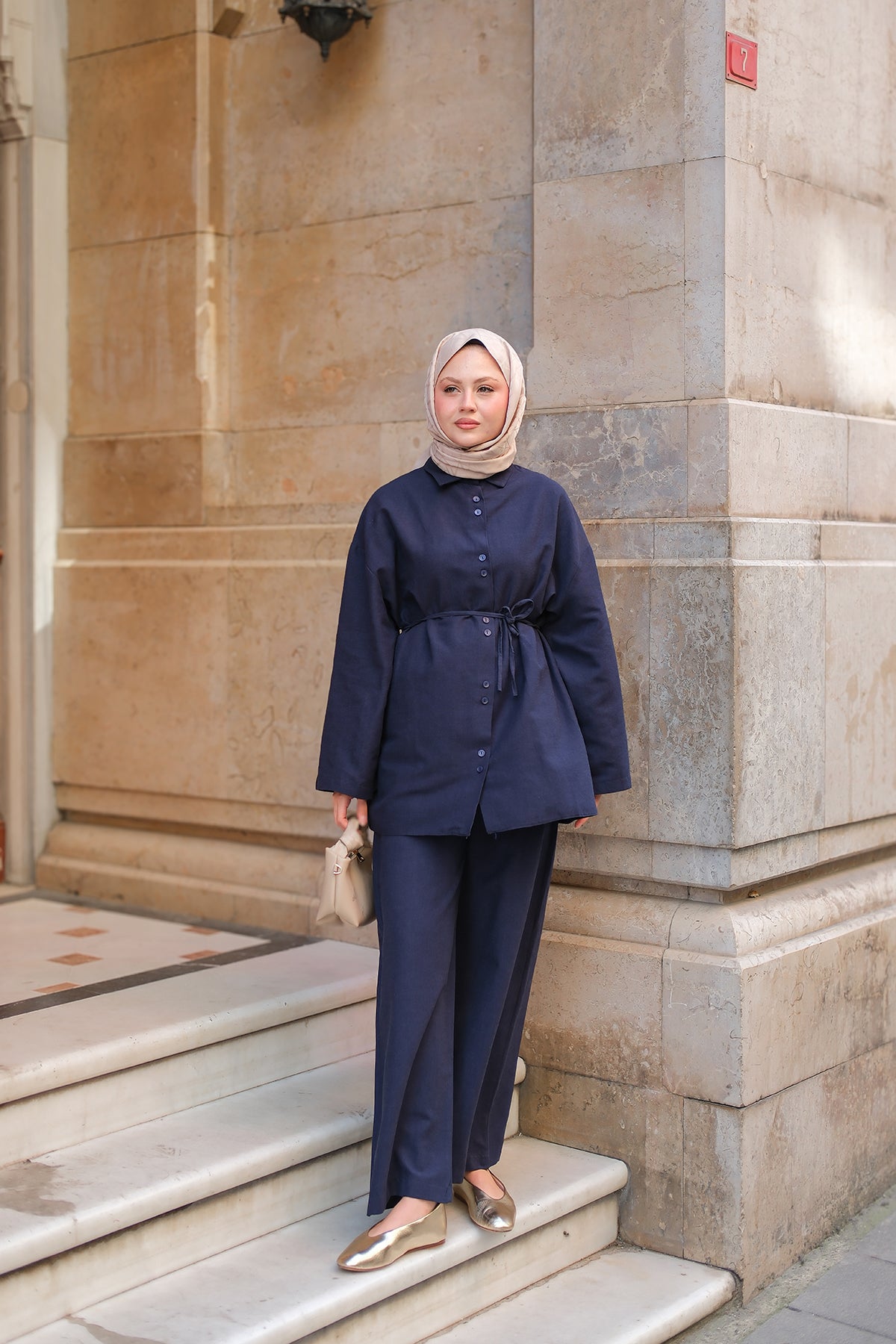 Shirt-Tied Linen Suit - Navy Blue