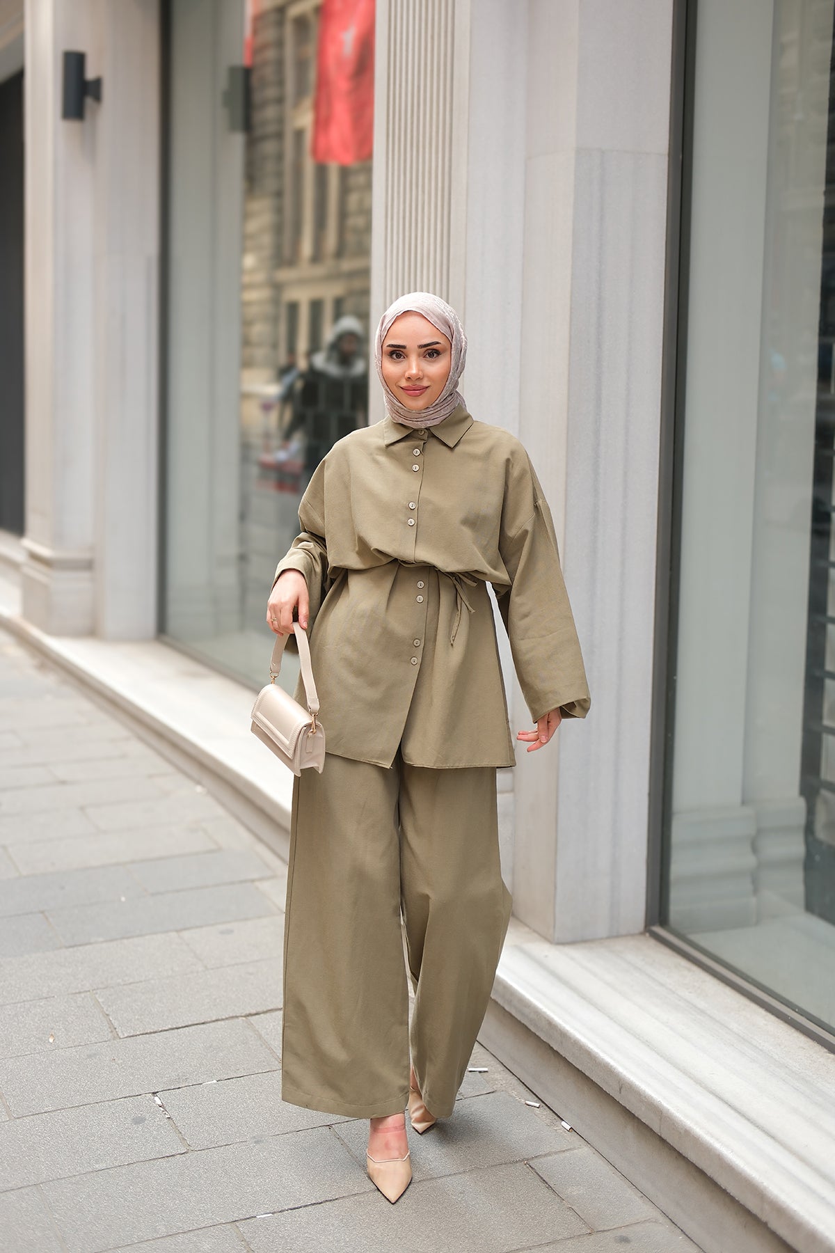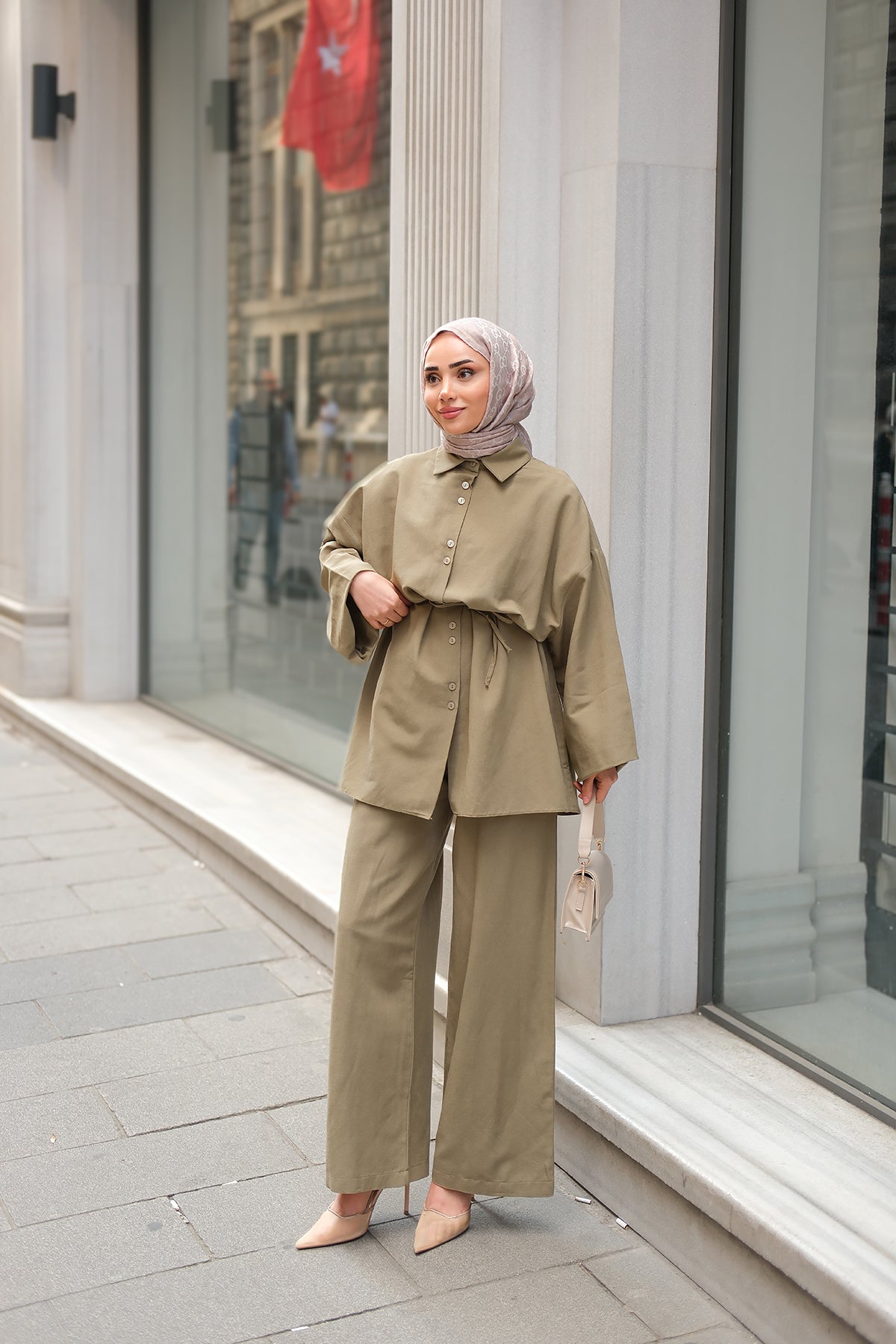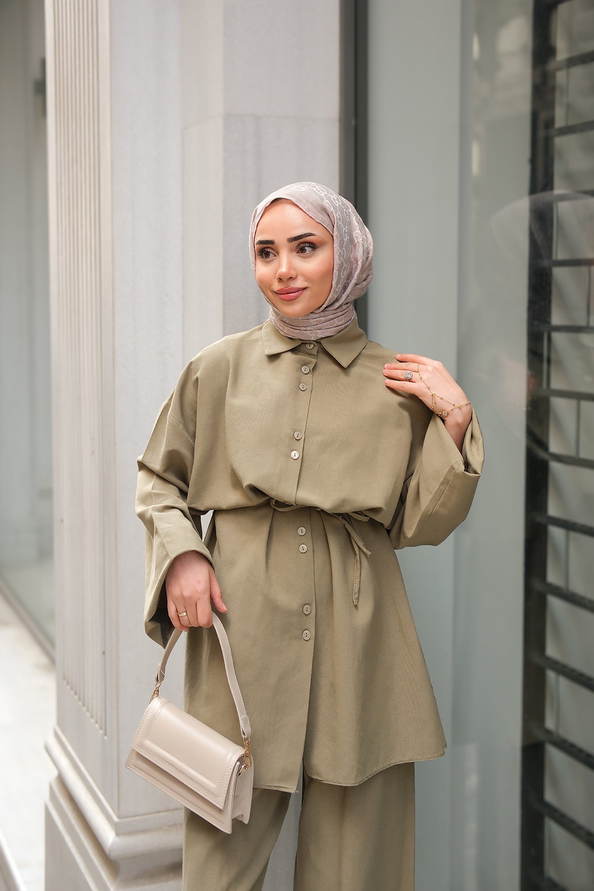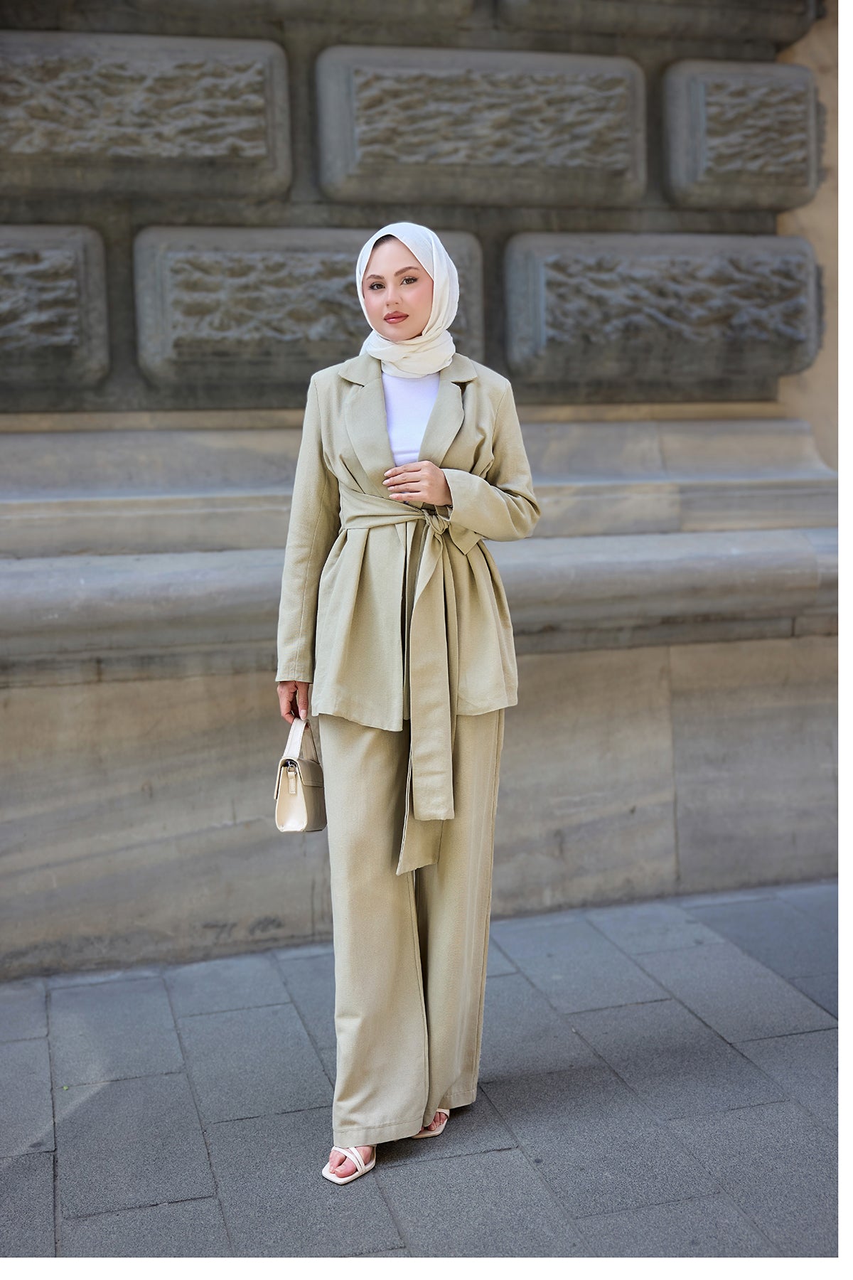 Shirt-Tied Linen Suit Cream