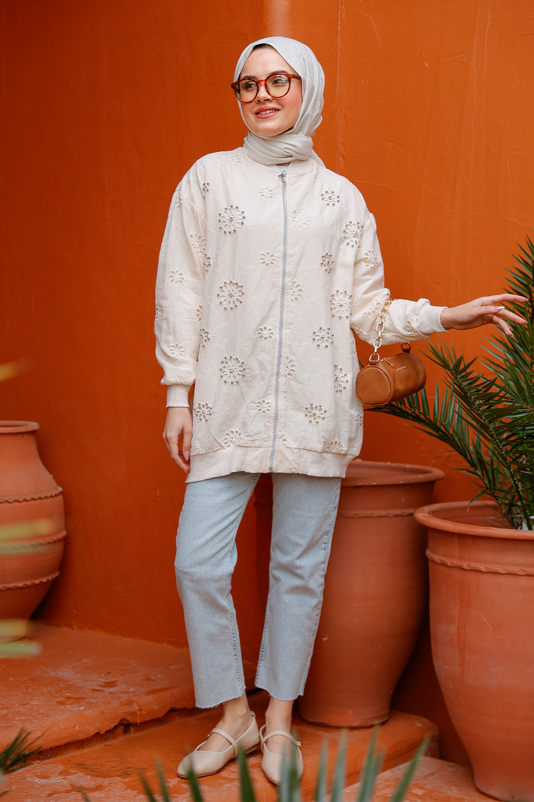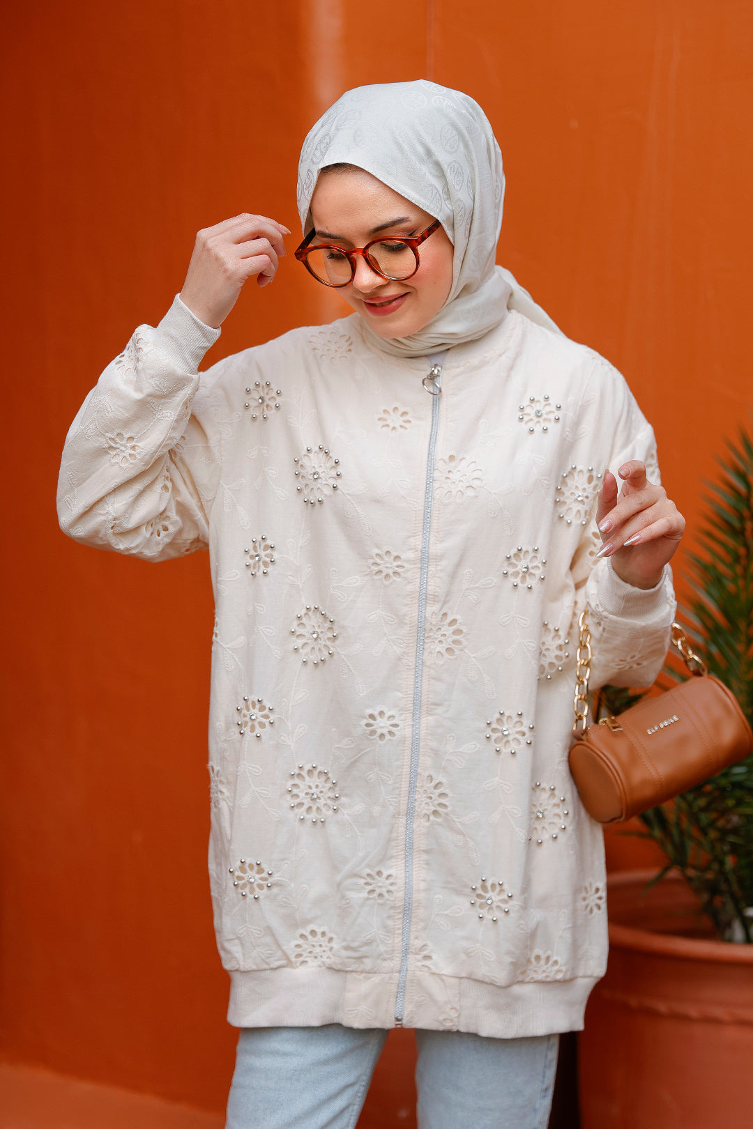 Cream Cardigan with Stone Embroidery and Brocade Details