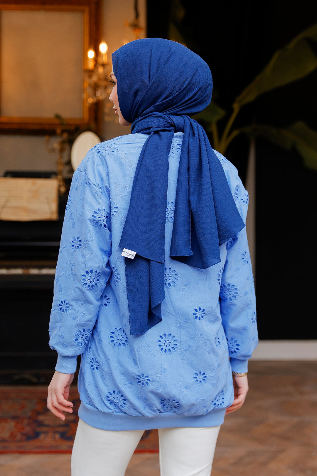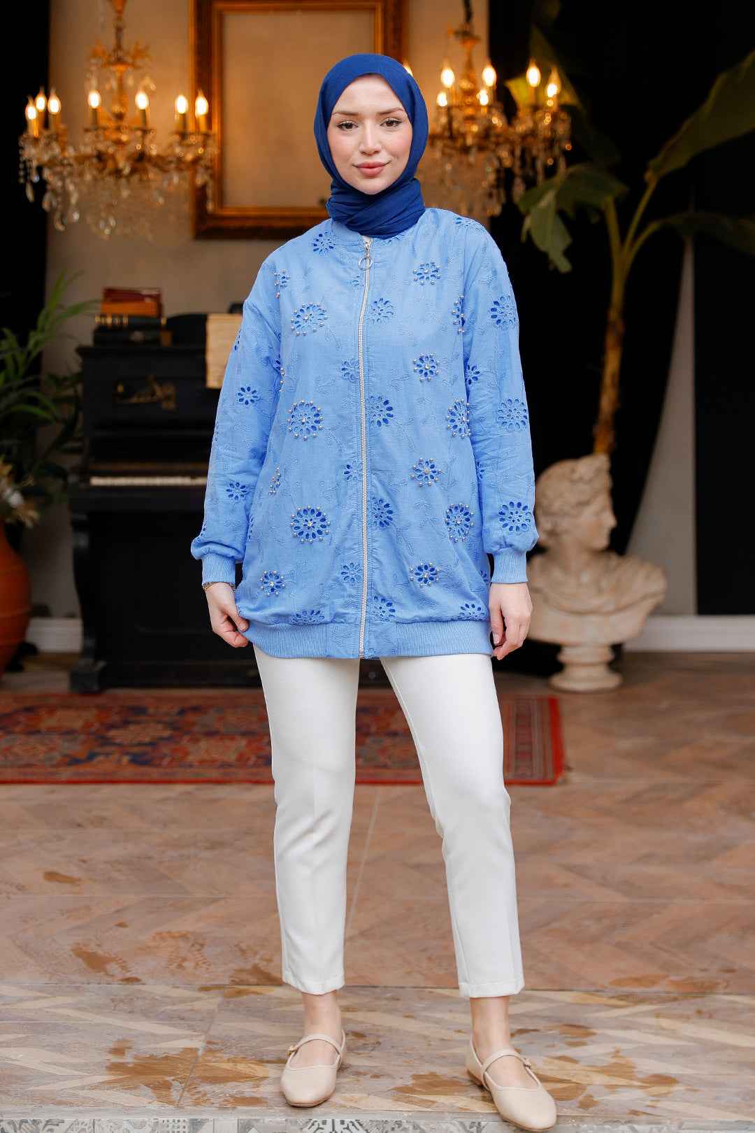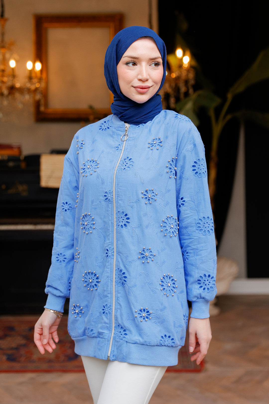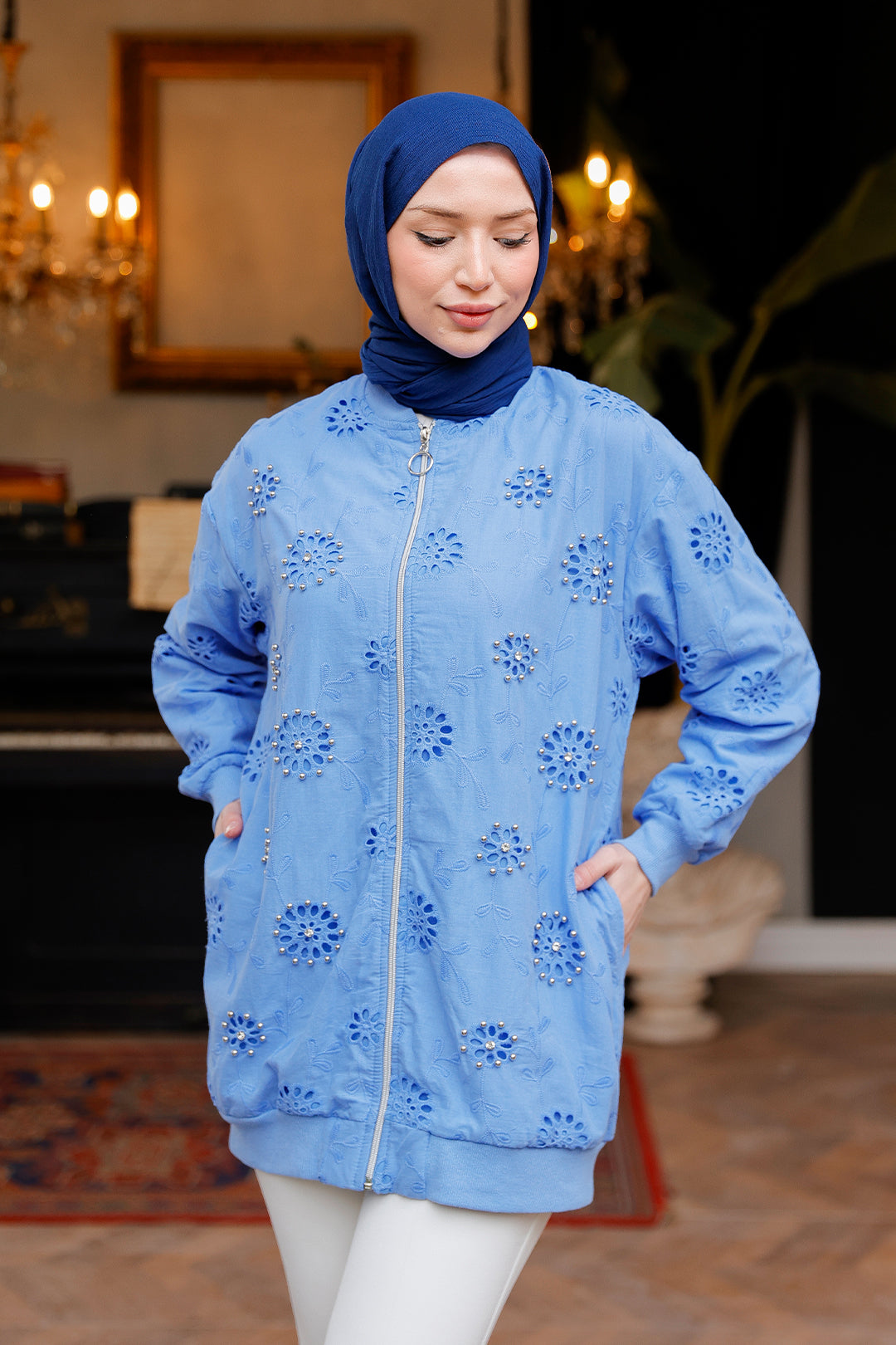 Blue Cardigan with Stone Embroidery and Brocade Details