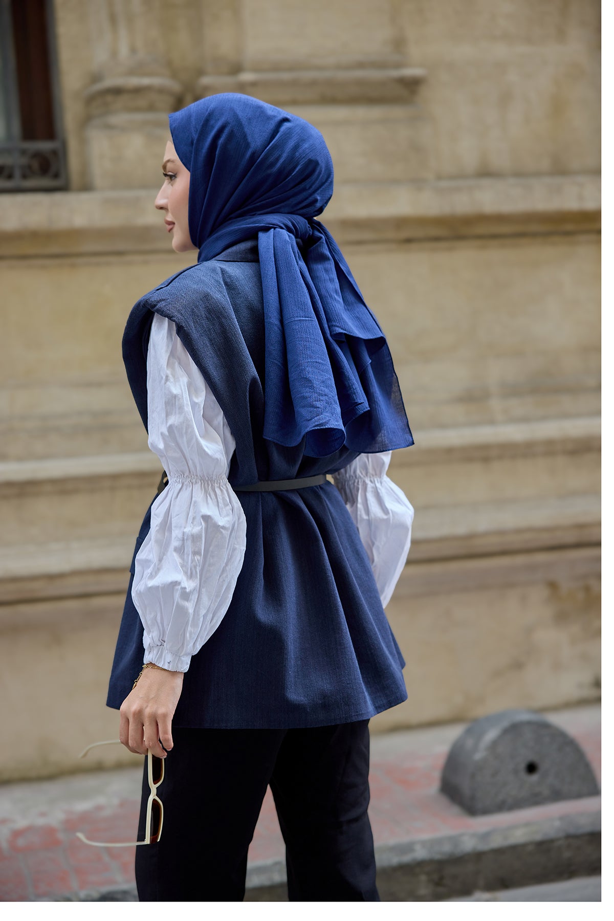 Shoulders With Padding Detail Linen Vest Navy