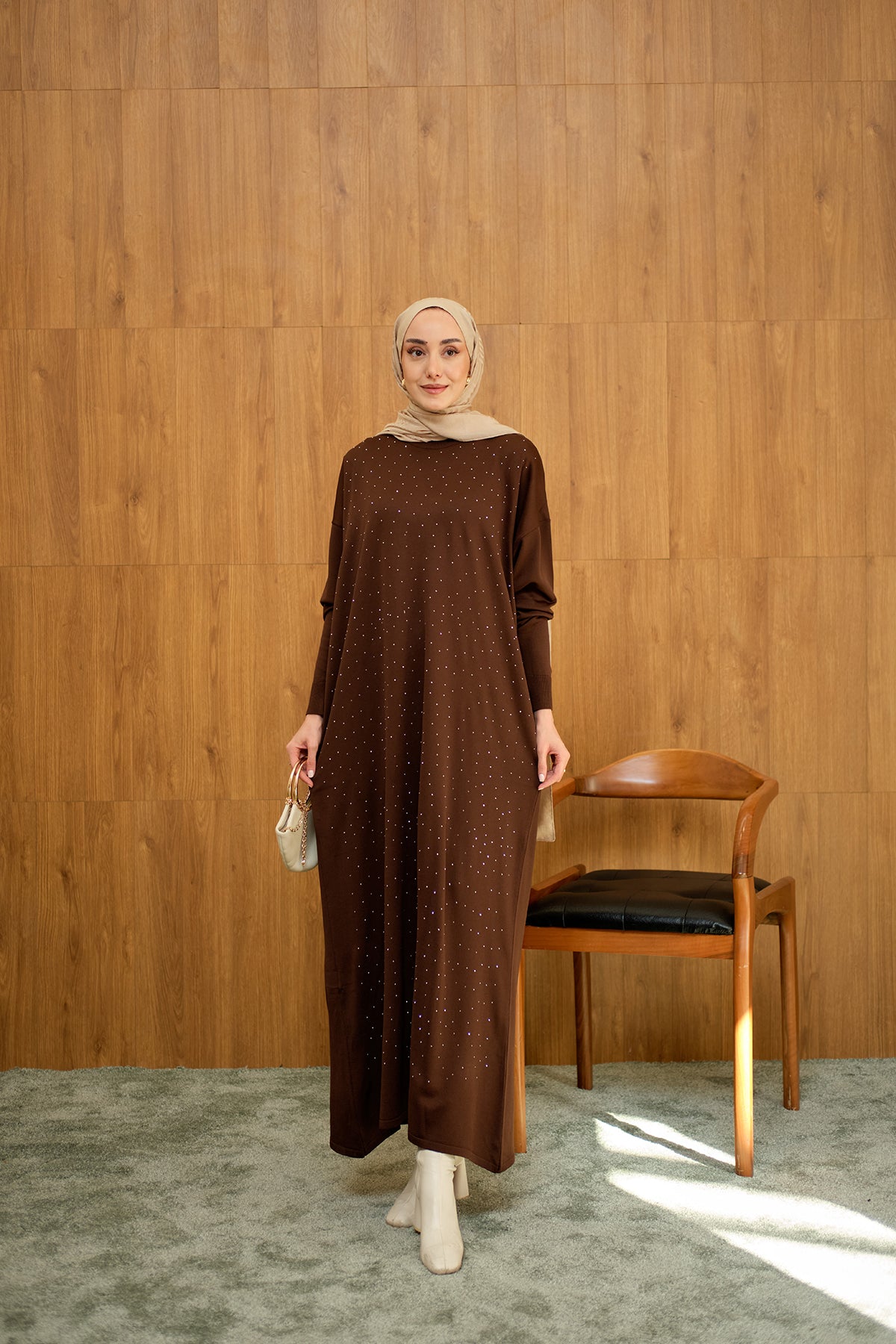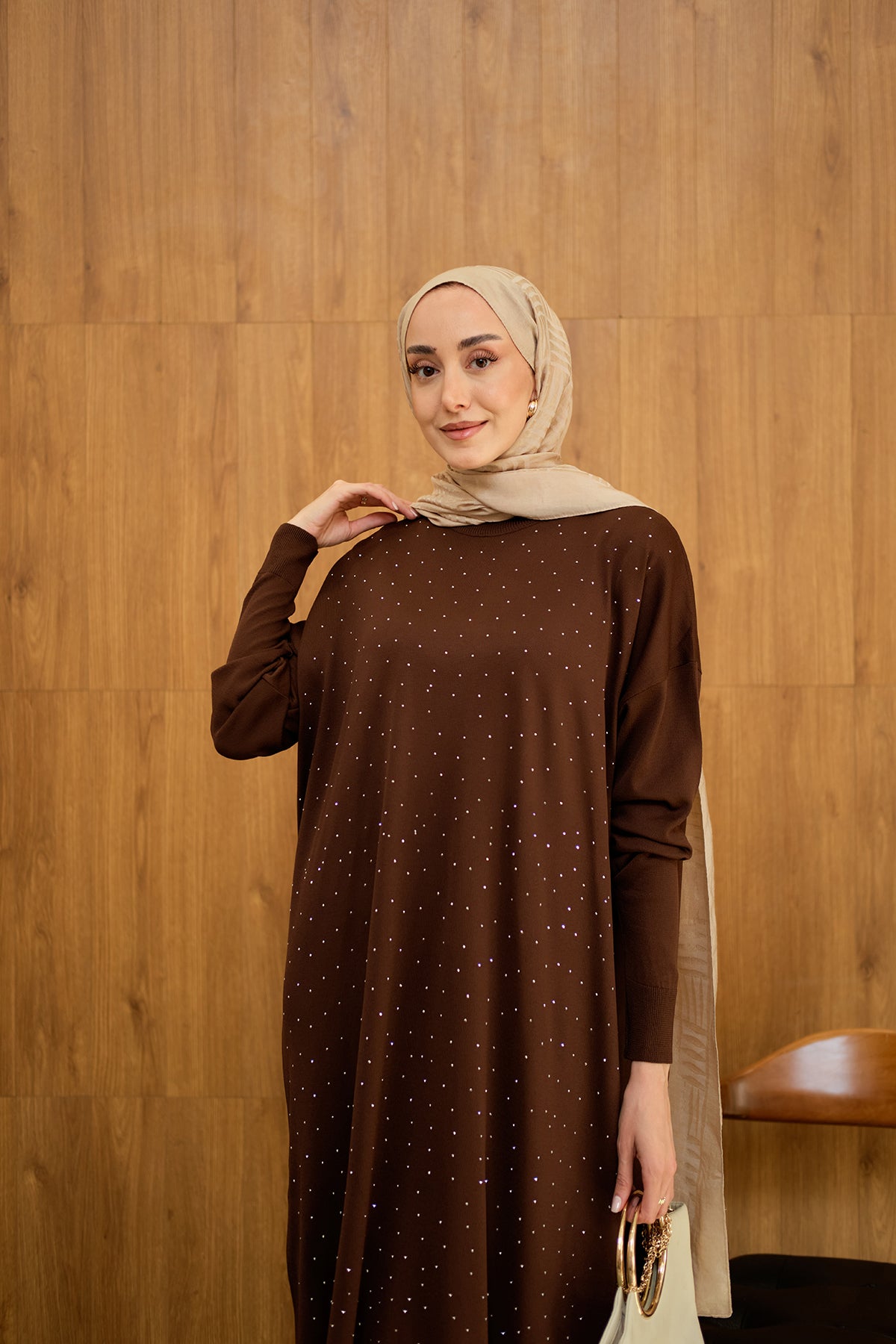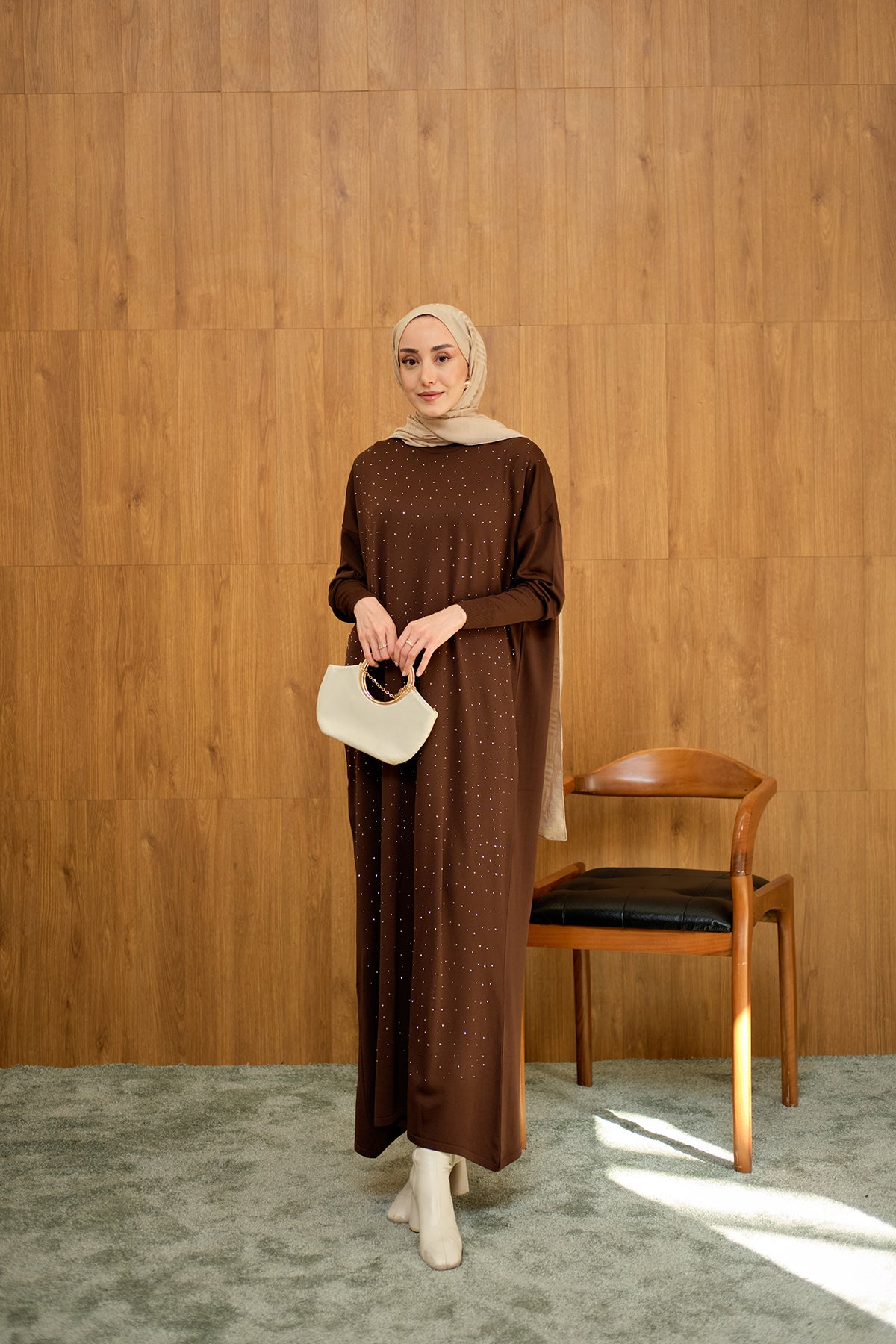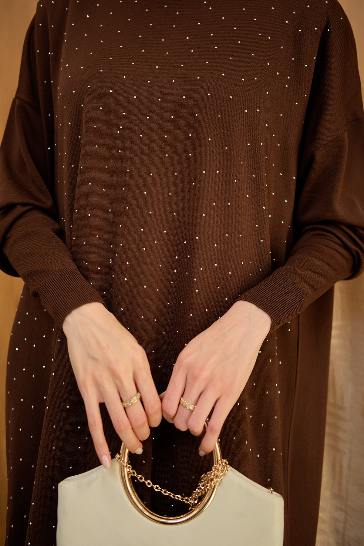 Bel Bağlamalı Taş Detay Triko Elbise Kahverengi