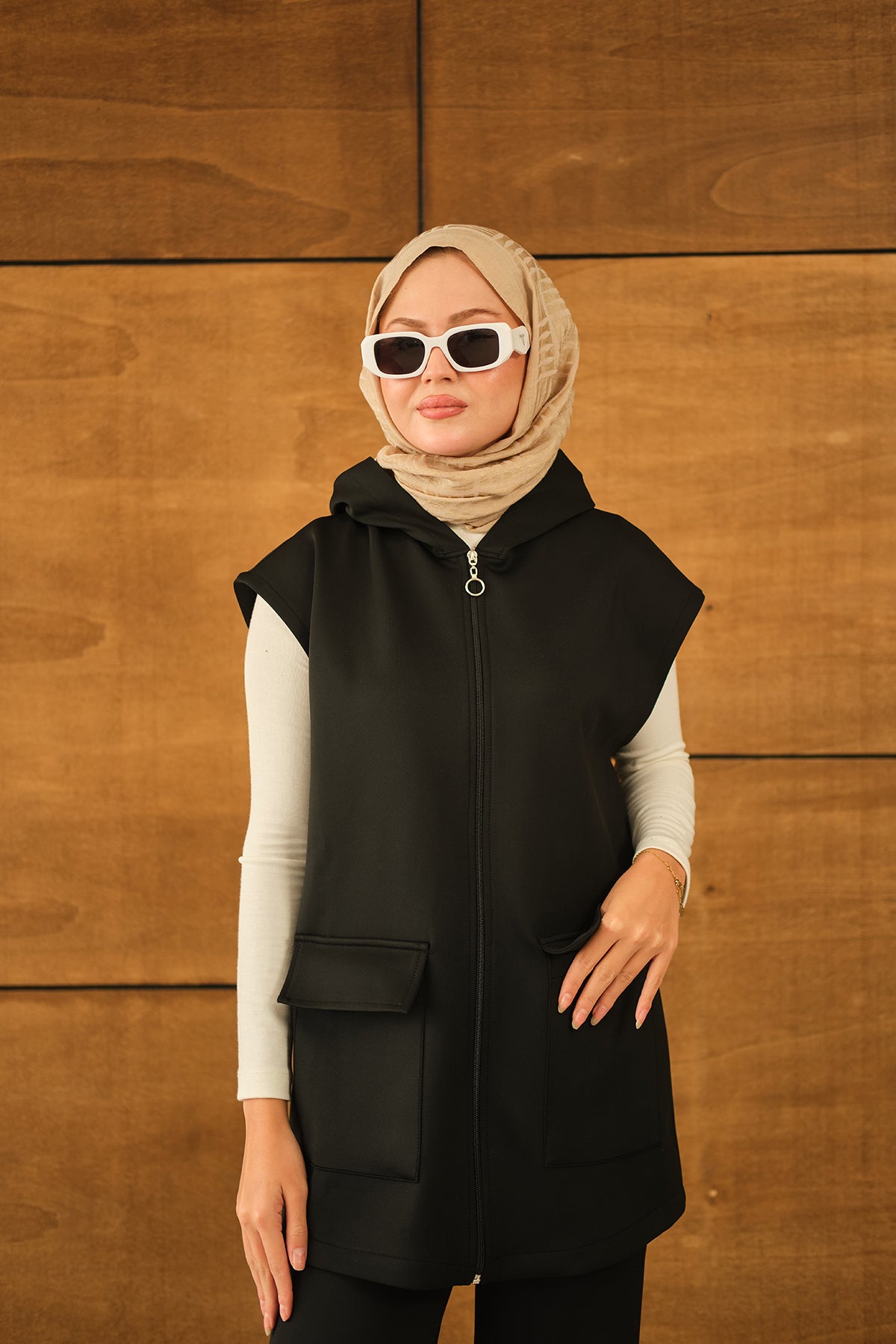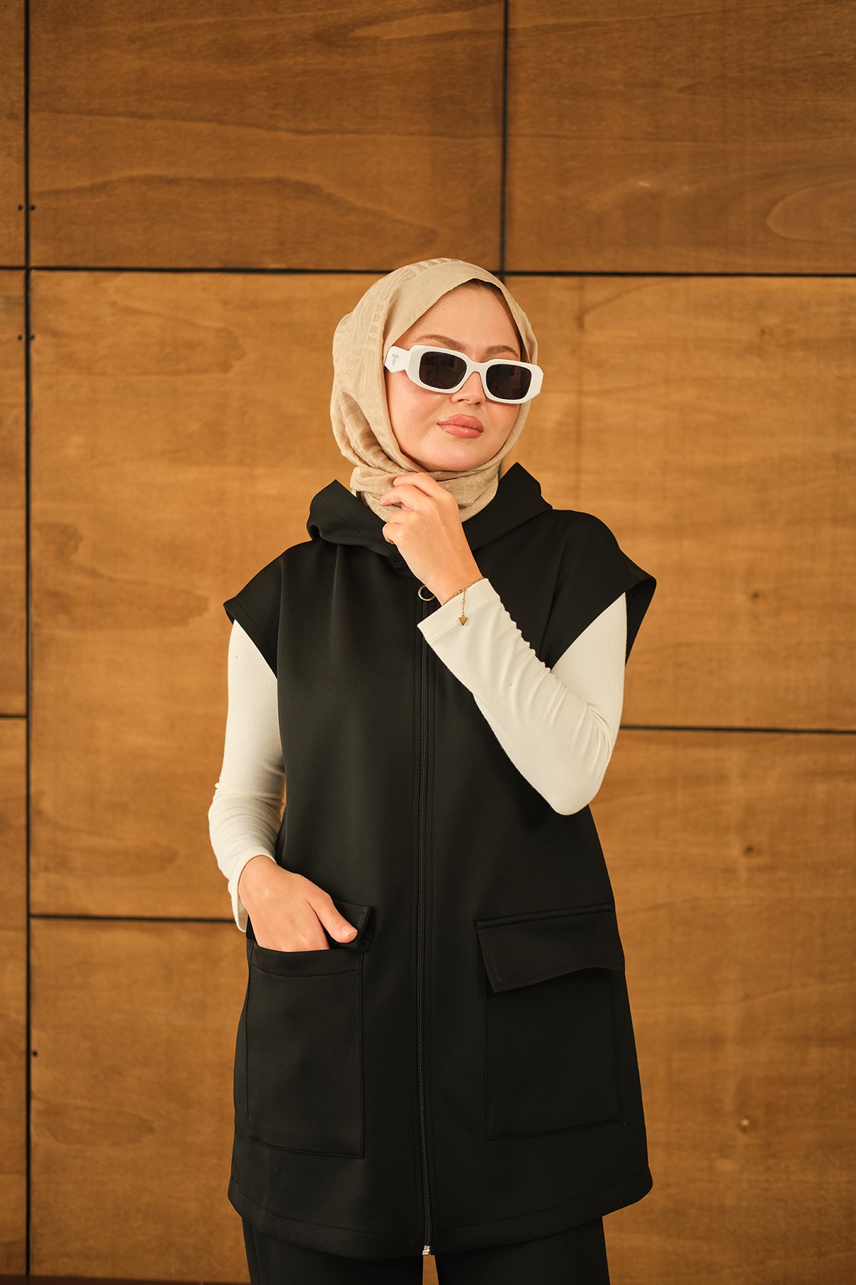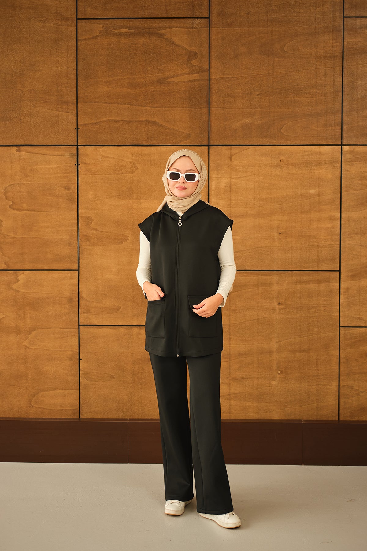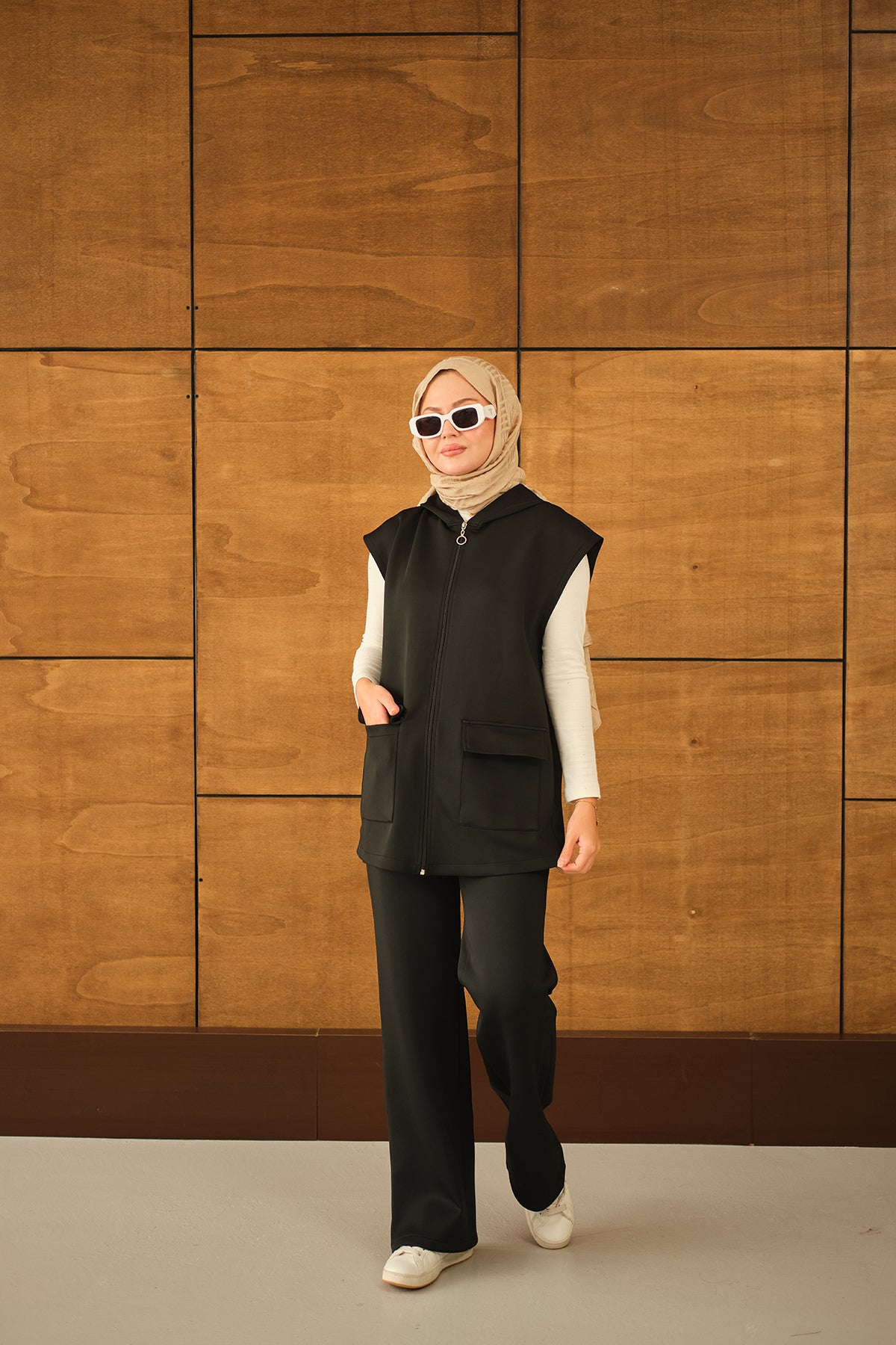 Çift Cepli Kapüşonlu Yelekli Takım Siyah