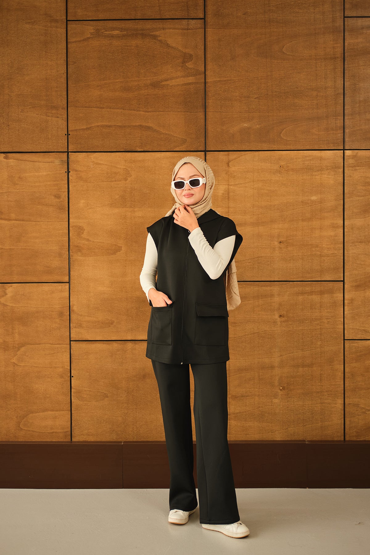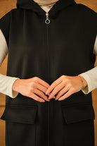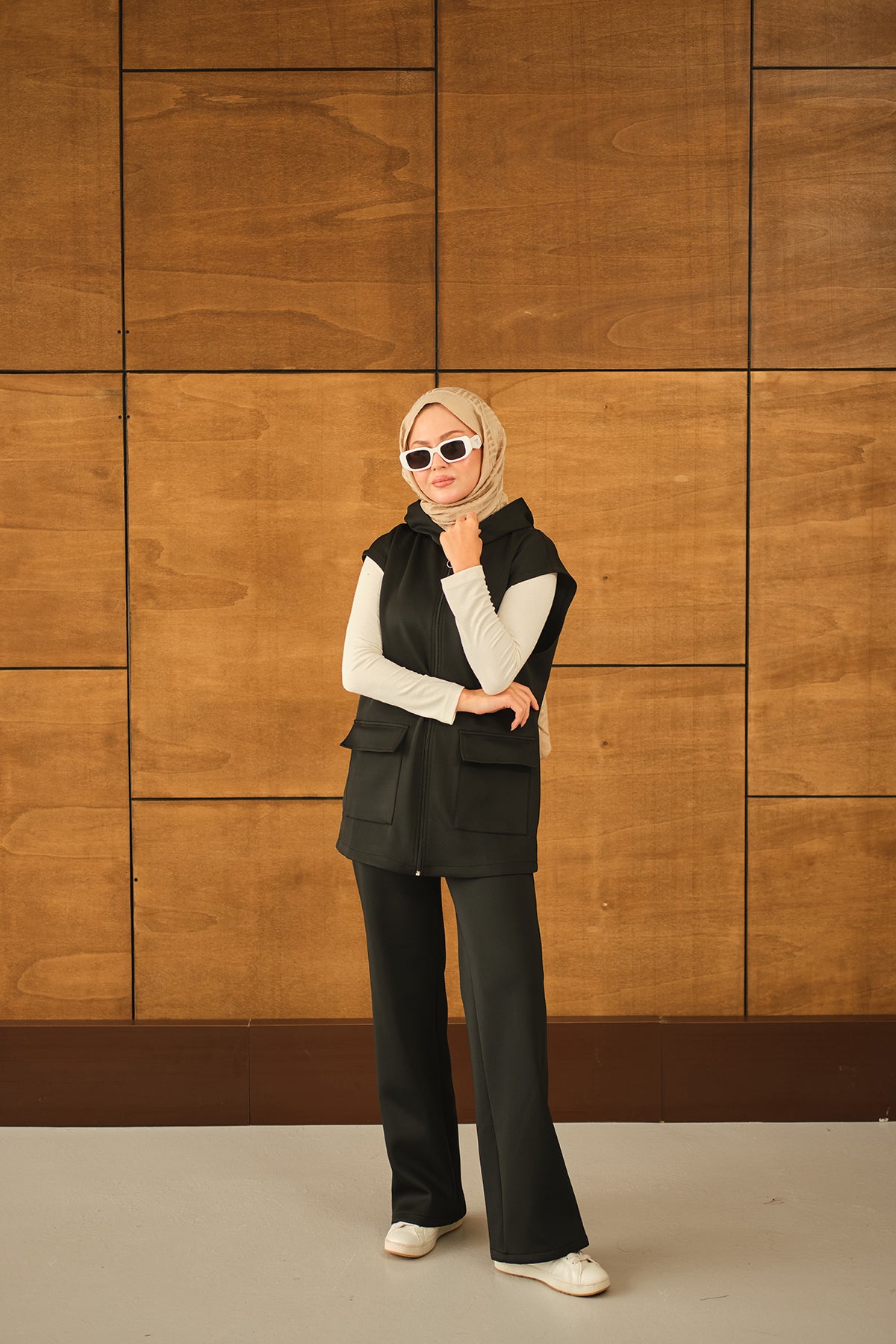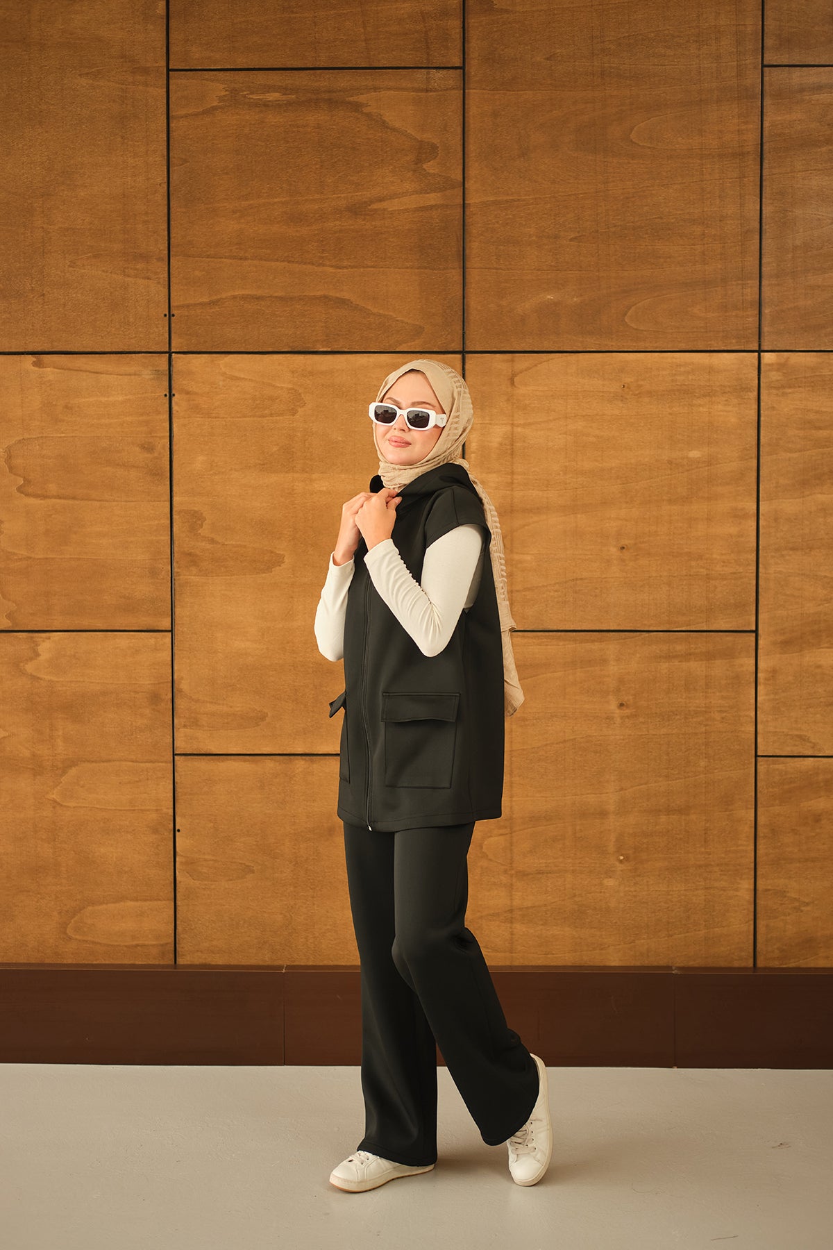 Çift Cepli Kapüşonlu Yelekli Takım Siyah